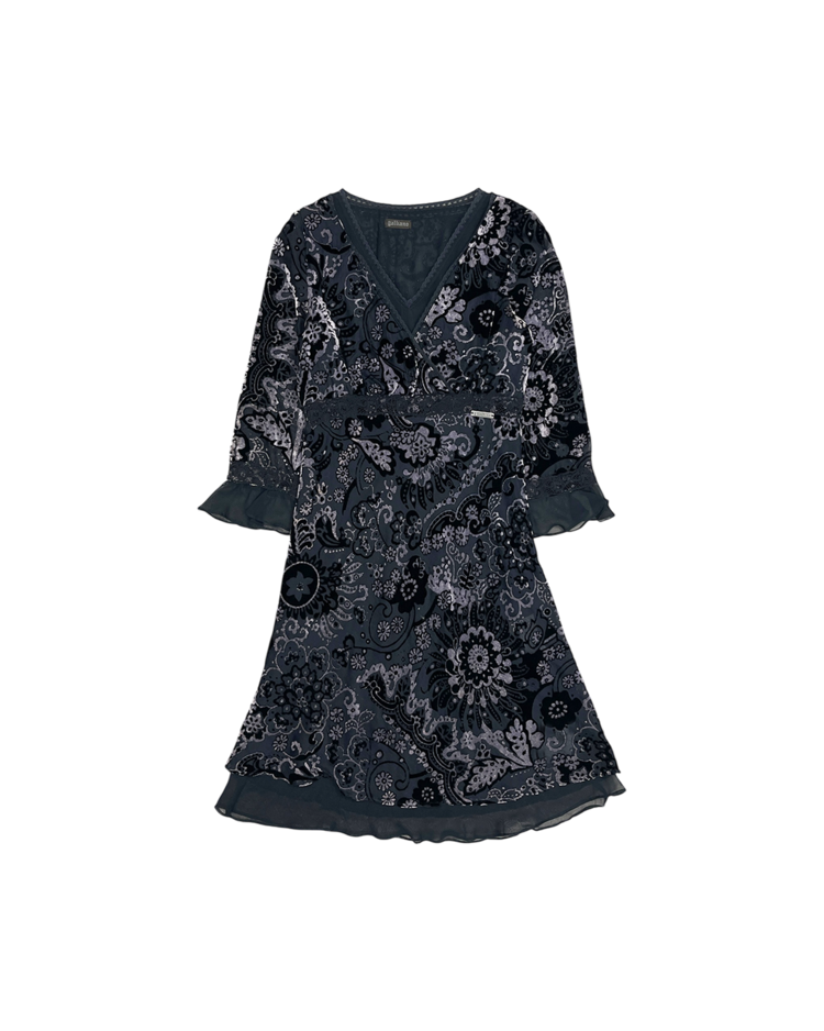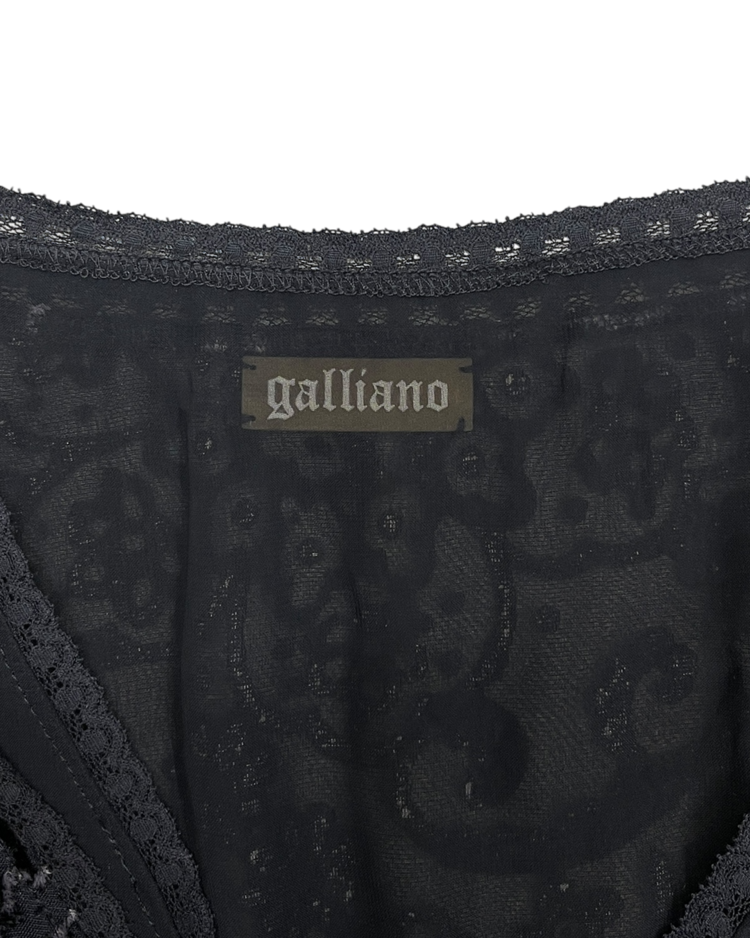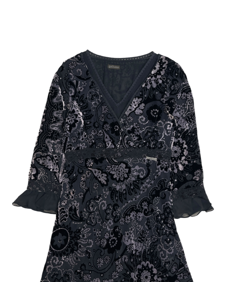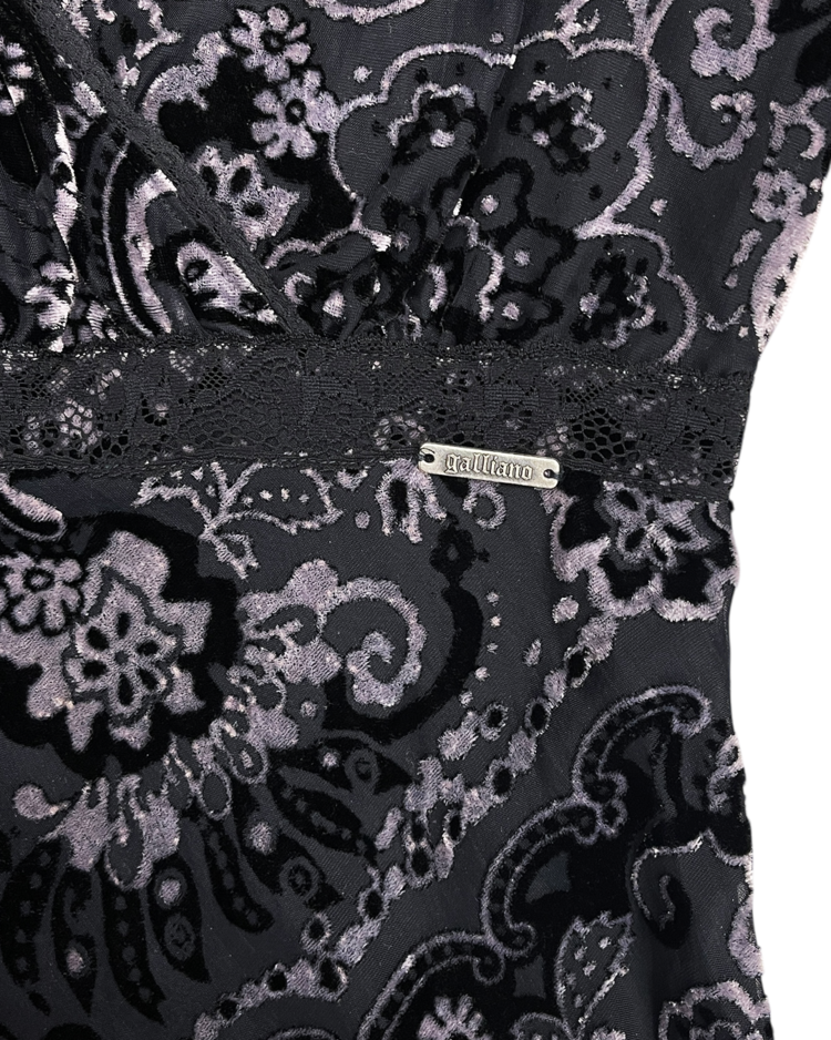극적인 실루엣과 스토리텔링이 녹아든 디자인으로 유명한 존 갈리아노의 세컨라인 갈리아노의 제품입니다. 벨벳과 레이스로 이루어진 디테일이 존 갈리아노 특유의 화려함을 극대화합니다.