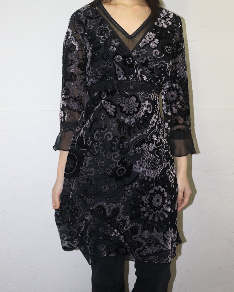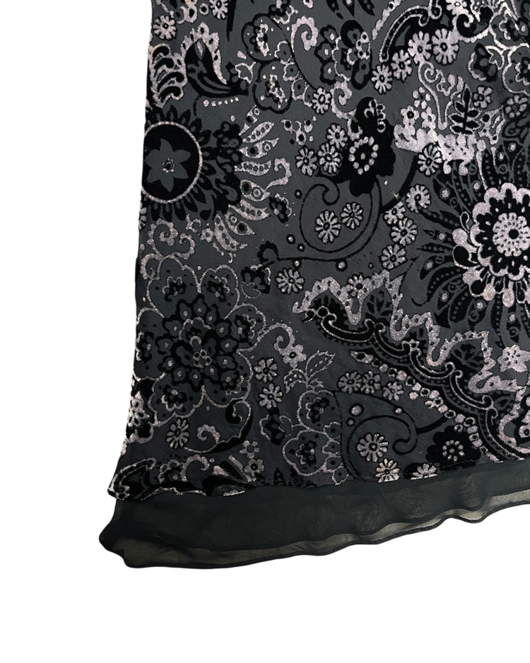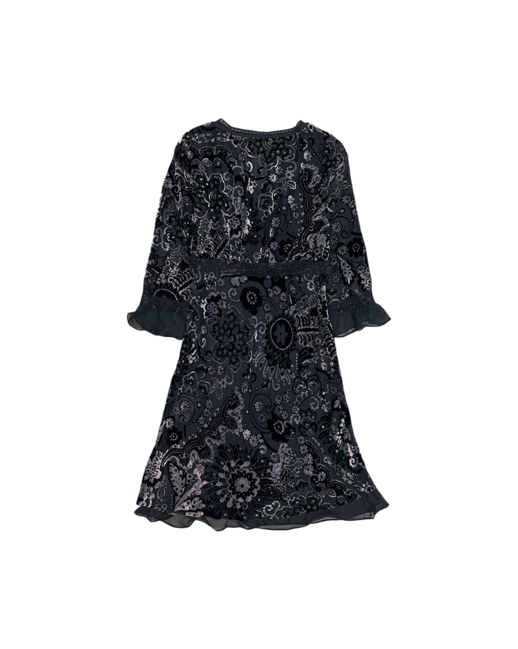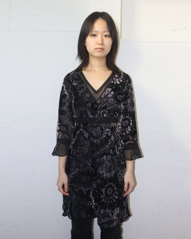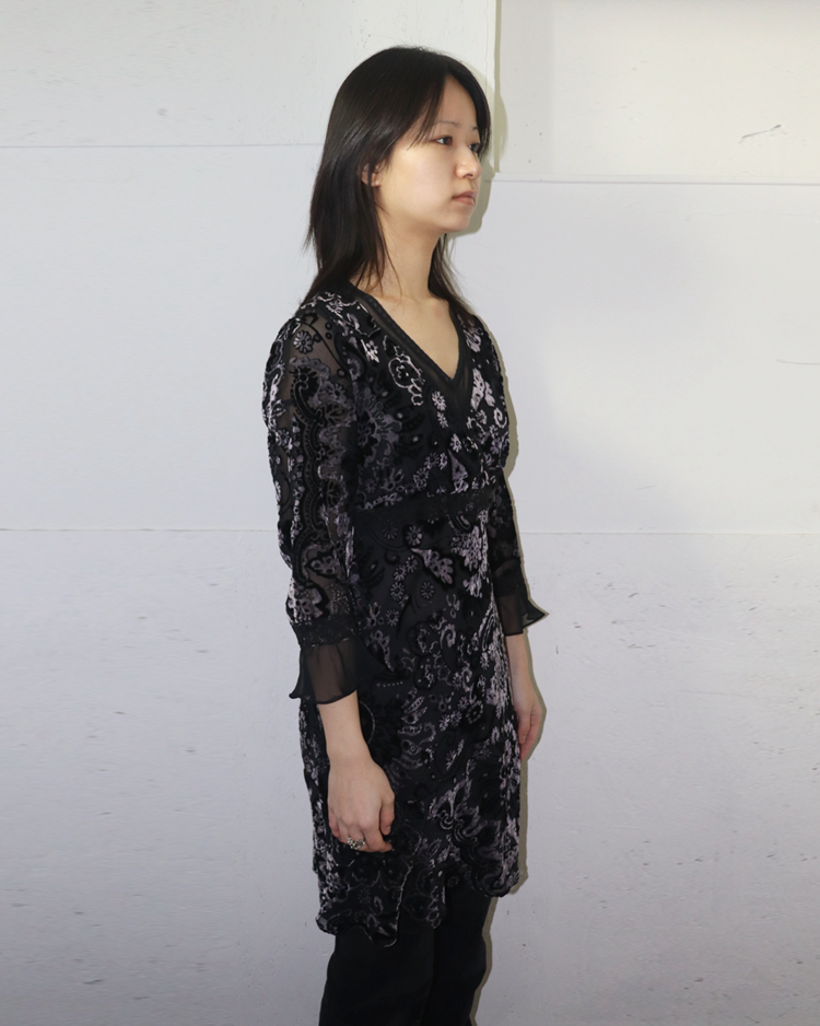 극적인 실루엣과 스토리텔링이 녹아든 디자인으로 유명한 존 갈리아노의 세컨라인 갈리아노의 제품입니다. 벨벳과 레이스로 이루어진 디테일이 존 갈리아노 특유의 화려함을 극대화합니다.