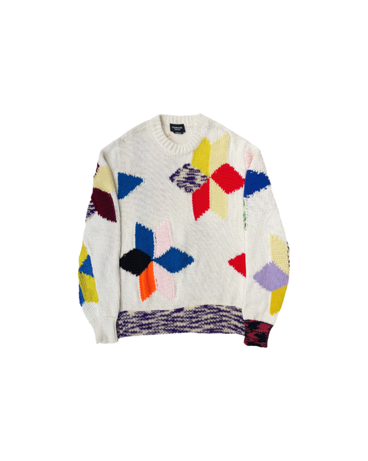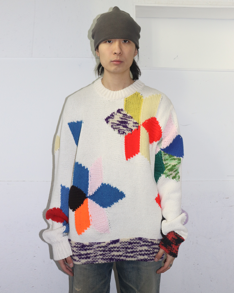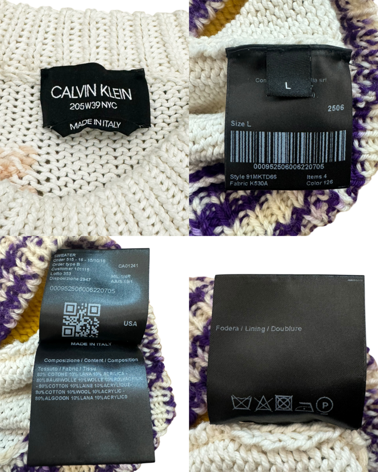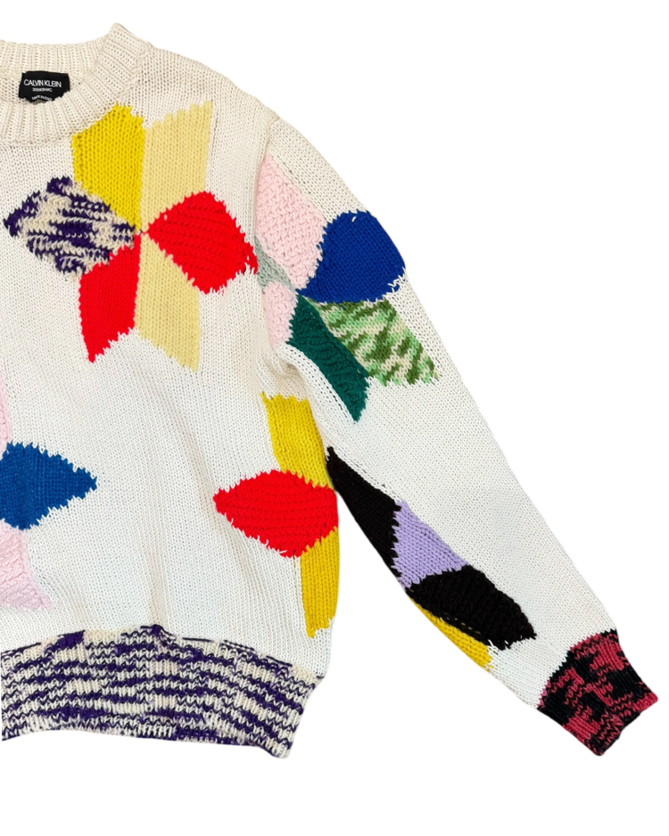 라프 시몬스가 유럽적 시각에서 미국 사회의 명암과 예술을 결합해 시대적 실험의 정점을 선보였던, 캘빈 클라인 205w39nyc의 제품입니다. 2018 리조트에 등장한 스웨터로, 다양한 컬러 블록을 손뜨개처럼 배열하여, 규칙 없는 패턴과 질감 대비가 화면처럼 펼쳐집니다. 당시 205W39NYC의 재해석을 가장 직관적으로 보여주는 아이템입니다.
