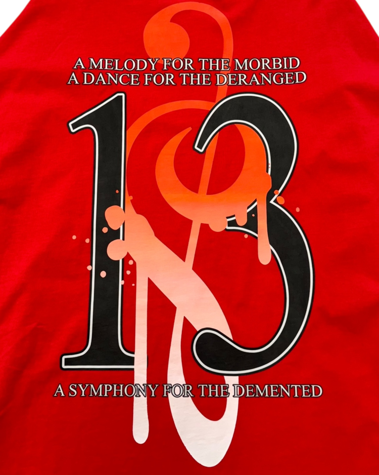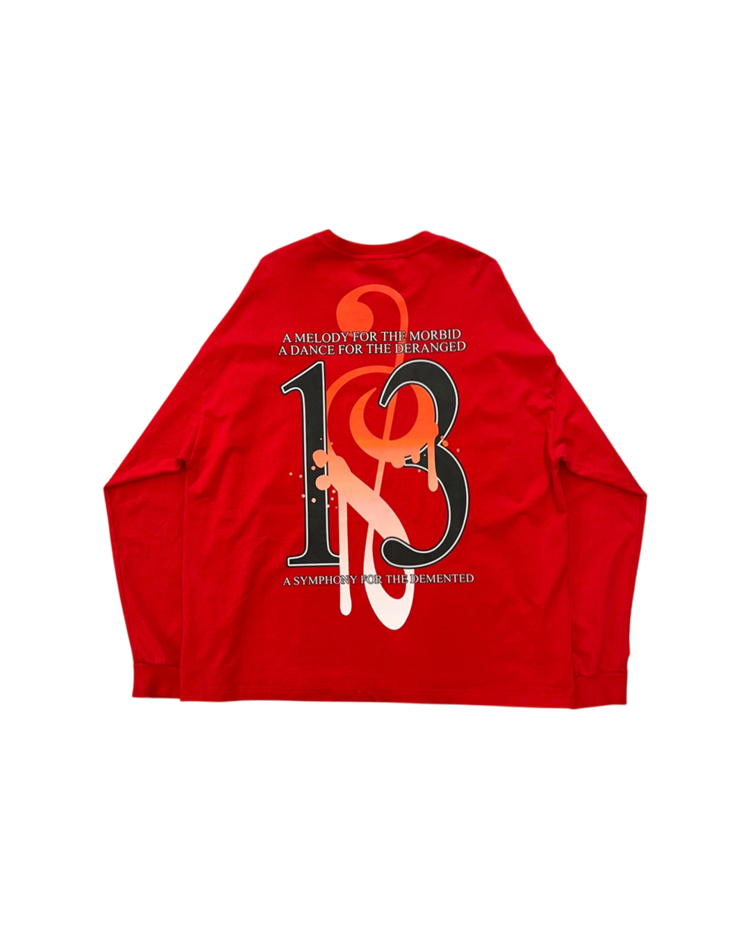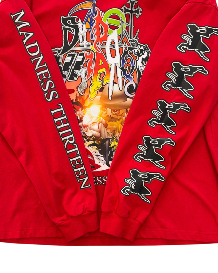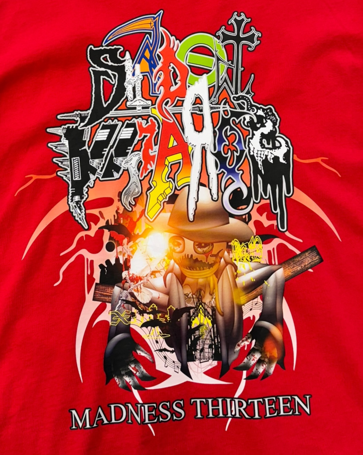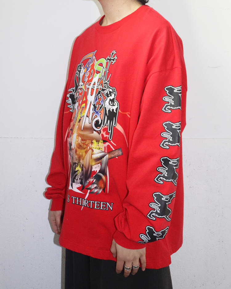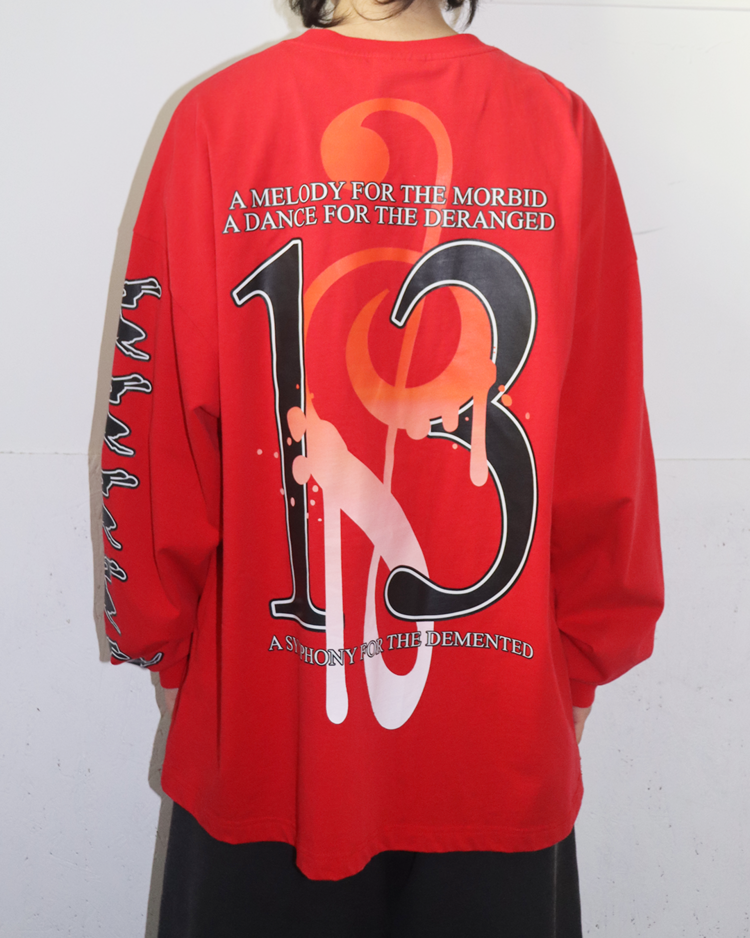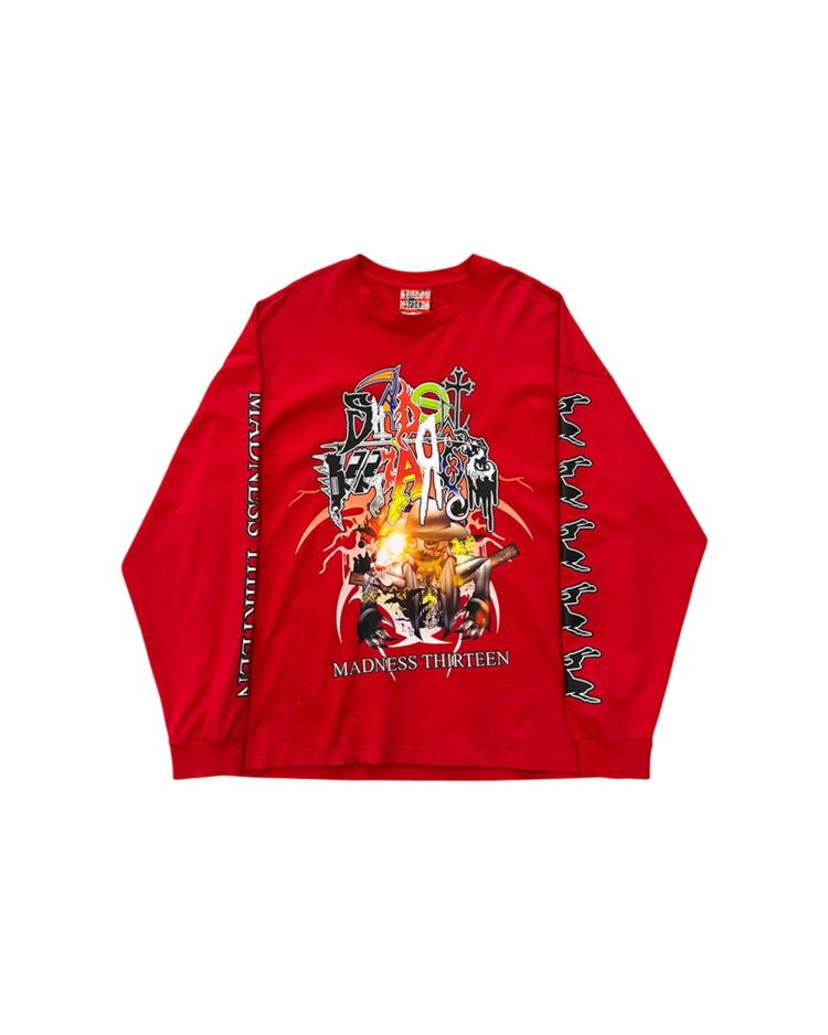 인터넷 밈·KVLT·다크 판타지 이미지를 기반으로 한 컬트적 비주얼을 전개하는 프로젝트형 브랜드 섀도우 위자드의 제품입니다. 과잉된 그래픽 레이어와 공격적인 프린팅이 배치된 롱슬리브로, 전면과 후면에 ‘MADNESS THIRTEEN’ 넘버 그래픽을 겹쳐 올려, 스트리트 무드에 앨범 커버 같은 구성을 지닌 아이템입니다.
