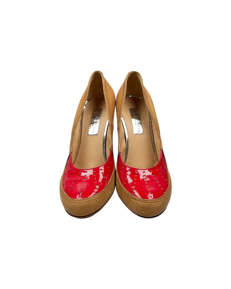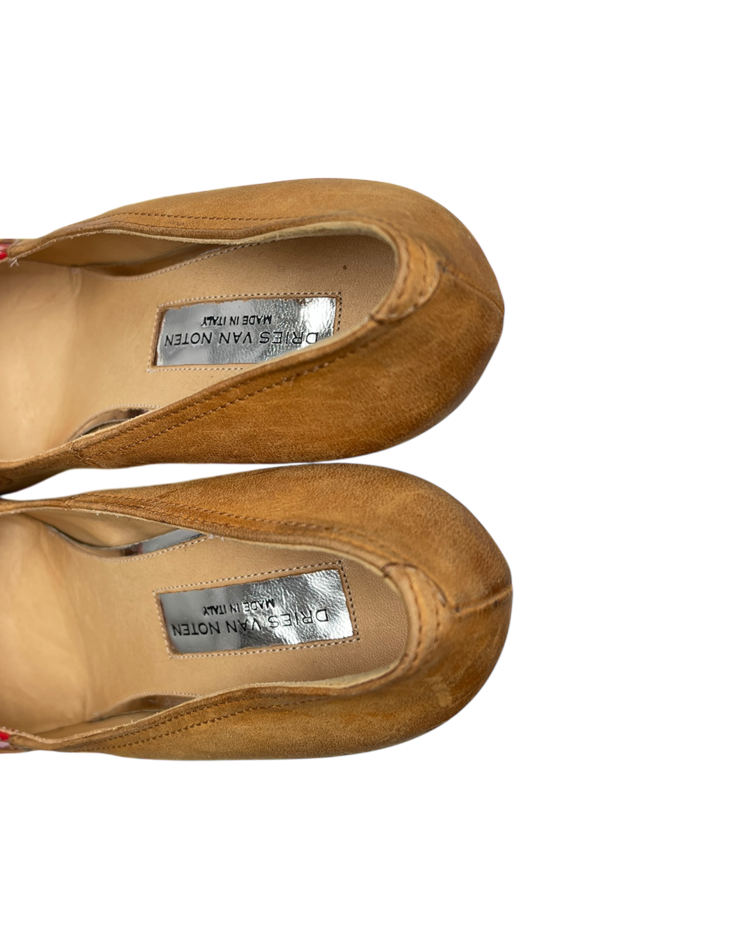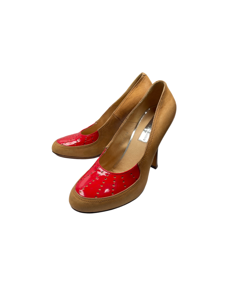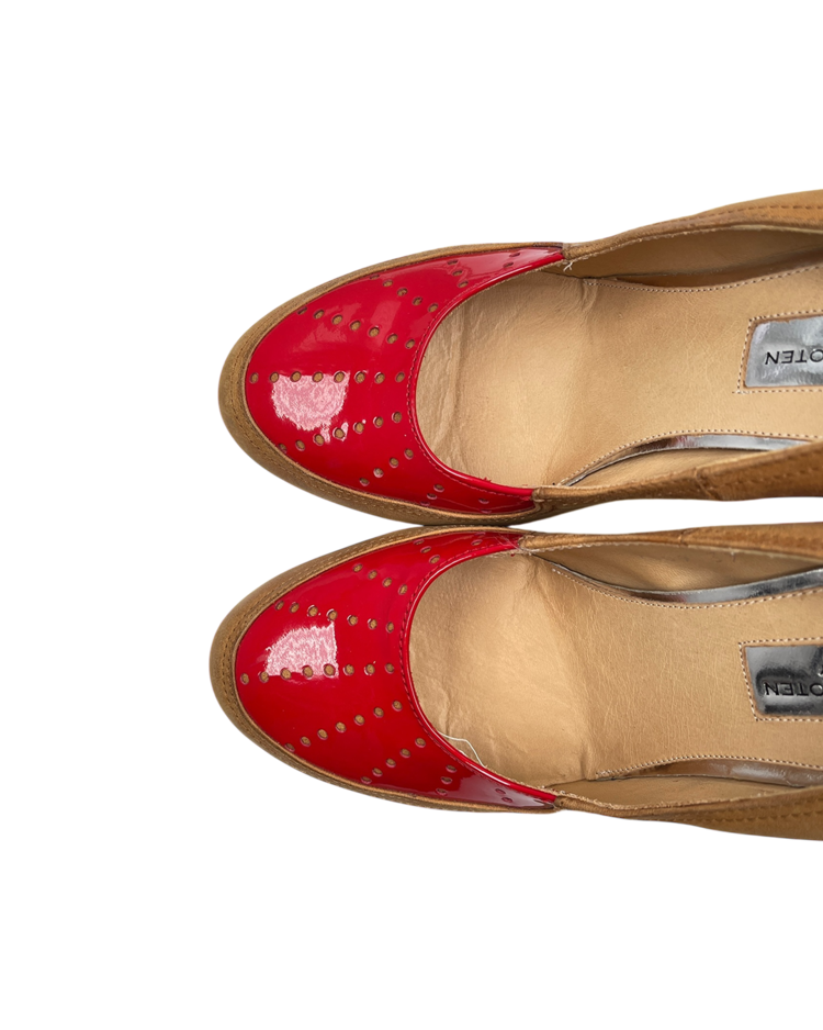 앤트워프 식스 중 한 명인 드리스 반 노튼의 제품입니다. 레드 컬러 에나멜 토 캡과 브라운 스웨이드 바디의 대비가 매력적인 슈즈로, 타이츠나 슬랙스와 매치했을 때 드리스 반 노튼 특유의 색 조합의 미학이 자연스럽게 드러납니다.