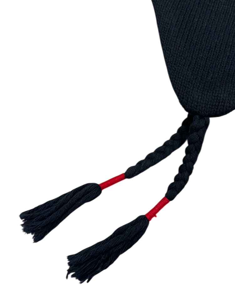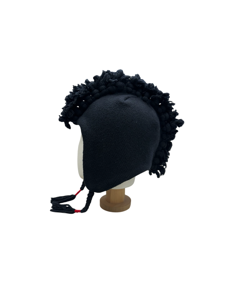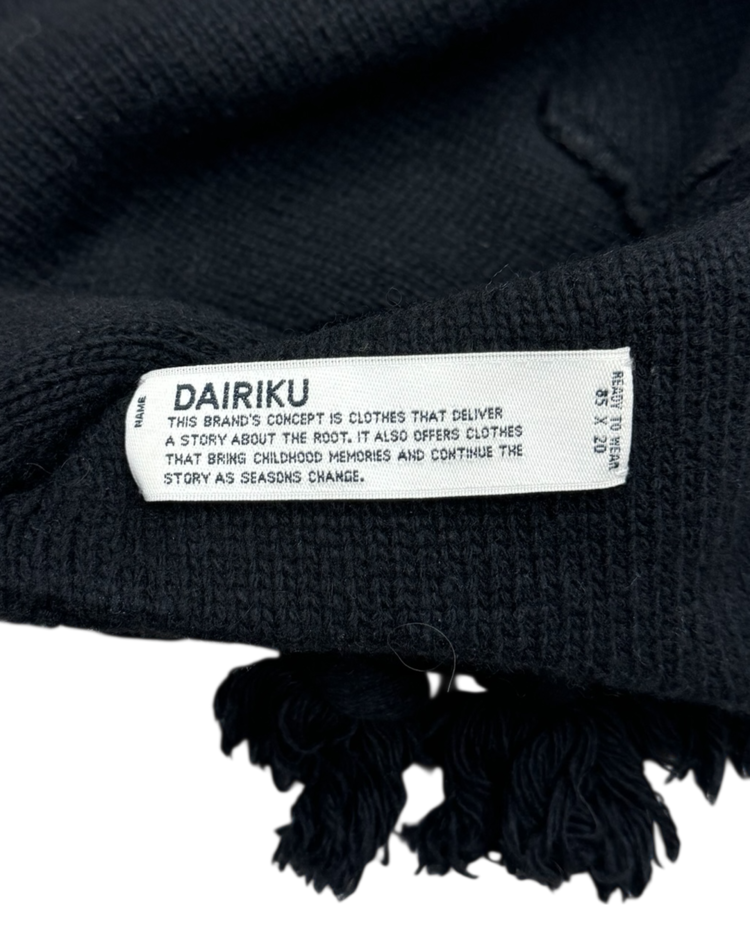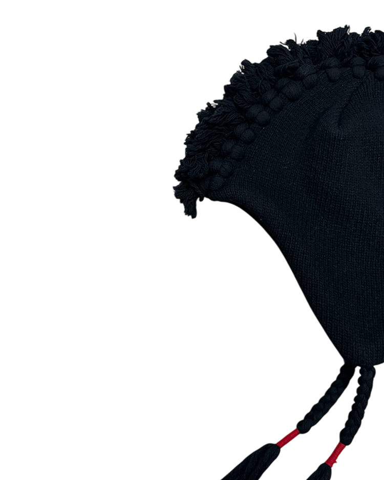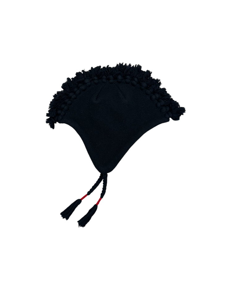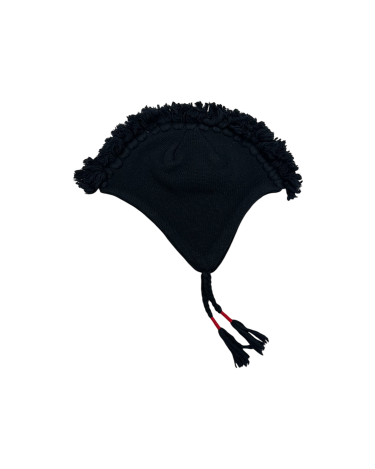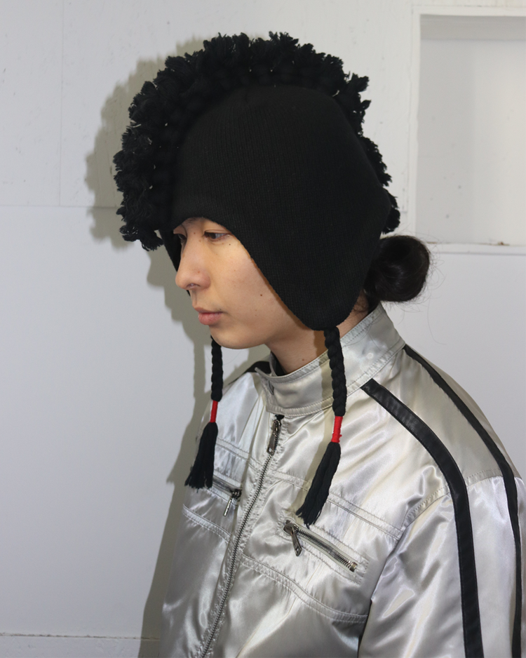 미국 서브컬처와 90~00년대 청춘 감성을 일본식으로 재해석하여, 키치한 아이디어와 수공적인 디테일을 즐겨 사용하는 다이리쿠의 제품입니다. 니트 바디 위로 모히칸 형태의 텍스처를 더한 독특한 실루엣이 특징입니다. 가장자리의 입체적인 매듭 디테일과 스트랩 끝 태슬 포인트가 존재하며, 룩에 즉각적인 캐릭터를 부여하는 아이템입니다.