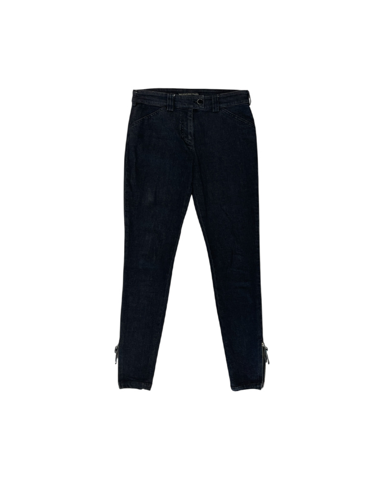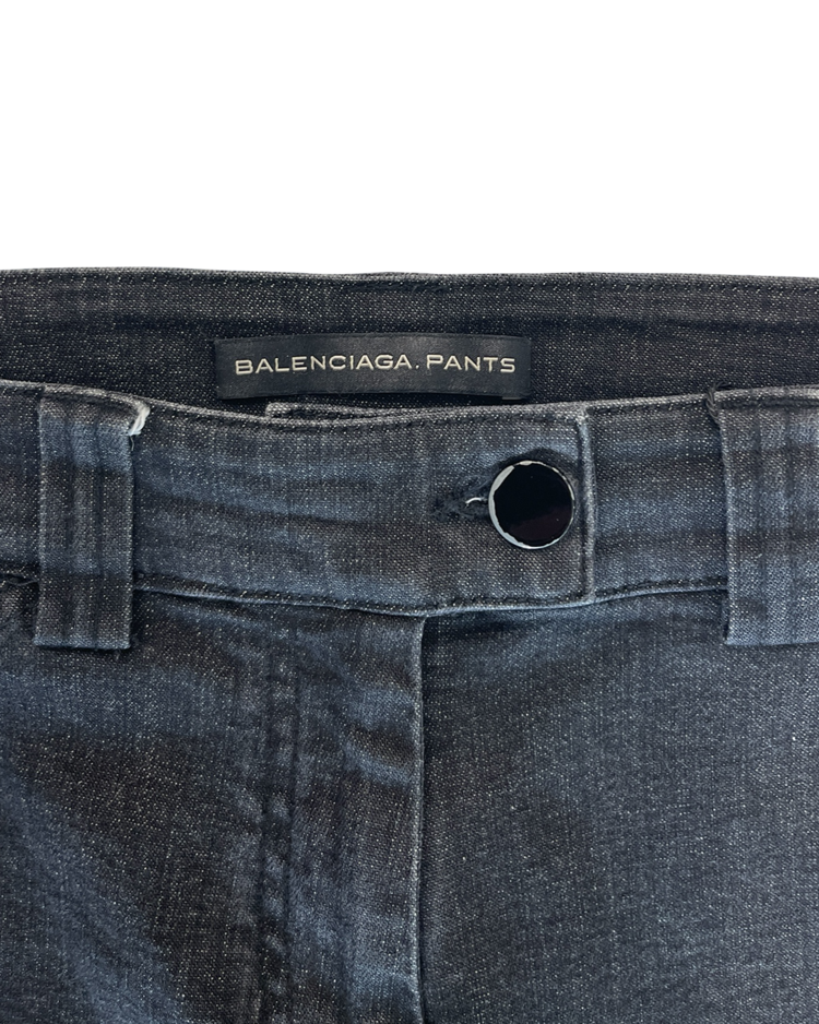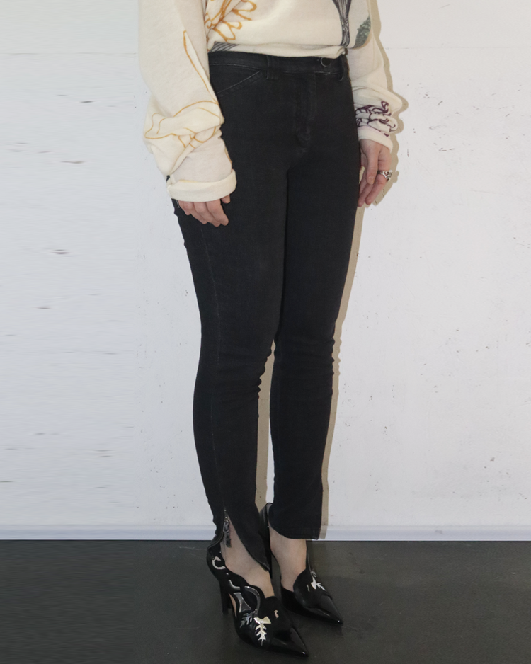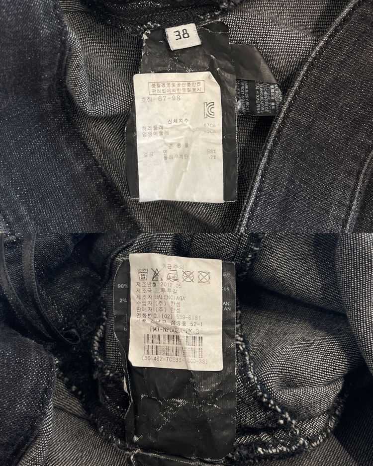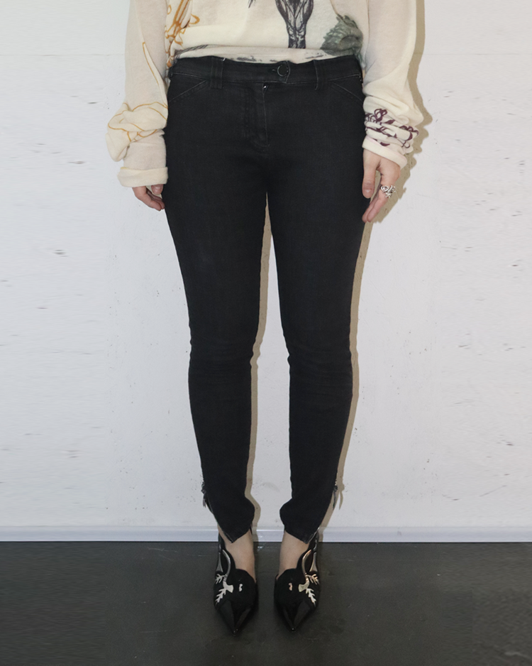 니콜라 게스키에르가 디렉팅하여 미래지향적인 건축적 실루엣이 강조된 발렌시아가의 제품입니다. 스키니한 실루엣에 밑단의 지퍼 슬릿이 매력적인 제품입니다. 지퍼 고리에 사용감 존재합니다.