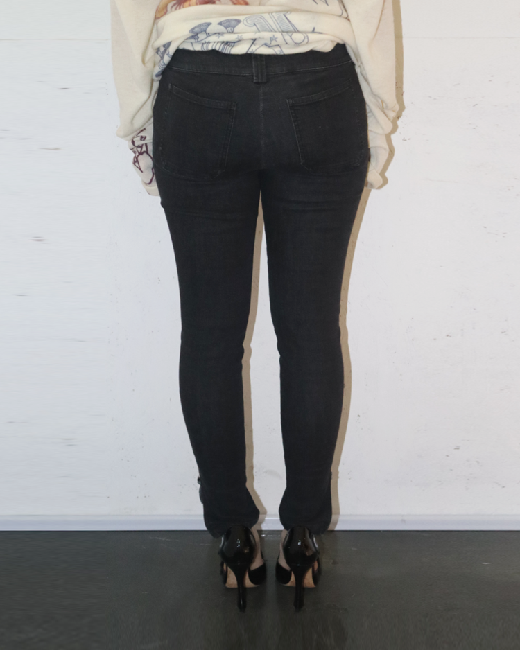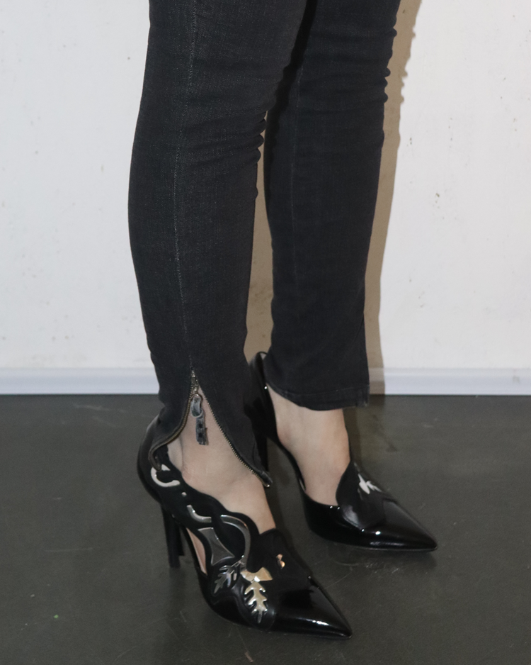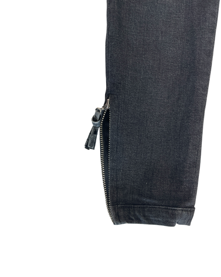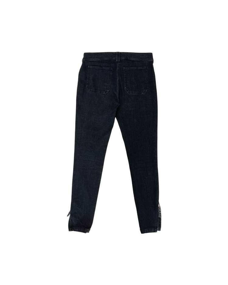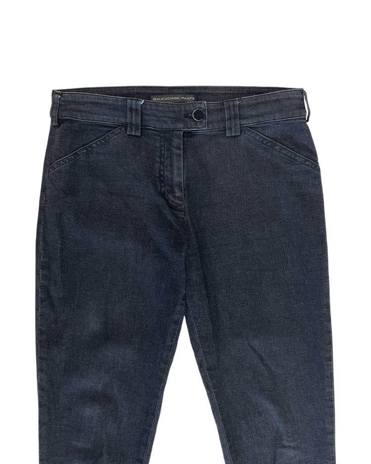니콜라 게스키에르가 디렉팅하여 미래지향적인 건축적 실루엣이 강조된 발렌시아가의 제품입니다. 스키니한 실루엣에 밑단의 지퍼 슬릿이 매력적인 제품입니다. 지퍼 고리에 사용감 존재합니다.