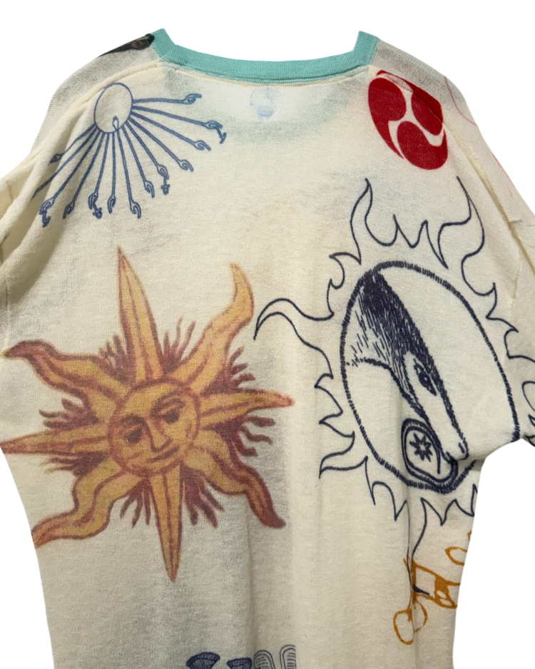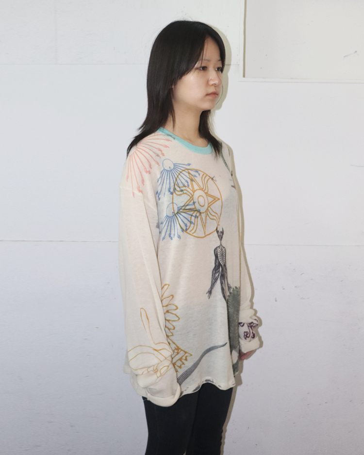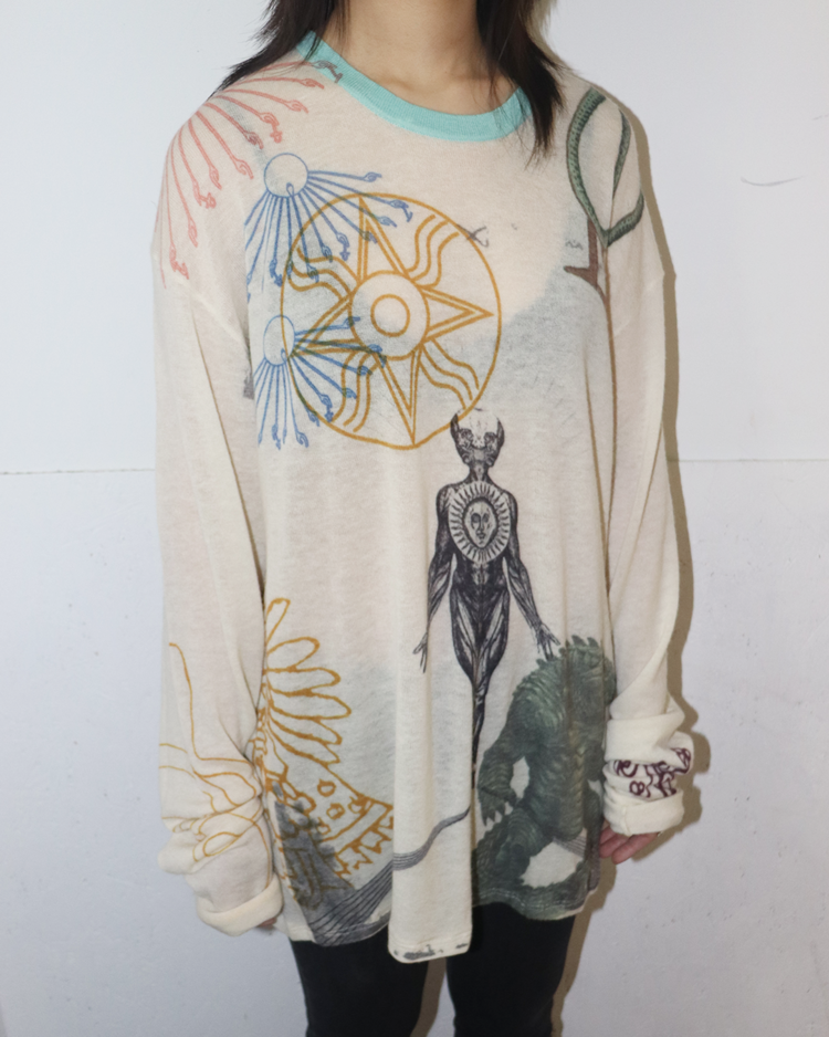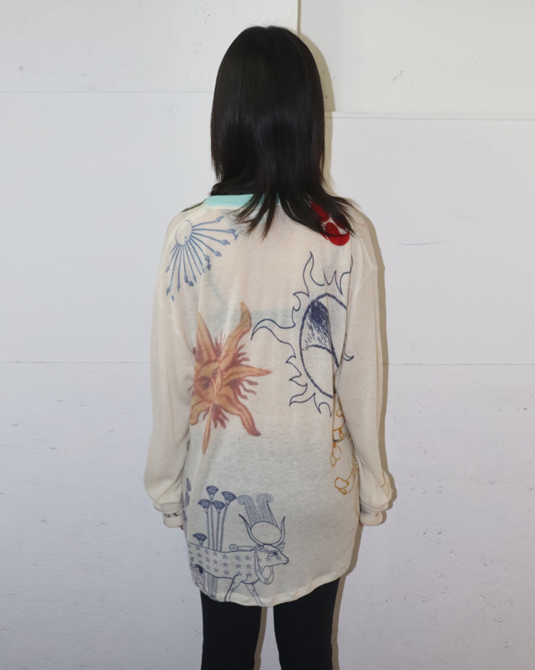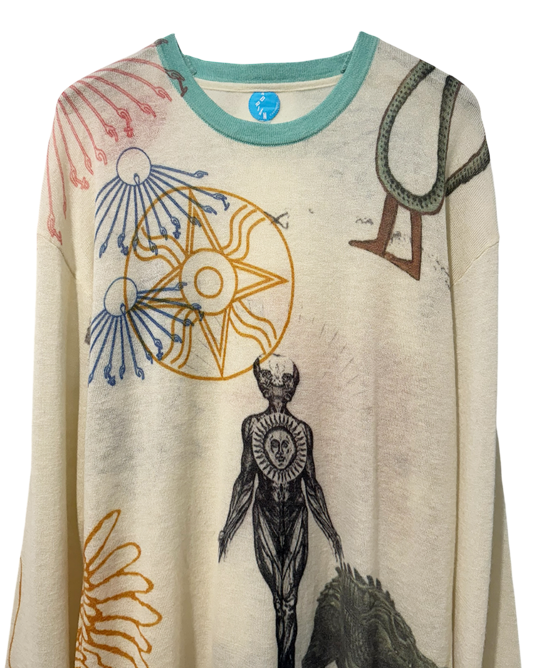 캐시미어와 파인 니트웨어를 기반으로 회화적 그래픽과 서사적인 프린트를 결합하는 브랜드 아드리안 캐시미어의 제품입니다. 얇고 부드러운 바디 위에 태양, 인체, 생물 모티프를 자유롭게 배치한 올오버 프린트가 매력적입니다. 자연스럽게 흐르는 실루엣과 길게 떨어지는 소매로 단독 착용만으로도 존재감이 강한 아이템입니다.