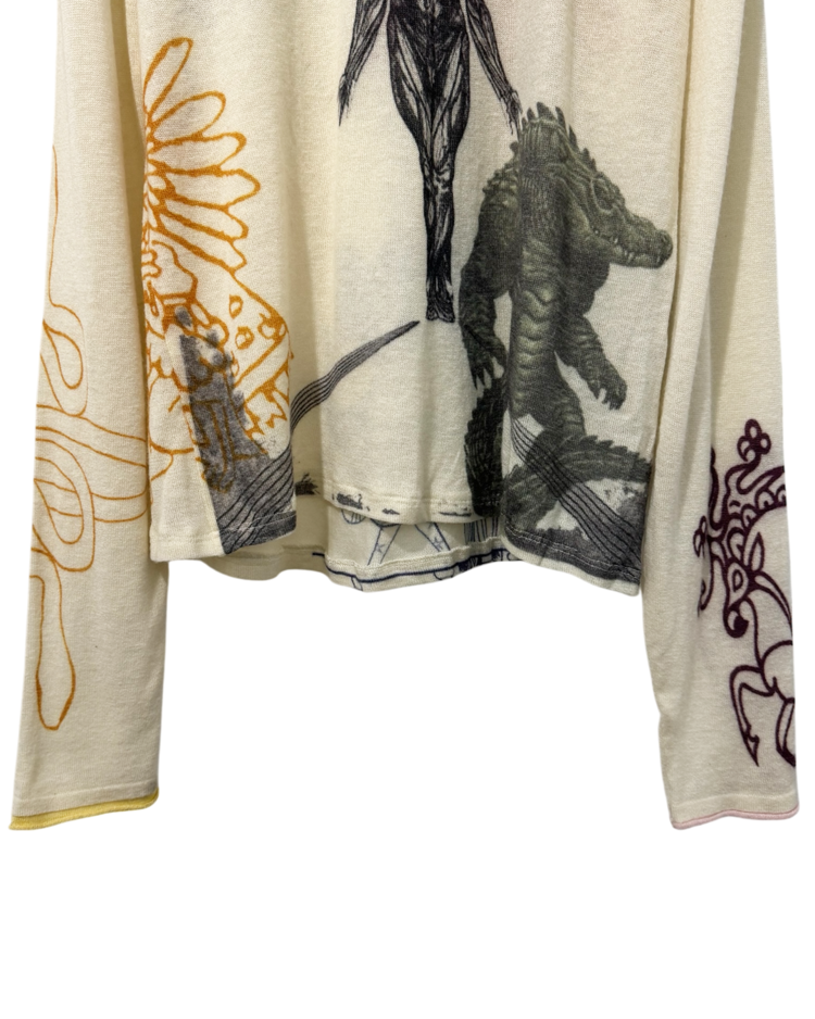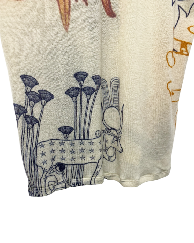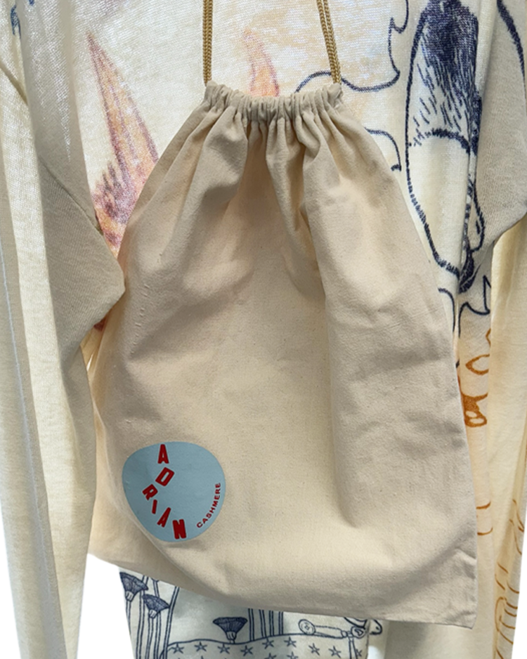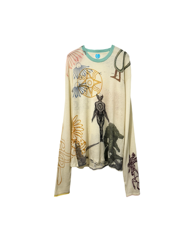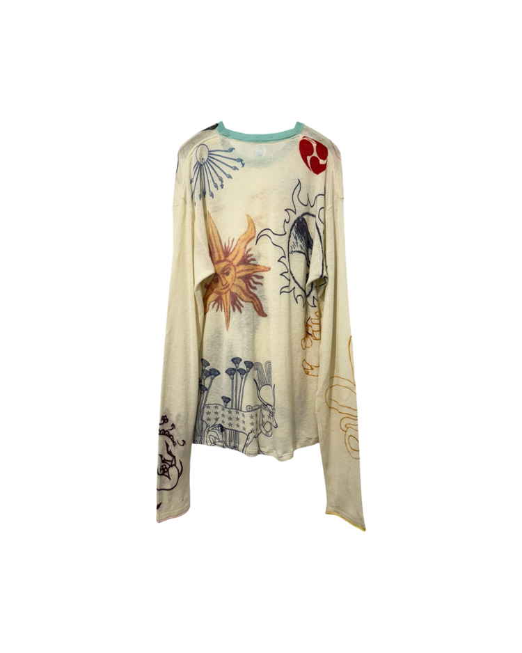 캐시미어와 파인 니트웨어를 기반으로 회화적 그래픽과 서사적인 프린트를 결합하는 브랜드 아드리안 캐시미어의 제품입니다. 얇고 부드러운 바디 위에 태양, 인체, 생물 모티프를 자유롭게 배치한 올오버 프린트가 매력적입니다. 자연스럽게 흐르는 실루엣과 길게 떨어지는 소매로 단독 착용만으로도 존재감이 강한 아이템입니다.