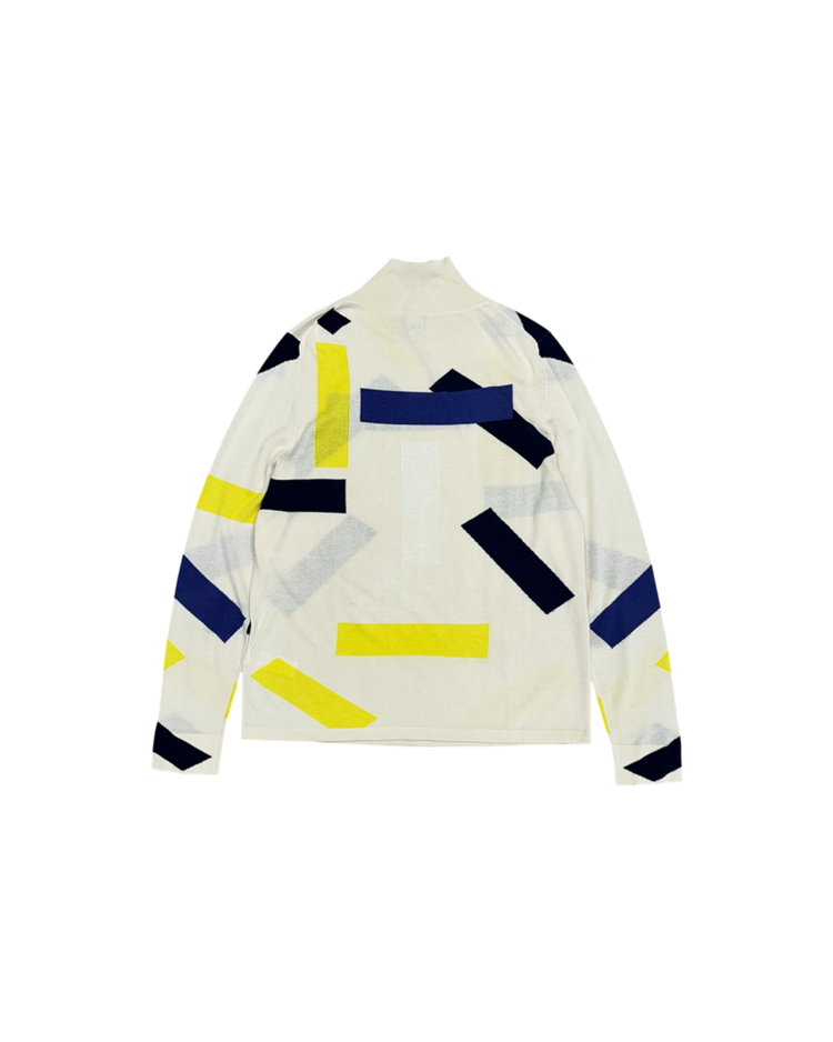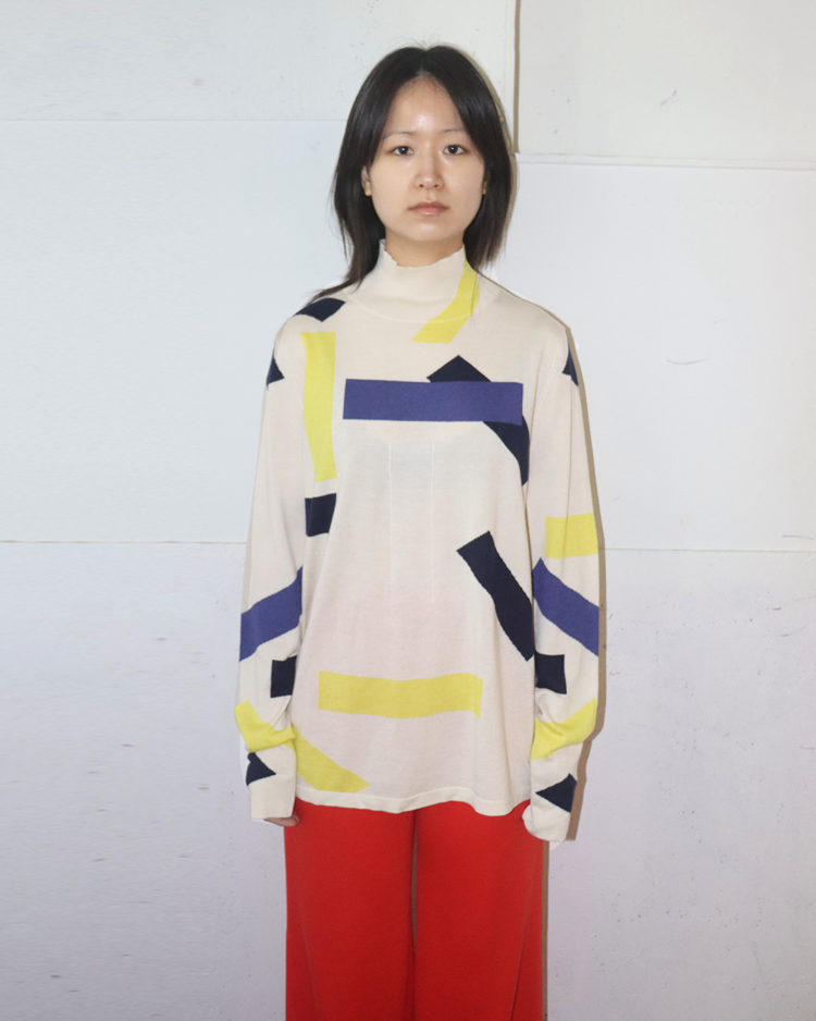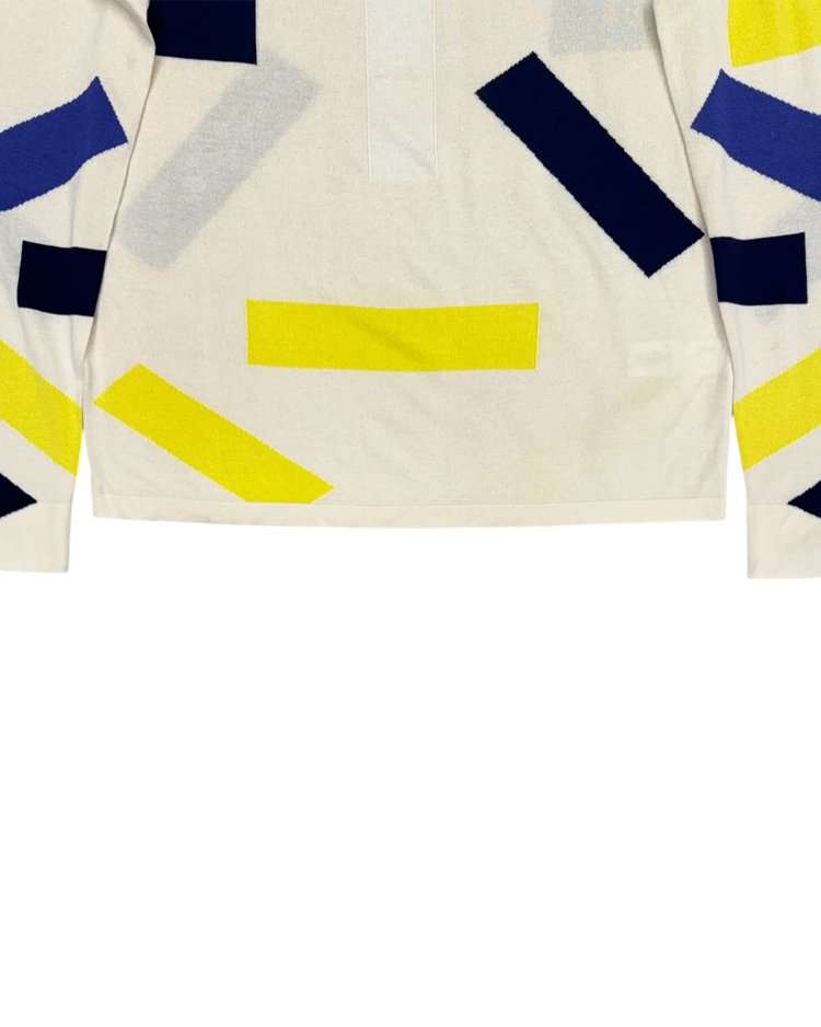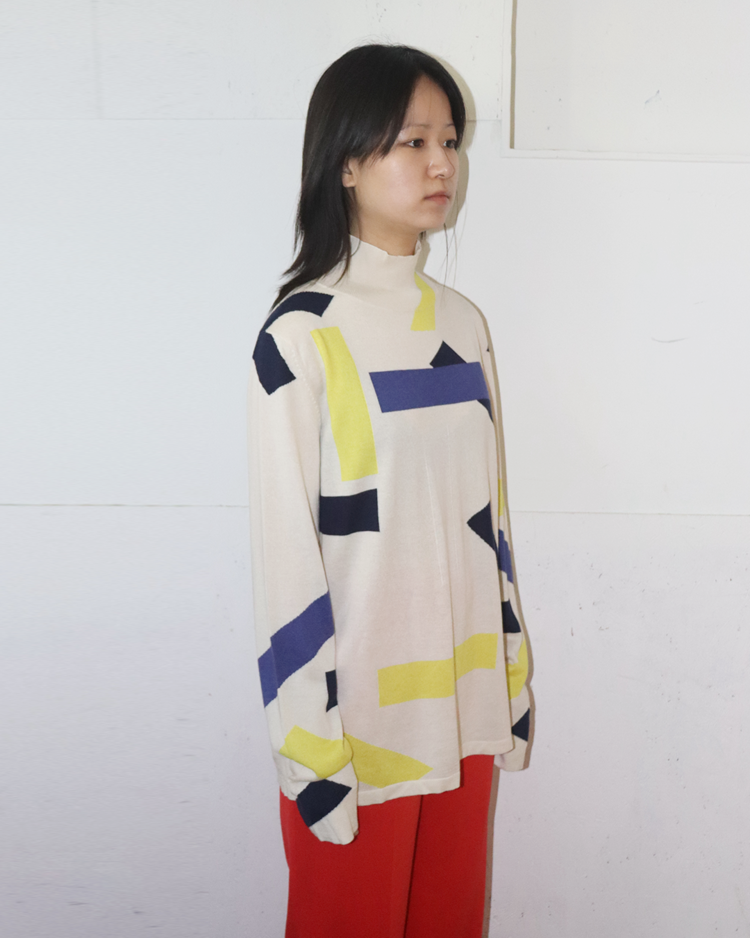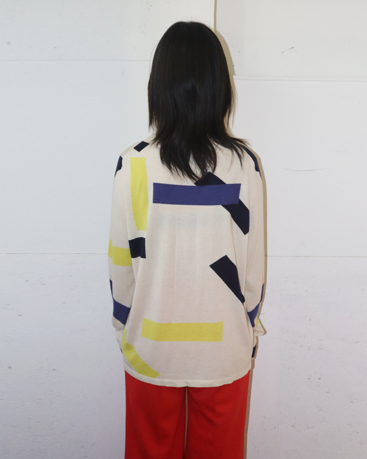 캐시미어와 파인 니트웨어를 기반으로 회화적 그래픽과 서사적인 프린트를 결합하는 브랜드 아드리안 캐시미어의 제품입니다. 캐시미어와 실크를 블렌딩해 가볍고 매끈한 촉감을 살렸습니다. 오프화이트 바디 위에 스트라이프 패턴을 불규칙하게 배치해 그래픽적인 인상을 주며, 앞·뒤로 이어지는 패턴이 입체적인 실루엣을 만듭니다.