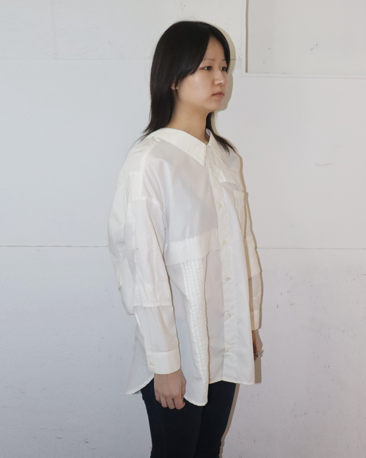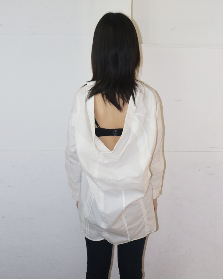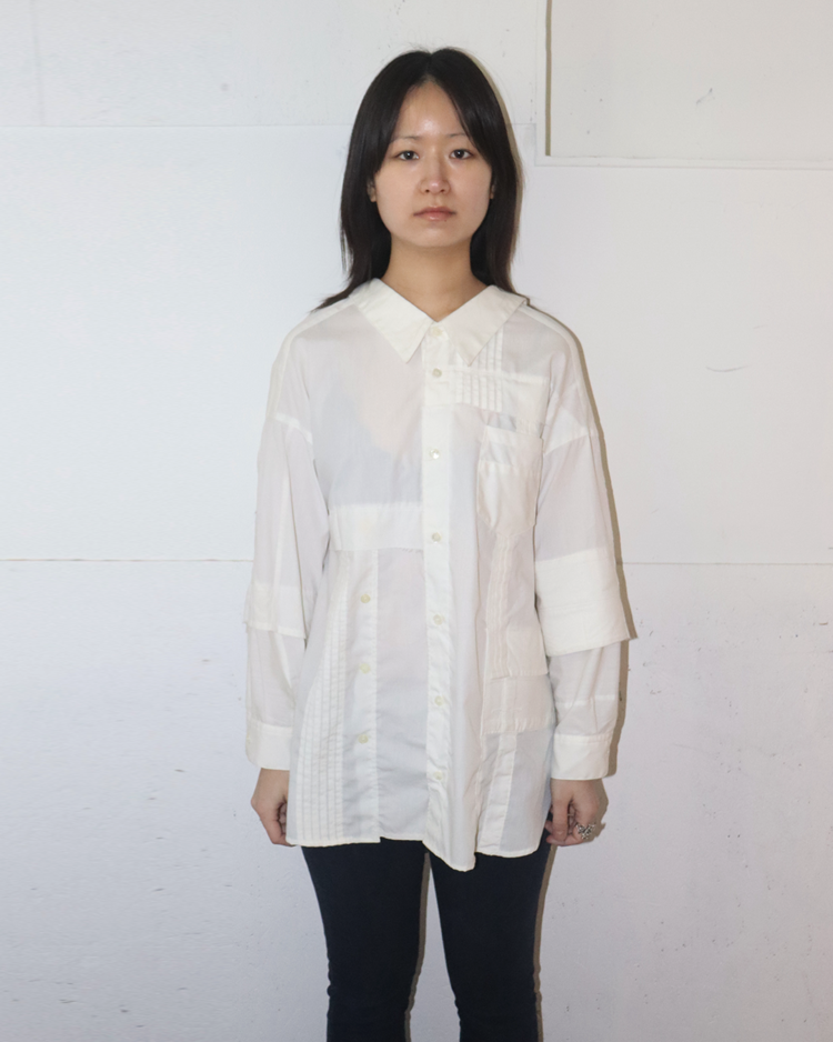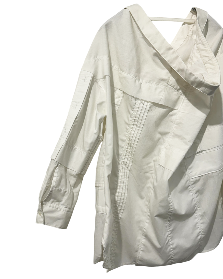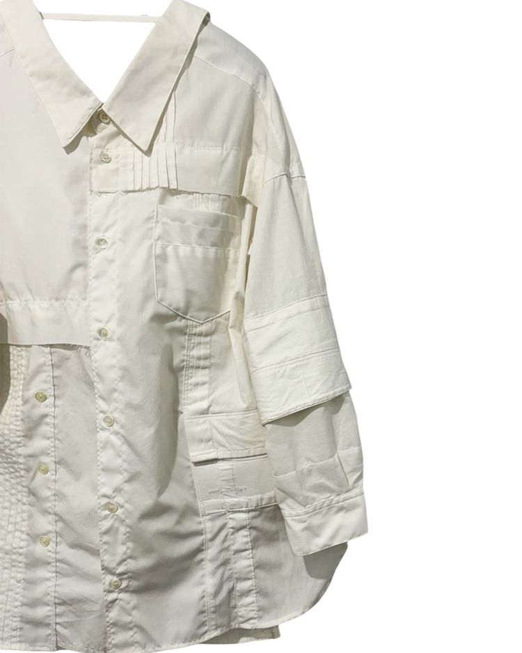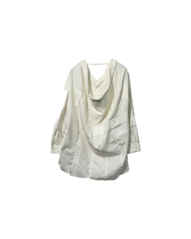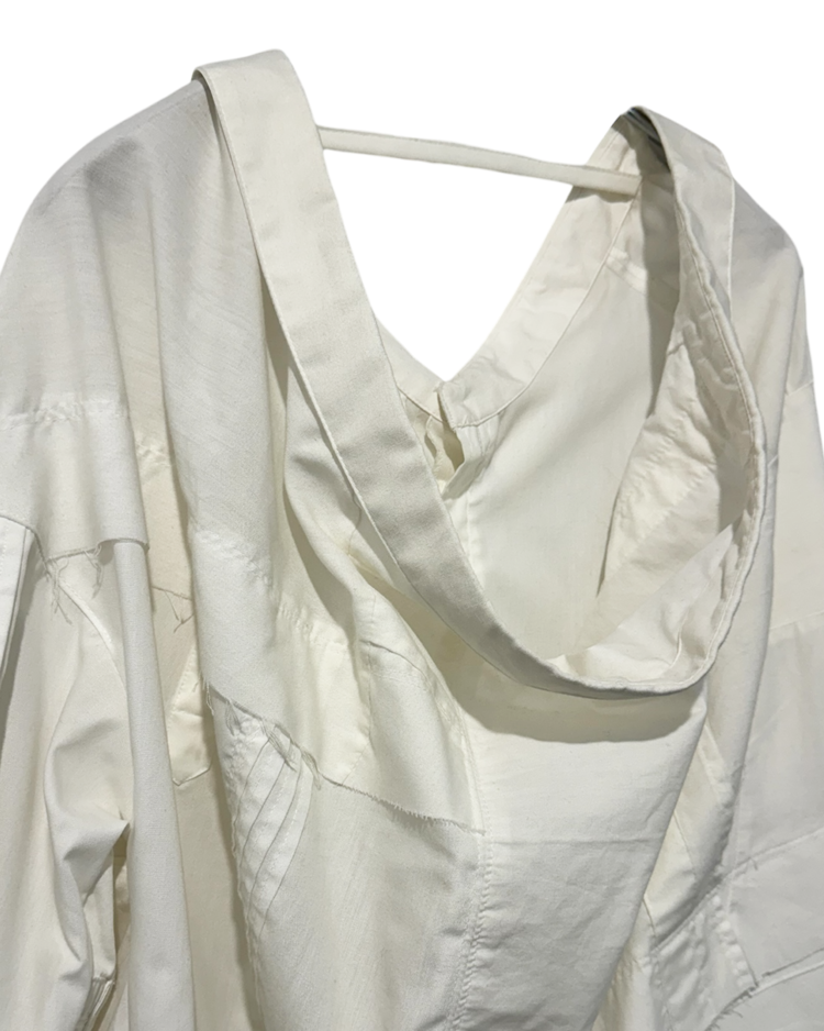 기존 의복을 해체·수정·재조합해 형태가 살짝 어긋난 실루엣을 만드는 미하라 야스히로의 리워크 기반 라인인 "Modified"의 제품입니다. 셔츠 구조를 비틀어 앞뒤가 열리는 오픈백 형태로 변주를 주며, 패치워크 패널과 노출된 스티치와 절개 디테일로 해체주의를 완성시켰습니다. 루즈한 바디에 비대칭 레이어가 겹치며, 단정한 셔츠를 실험적인 피스로 전환한 것이 매력적입니다.