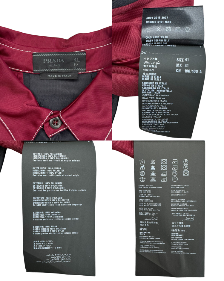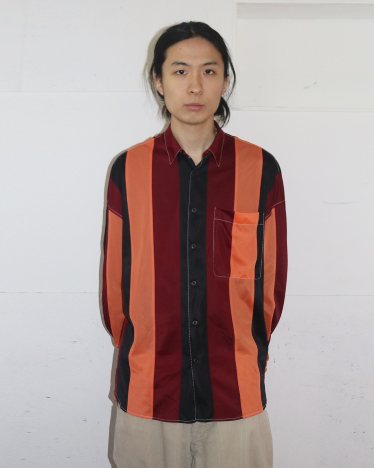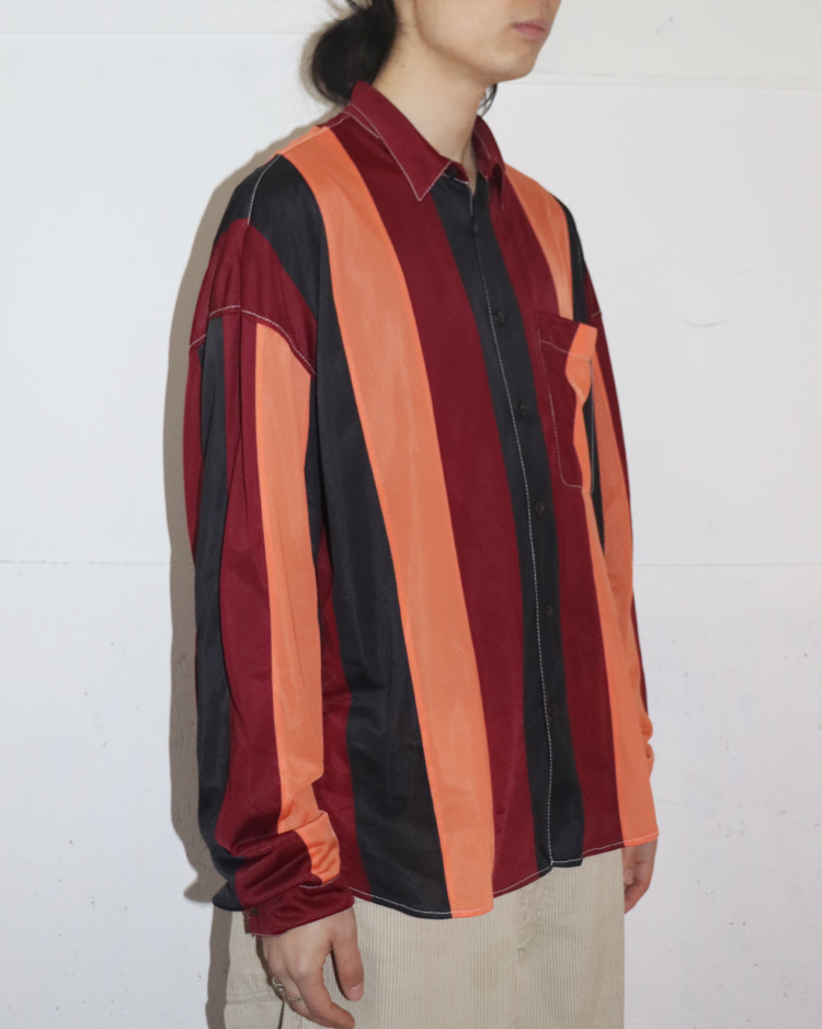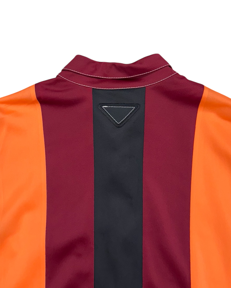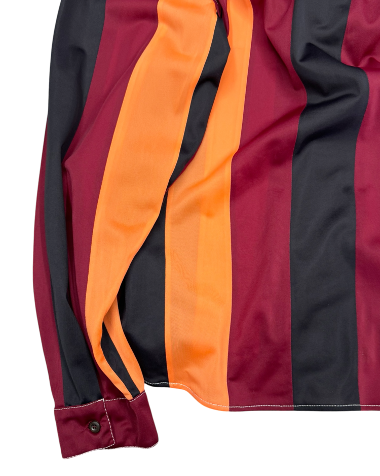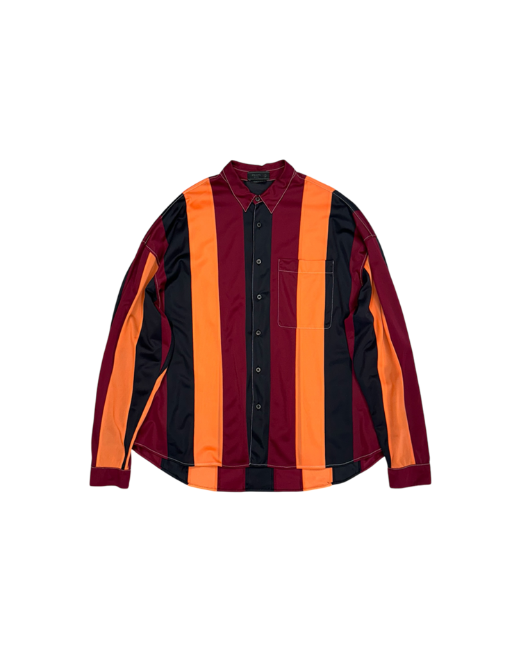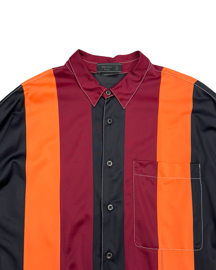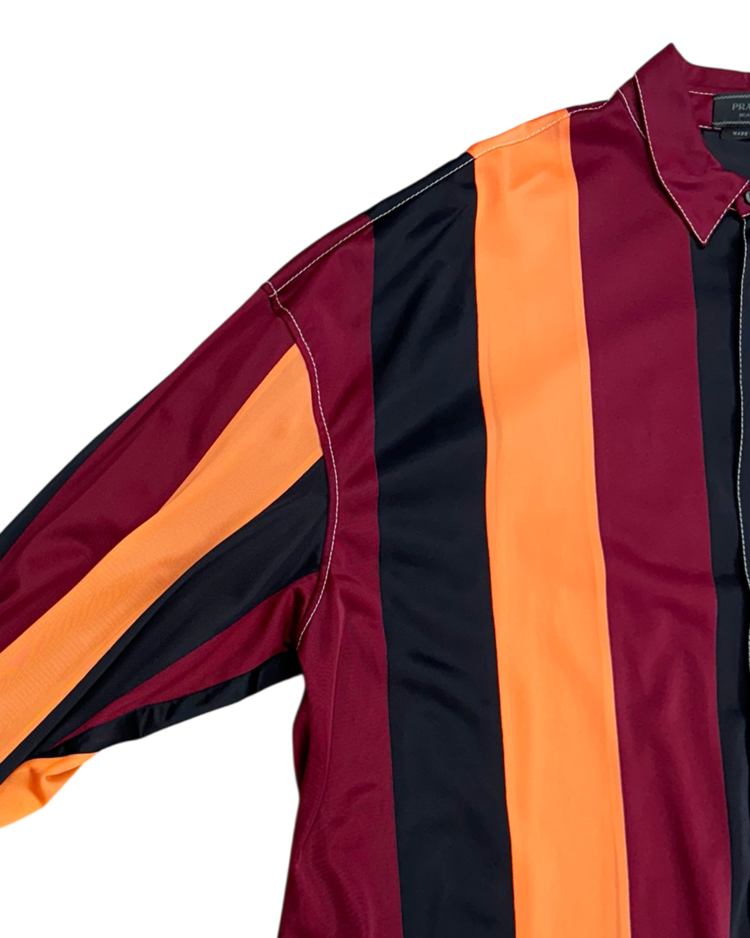 혁신적인 디자인과 고급스러움을 결합하는 프라다의 아이템입니다. 버건디·오렌지·블랙의 강한 대비 스트라이프가 특징인 셔츠로, 컬러 블로킹을 세로 패널로 배치해 시각적인 리듬을 만든 디자인입니다. 매끈한 셔츠 원단에 스티치와 가슴 포켓, 후면부 시그니처 트라이앵글 디테일을 더해 프라다 특유의 그래픽 감각을 연출했습니다.