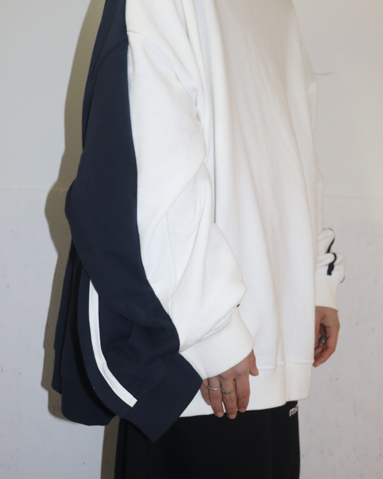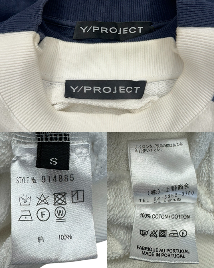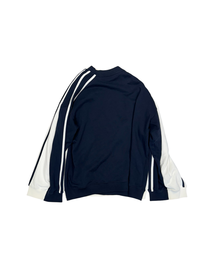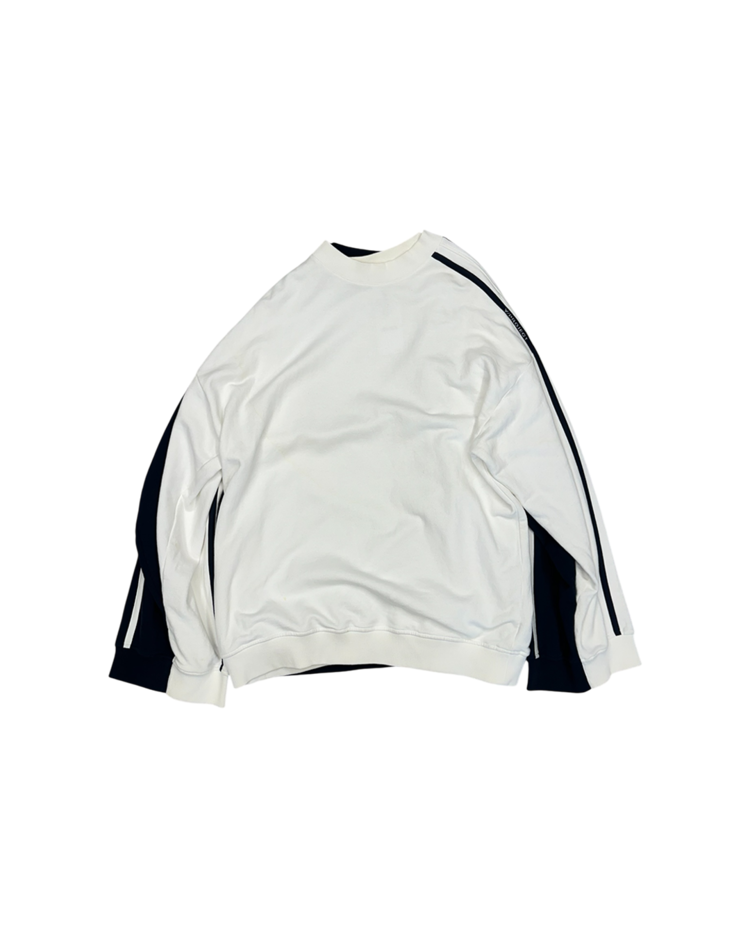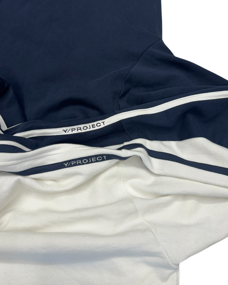 해체적 테일러링과 구조 변형을 통해 ‘한 벌이 여러 형태로 변하는 옷’을 제안하는 글렌 마틴스가 이끌었던 브랜드 와이 프로젝트의 제품입니다. 2018AW 런웨이에서 등장한 아이템으로, 네이비와 화이트 스웻셔츠가 더블 레이어드 구조를 이루며, 소매와 바디가 양면으로 전환되는 와이 프로젝트 특유의 실험성이 잘 드러나는 피스입니다. 전체적으로 사용감 있는 아이템으로, 오염들이 존재합니다.