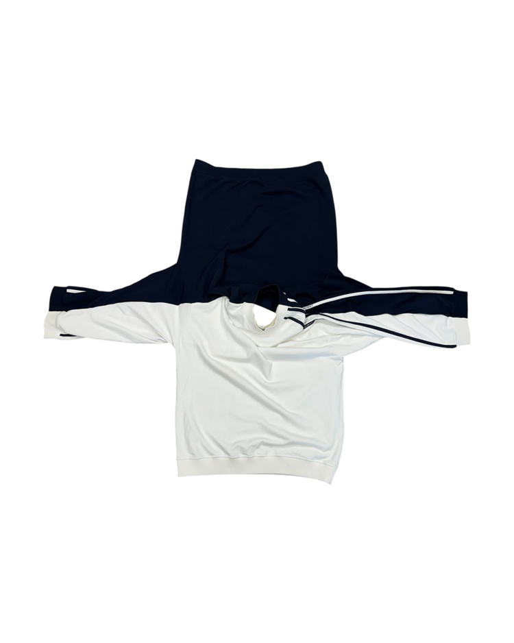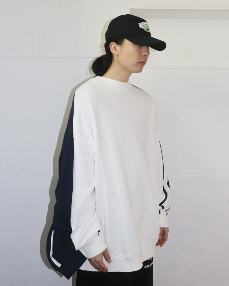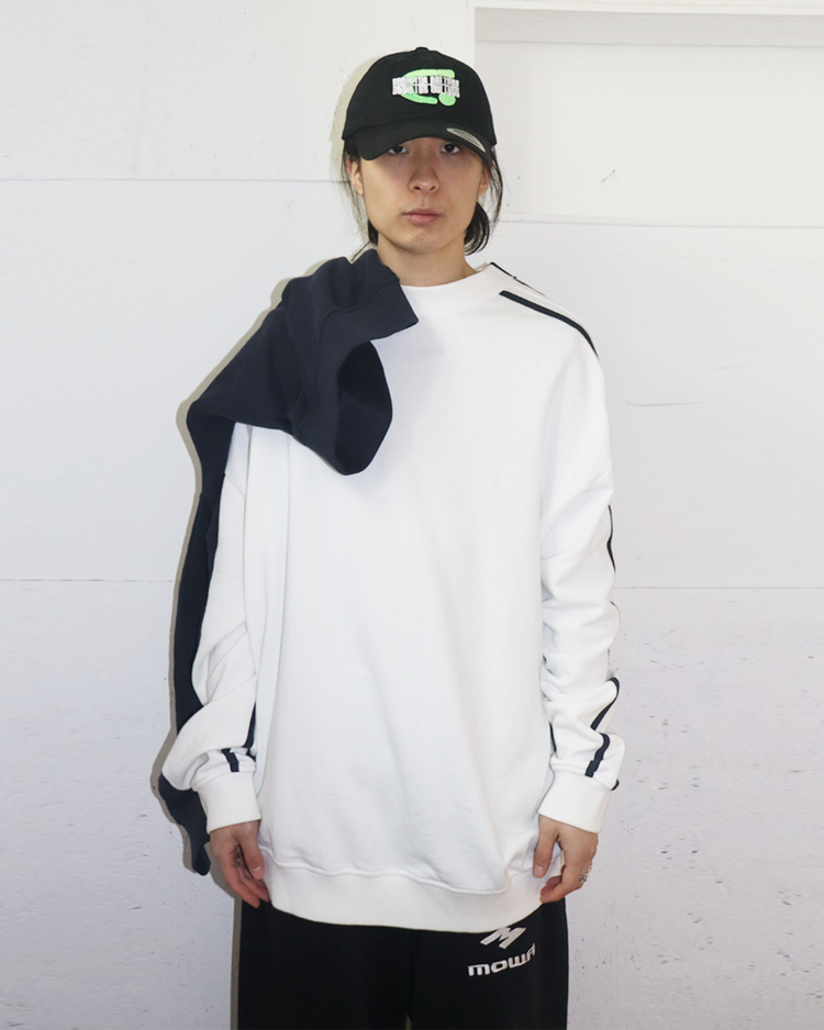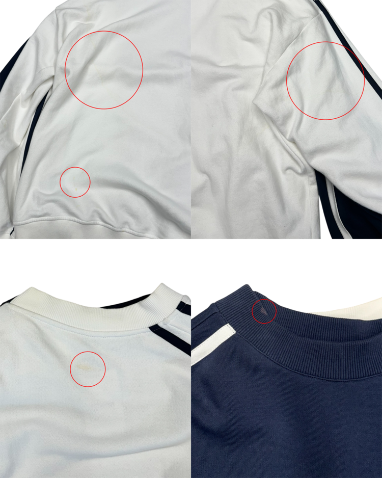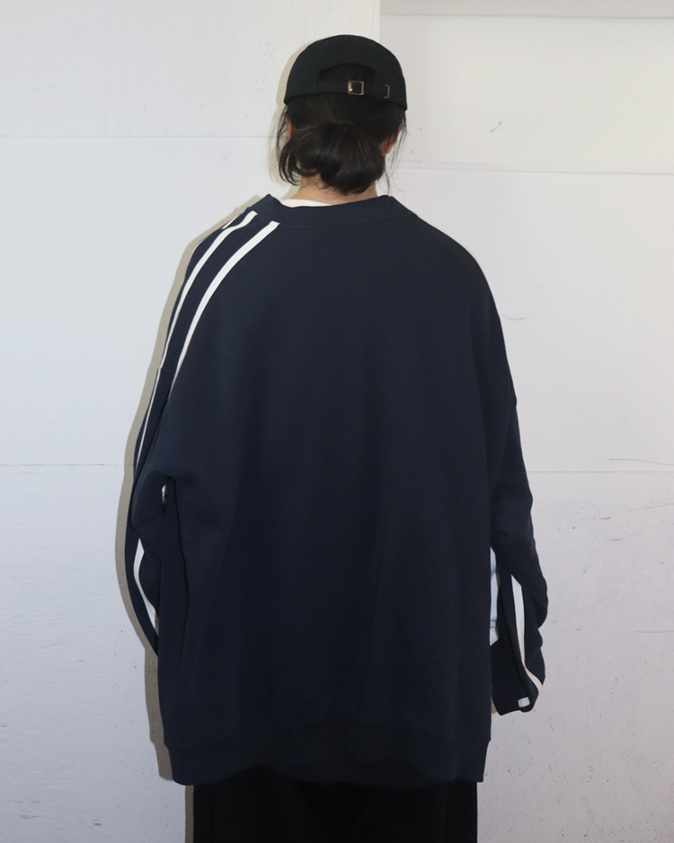 해체적 테일러링과 구조 변형을 통해 ‘한 벌이 여러 형태로 변하는 옷’을 제안하는 글렌 마틴스가 이끌었던 브랜드 와이 프로젝트의 제품입니다. 2018AW 런웨이에서 등장한 아이템으로, 네이비와 화이트 스웻셔츠가 더블 레이어드 구조를 이루며, 소매와 바디가 양면으로 전환되는 와이 프로젝트 특유의 실험성이 잘 드러나는 피스입니다. 전체적으로 사용감 있는 아이템으로, 오염들이 존재합니다.