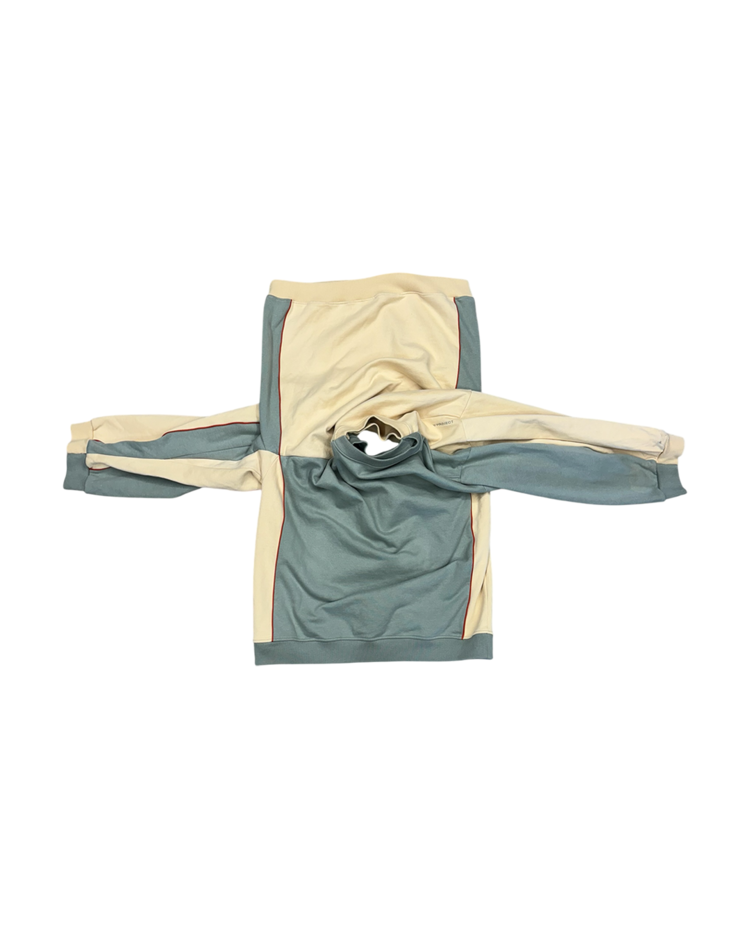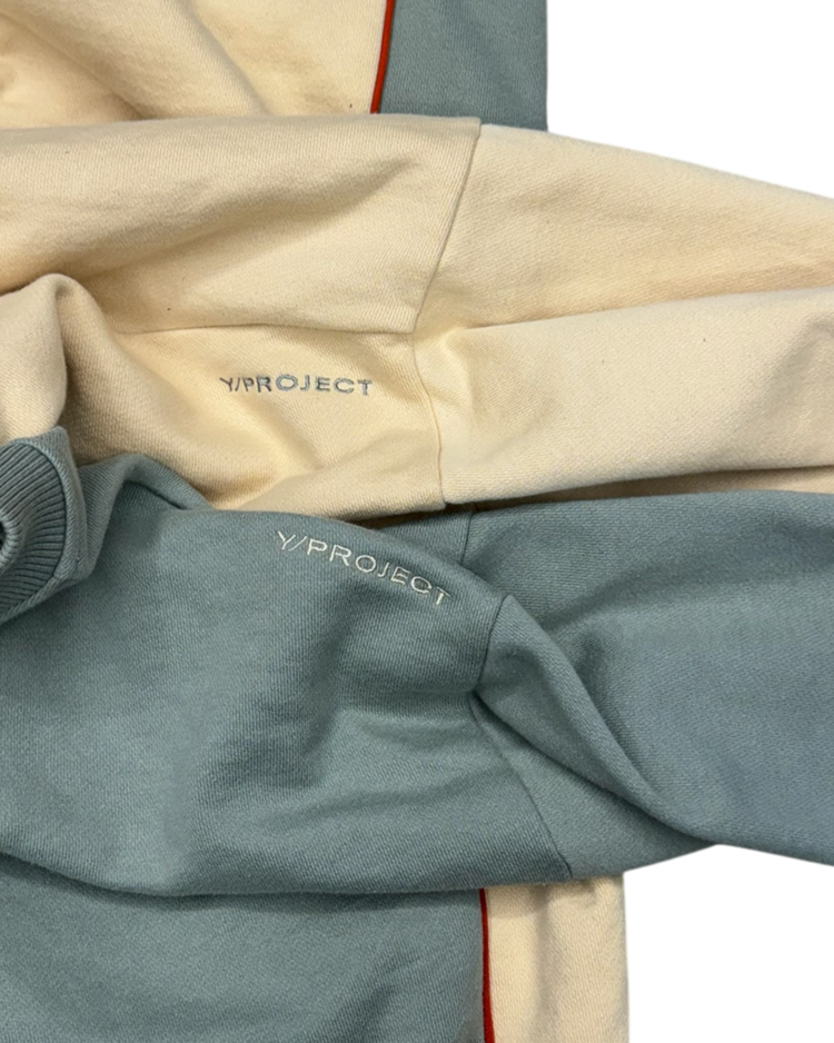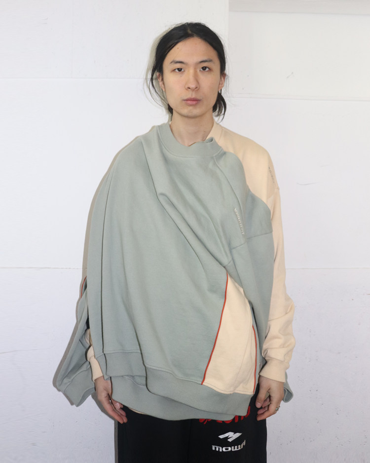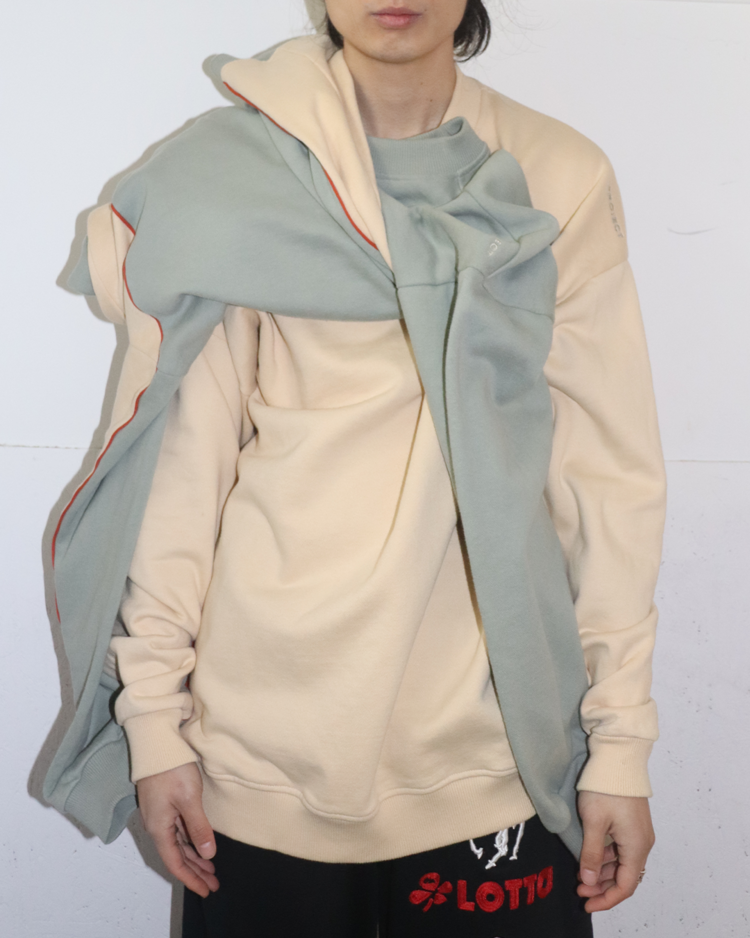 해체적 테일러링과 구조 변형을 통해 ‘한 벌이 여러 형태로 변하는 옷’을 제안하는 글렌 마틴스가 이끌었던 브랜드 와이 프로젝트의 제품입니다. 2018AW에 발매된 아이템으로, 파스텔 톤의 그린과 옐로우 스웻셔츠가 더블 레이어드 구조를 이루며, 소매와 바디가 양면으로 전환되는 와이 프로젝트 특유의 실험성이 잘 드러나는 피스입니다. 한 쪽 소매에 오염이 존재합니다.