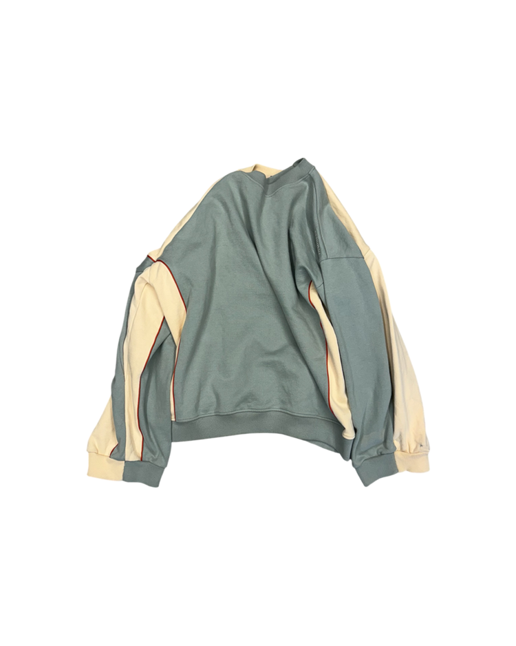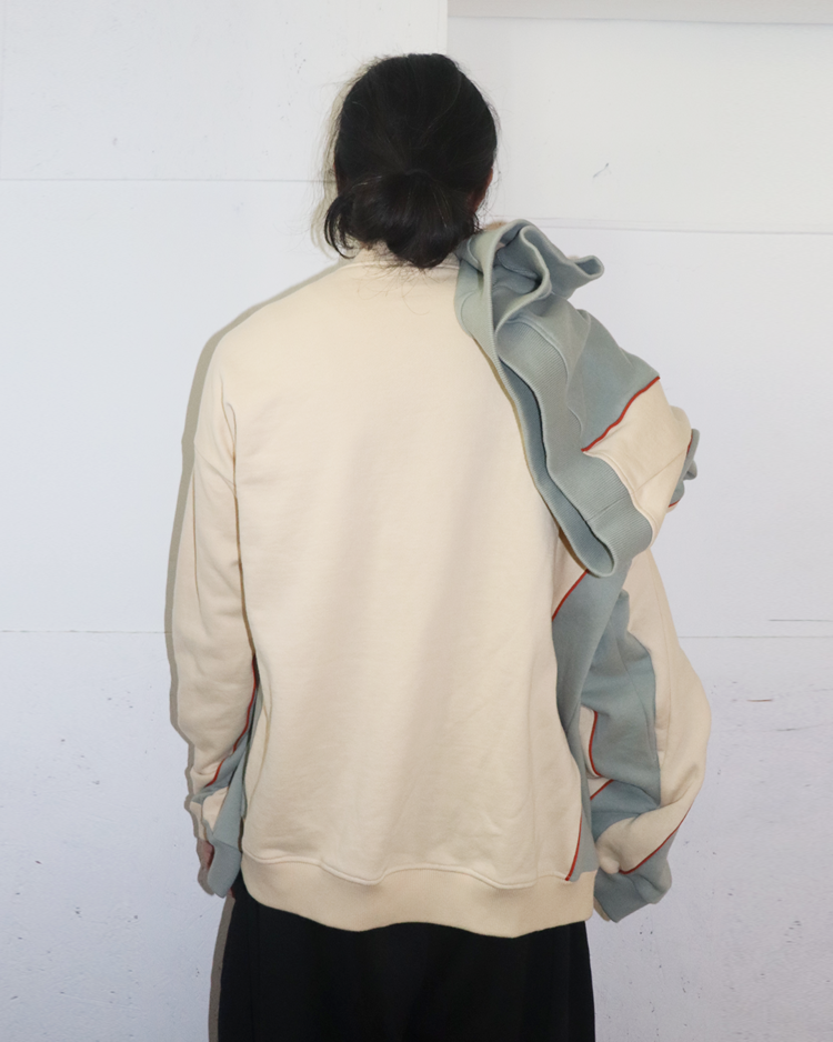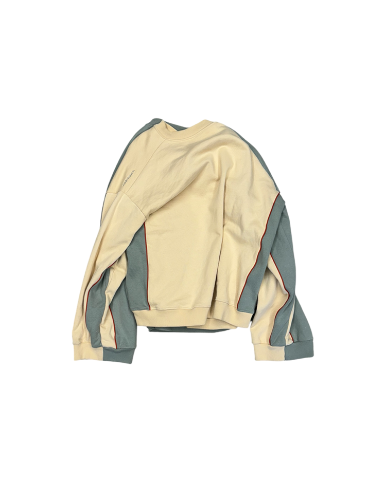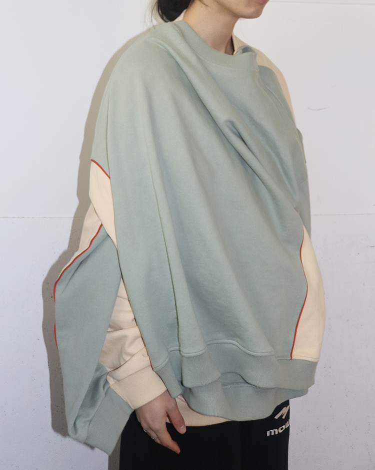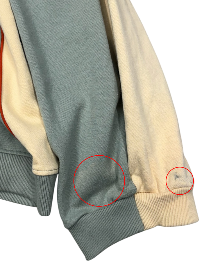해체적 테일러링과 구조 변형을 통해 ‘한 벌이 여러 형태로 변하는 옷’을 제안하는 글렌 마틴스가 이끌었던 브랜드 와이 프로젝트의 제품입니다. 2018AW에 발매된 아이템으로, 파스텔 톤의 그린과 옐로우 스웻셔츠가 더블 레이어드 구조를 이루며, 소매와 바디가 양면으로 전환되는 와이 프로젝트 특유의 실험성이 잘 드러나는 피스입니다. 한 쪽 소매에 오염이 존재합니다.