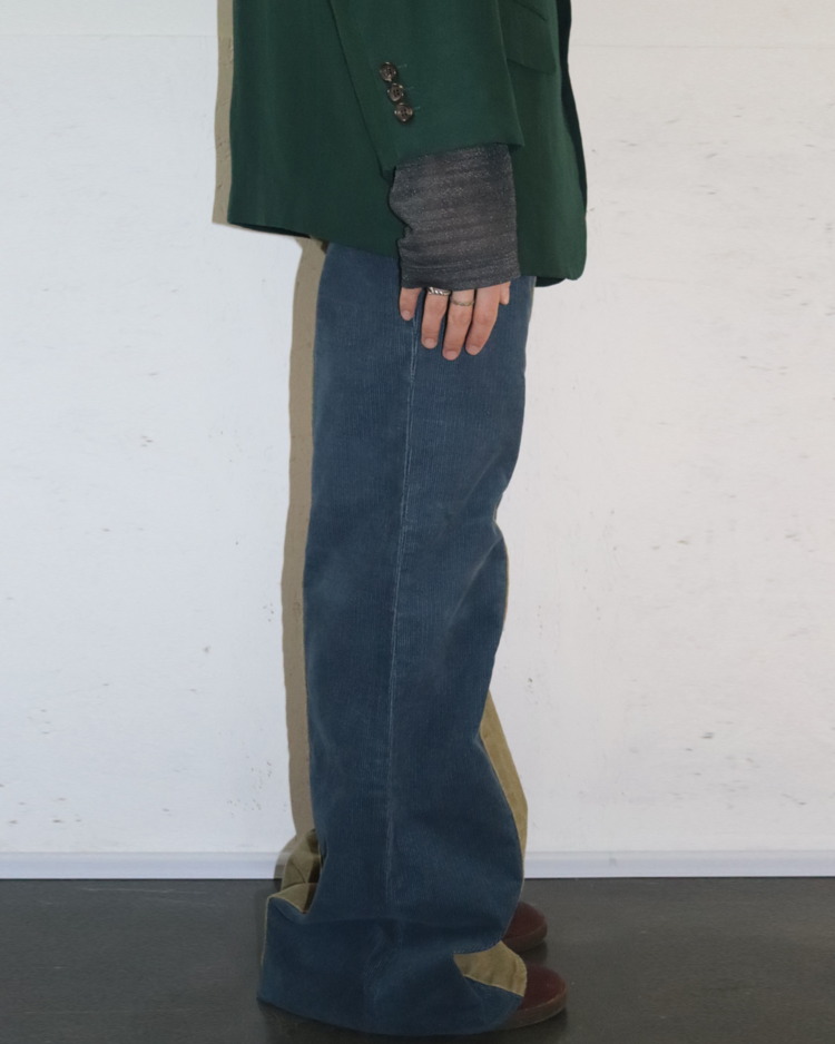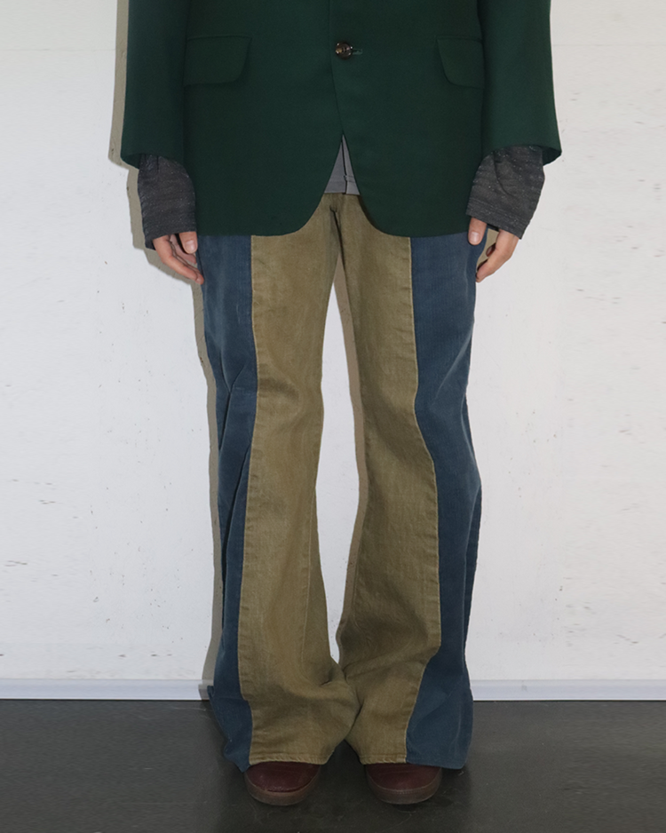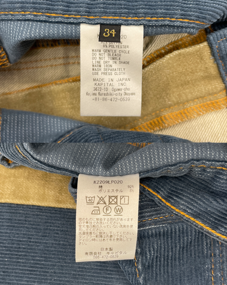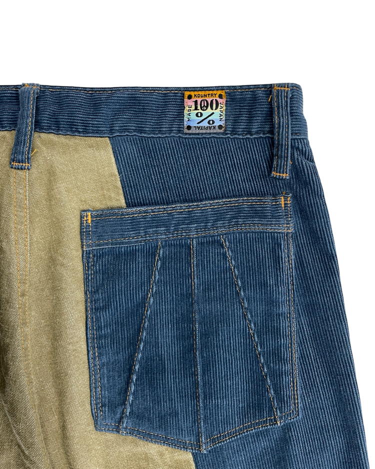 캐피탈의 하이엔드, 아트워크 중심 라인 캐피탈 컨트리의 제품입니다. 넓은 밑단과 플레어한 실루엣이 1960년대의 집시 패션을 연상합니다. 서로 다른 톤의 코듀로이를 과감하게 배치하여, 착용 시에 돋보이는 색 대비가 특징입니다. 또한 플레어 실루엣으로 1960년대의 집시 패션을 연상시키는 레트로한 무드를 더했습니다. 워크웨어 디테일과 빈티지 질감이 공존해, 단독으로도 룩의 중심이 되는 팬츠입니다.