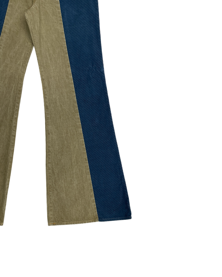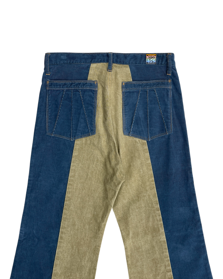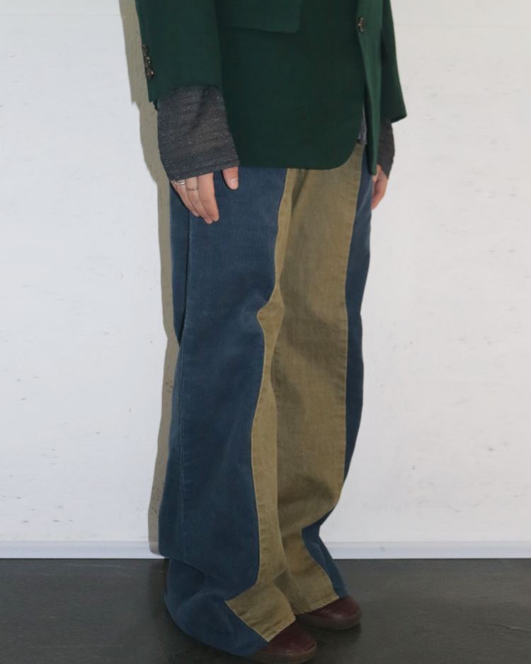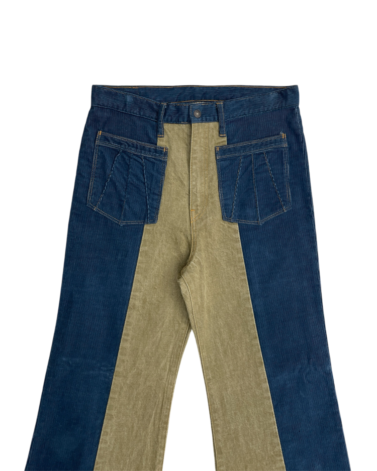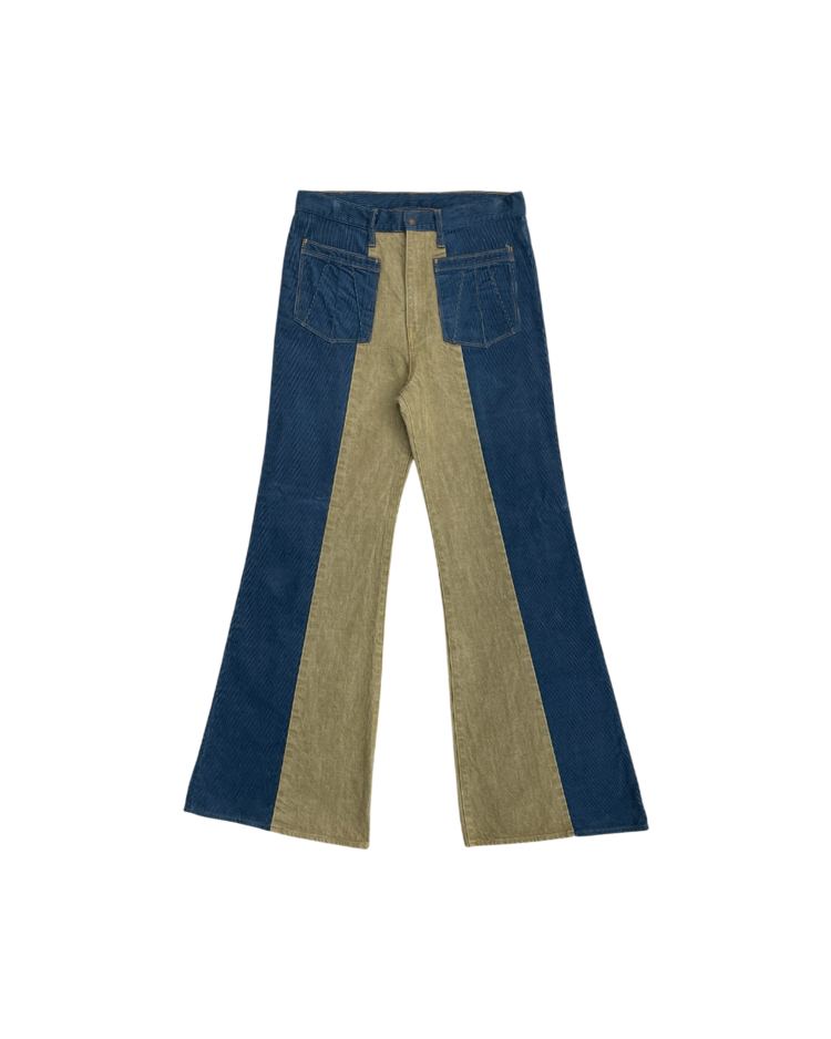캐피탈의 하이엔드, 아트워크 중심 라인 캐피탈 컨트리의 제품입니다. 넓은 밑단과 플레어한 실루엣이 1960년대의 집시 패션을 연상합니다. 서로 다른 톤의 코듀로이를 과감하게 배치하여, 착용 시에 돋보이는 색 대비가 특징입니다. 또한 플레어 실루엣으로 1960년대의 집시 패션을 연상시키는 레트로한 무드를 더했습니다. 워크웨어 디테일과 빈티지 질감이 공존해, 단독으로도 룩의 중심이 되는 팬츠입니다.