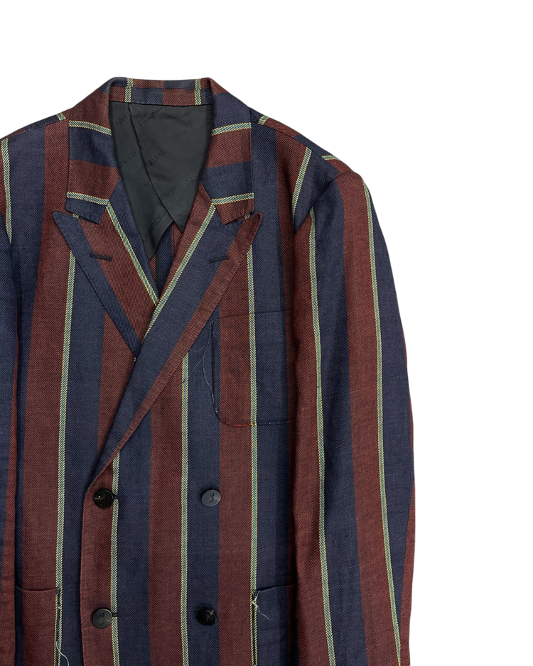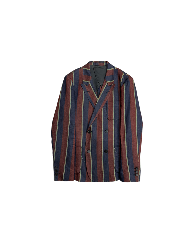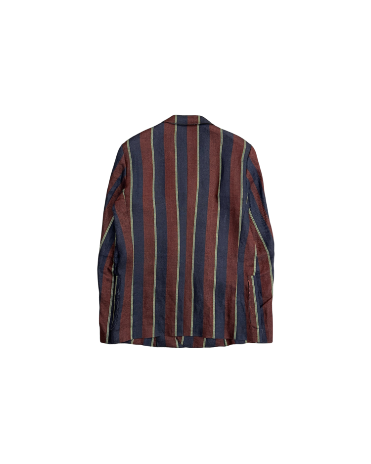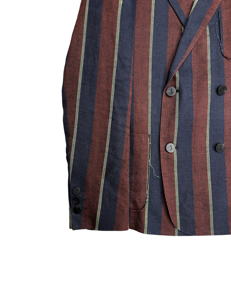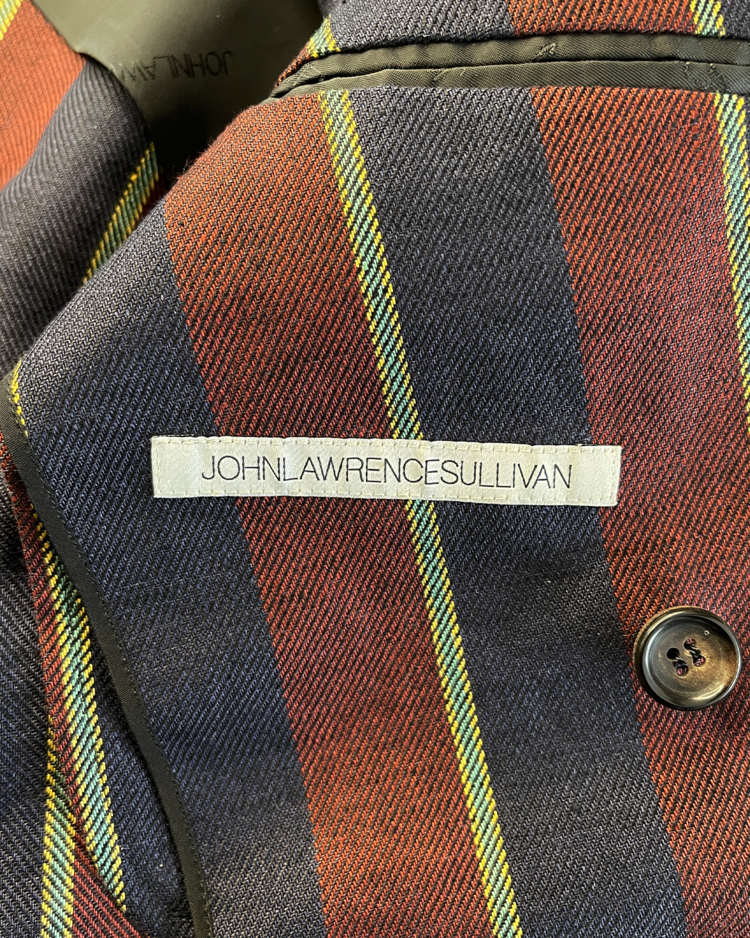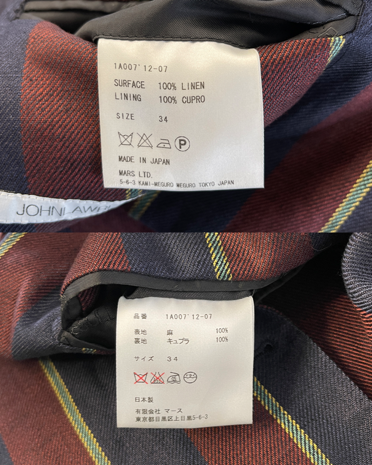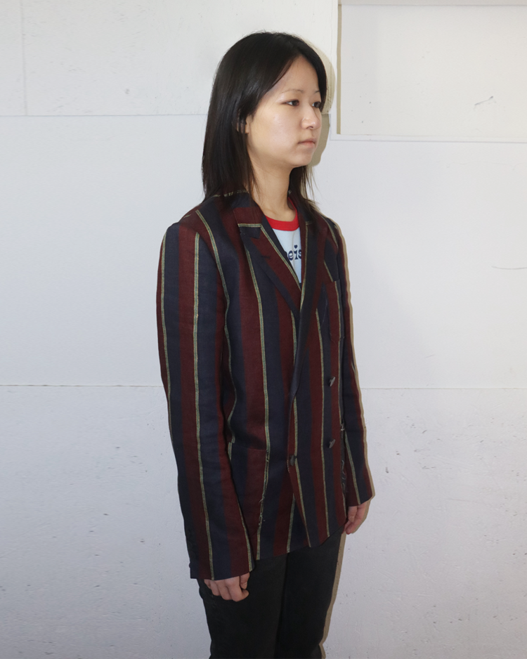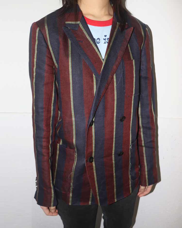 전 프로 복서이자 도쿄 기반 디자이너 아라시 야나가와가 설립한 브랜드 존 로렌스 설리반의 제품입니다. 일본의 고품질 원단과 기하학적 테일러링, 실루엣을 통해 전통적인 남성 테일러링레 예술적 감성, 기술적 정밀함을 결합한 브랜드입니다. 린넨 소재와 스트라이프 패턴이 조화를 이루며 포멀하면서도 개성있는 무드를 완성합니다.