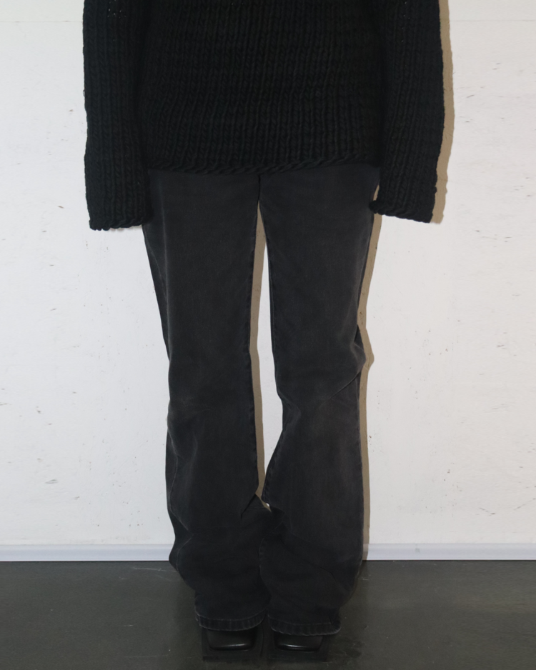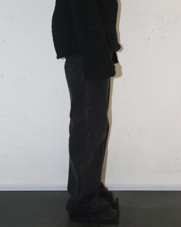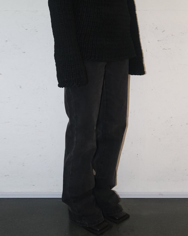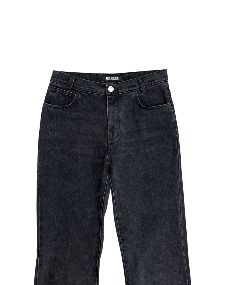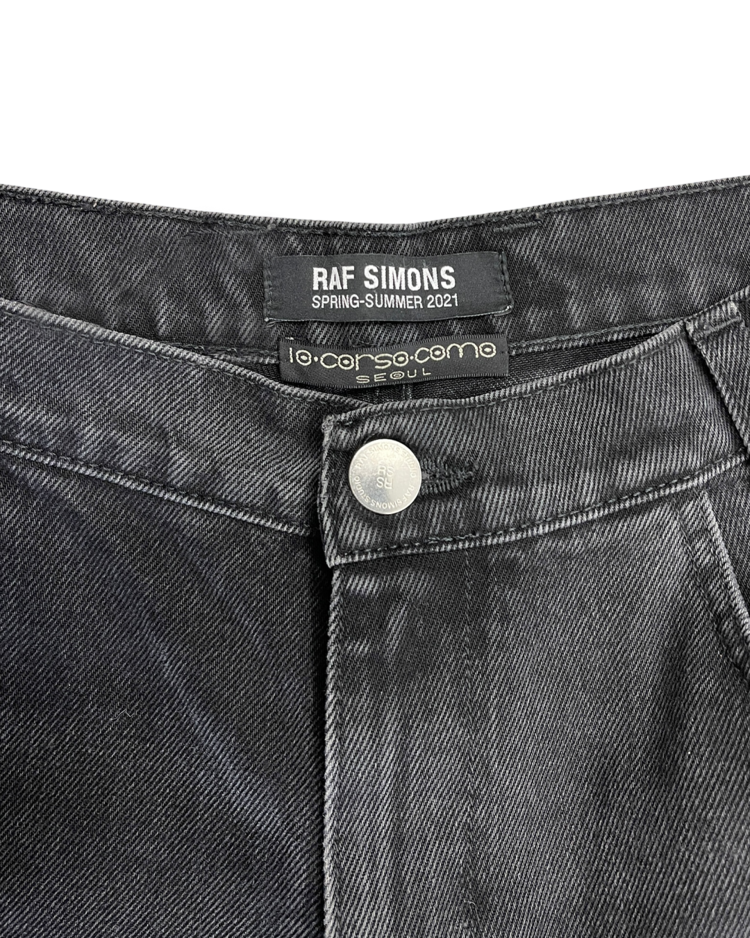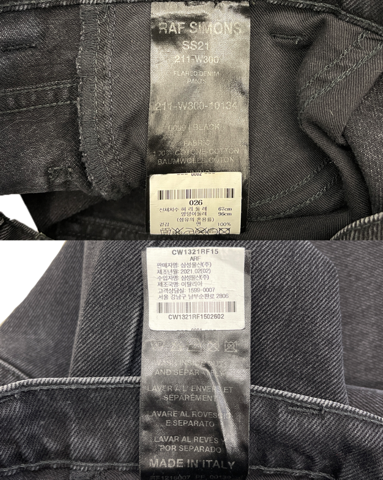 90~00년대 유스 서브컬처를 모던한 테일러링과 실험적 실루엣으로 재해석하는 브랜드 라프 시몬스의 제품입니다. 라프시몬스 최초의 여성복 시즌인 21SS의 제품입니다. 와이드하지만 깔끔한 실루엣이 특징이며, 후면부에 작은 이염 존재합니다.