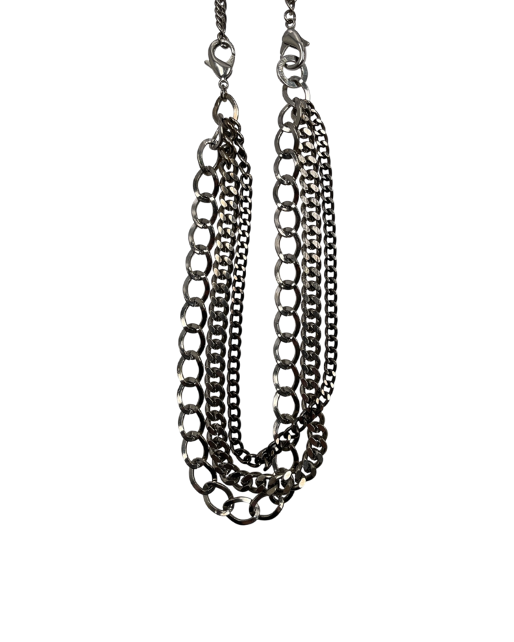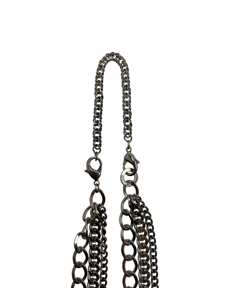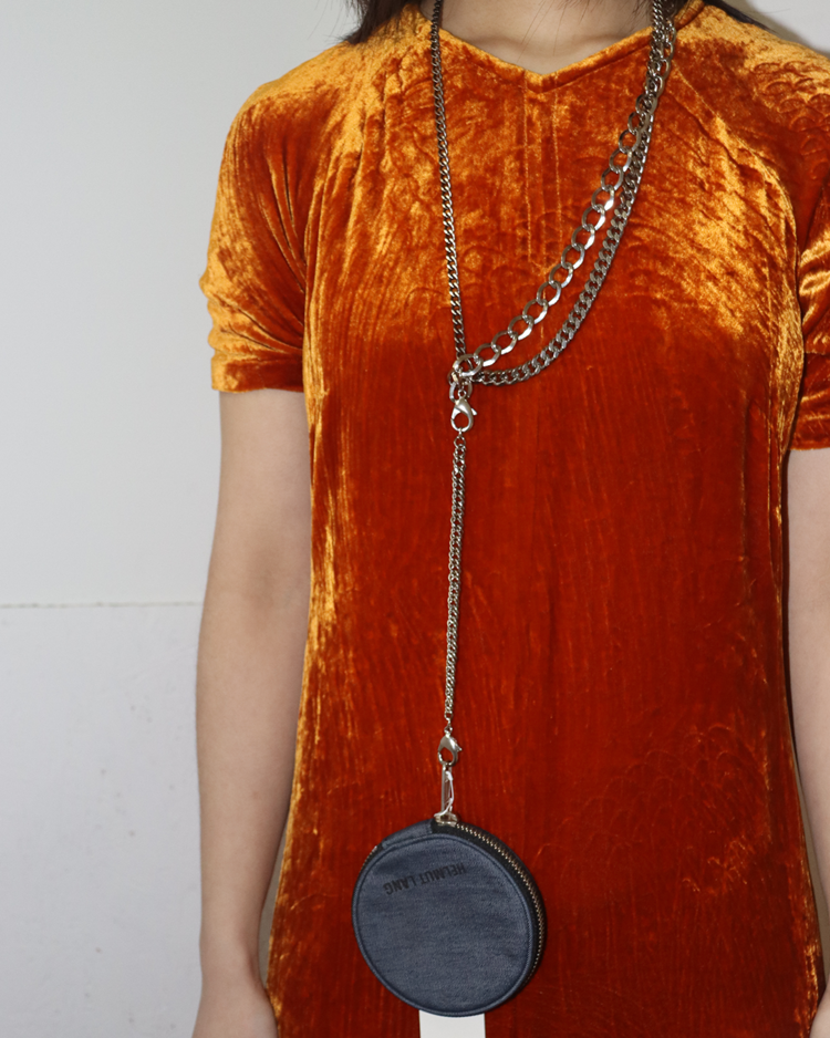 90년대 미니멀리즘에 인더스트리얼 감성을 끌어올리며, 군더더기 없는 실루엣에 산업적 디테일과 관능을 공존시킨 헬무트 랭의 제품입니다. 서로 다른 굵기의 체인 네크리스가 세 겹으로 레이어드 되어 움직임에 따라 입체적인 실루엣을 만듭니다. 체인을 분리하여 팔찌로도 착용이 가능하며, 데님 파우치를 결합하여 착용도 가능합니다.