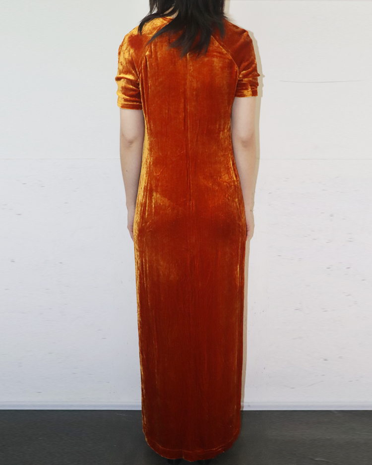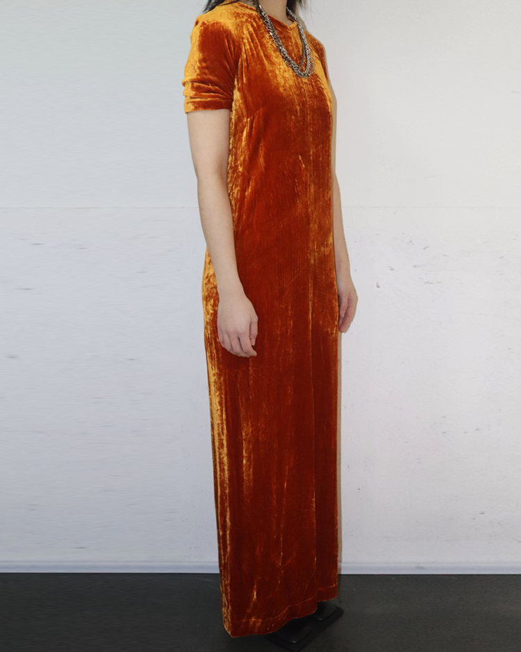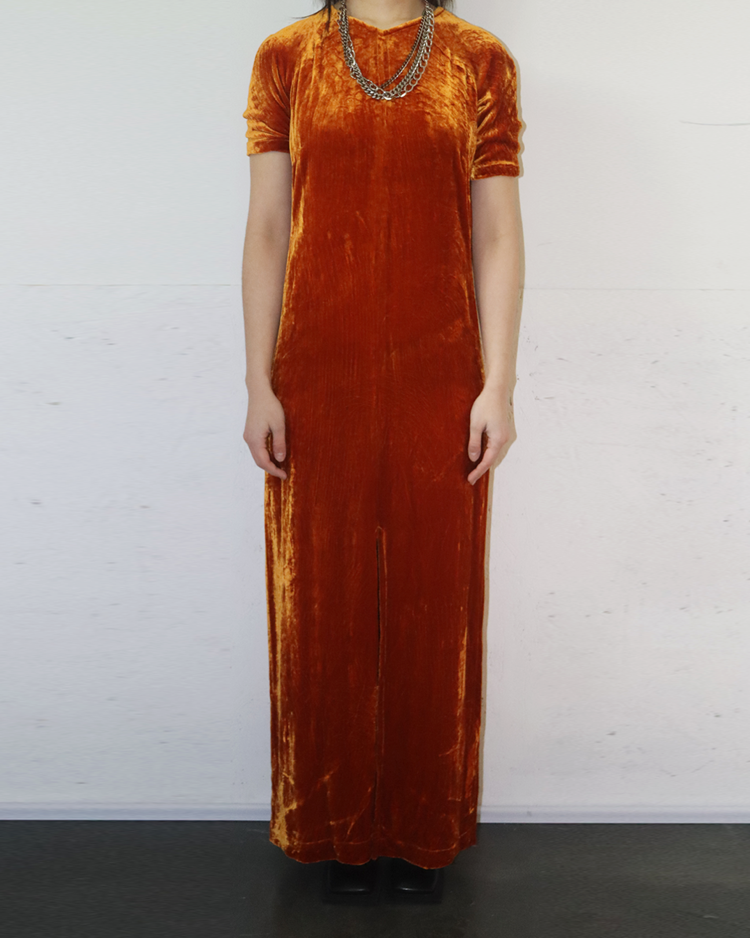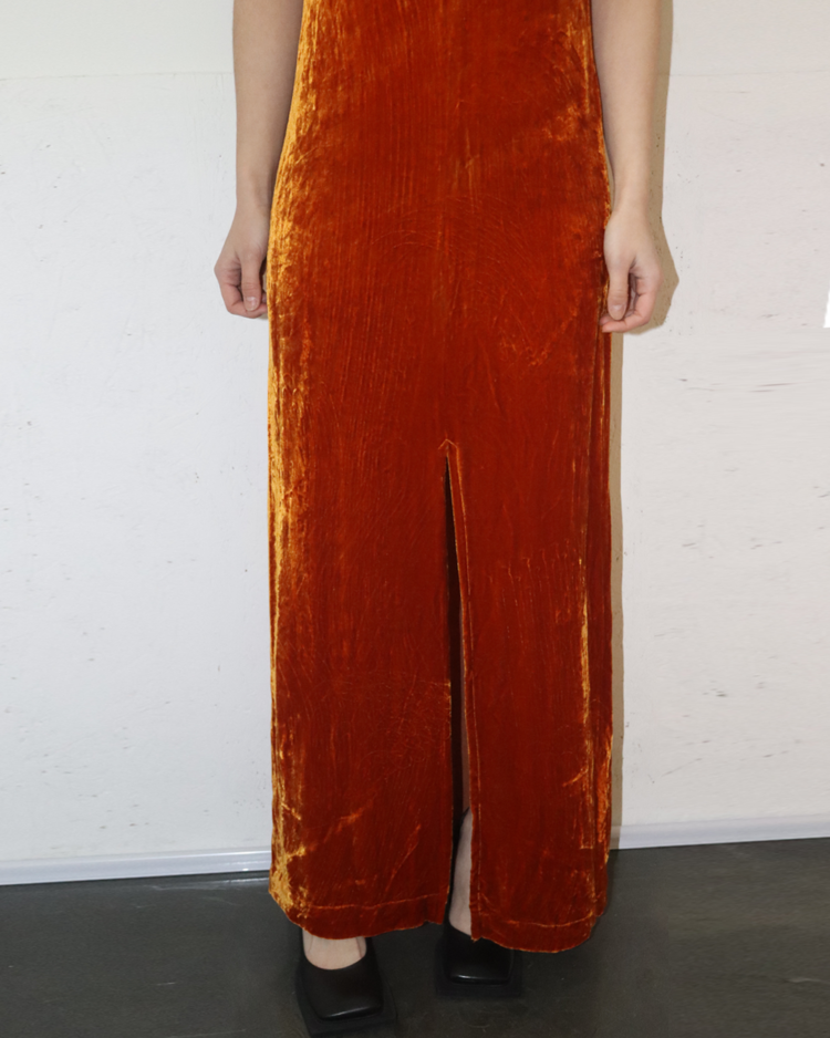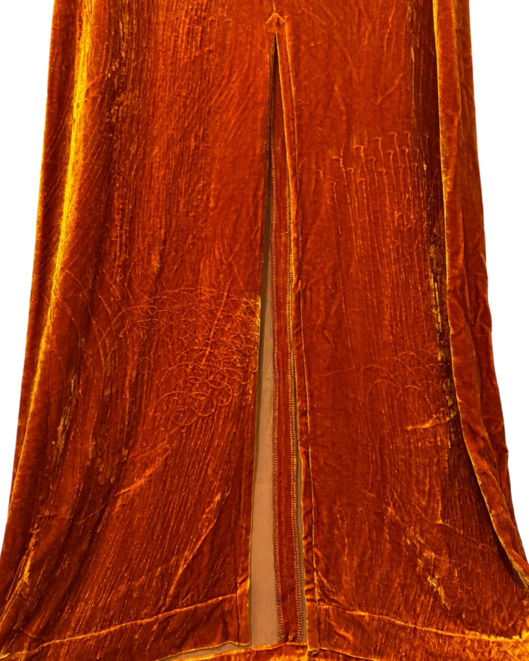 앤트워프 식스 중 한 명인 드리스 반 노튼의 제품입니다. 오렌지 컬러의 벨벳 소재가 빛에 따라 깊이감 있게 반짝이며, 맥시 기장이 우아한 실루엣을 연출합니다. 프론트 슬릿 디테일로 활동성을 더했으며, 절제된 라인과 구조적인 절개선이 관능적인 텍스처를 강조했습니다.