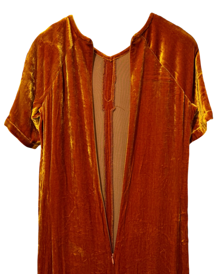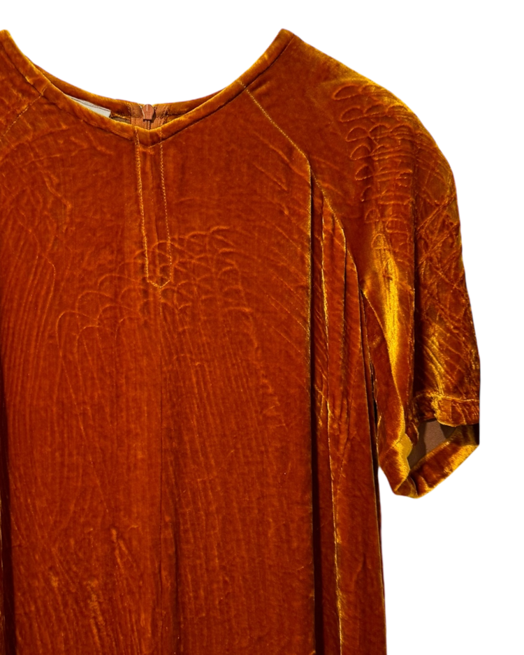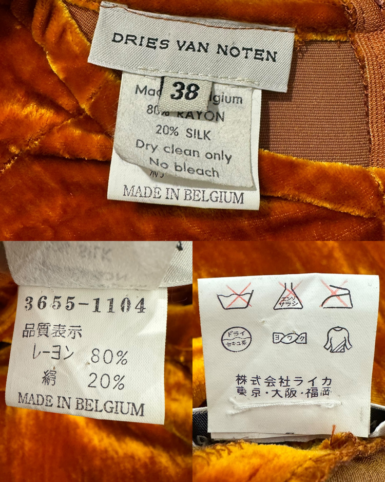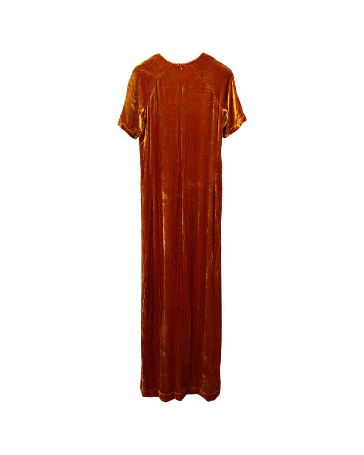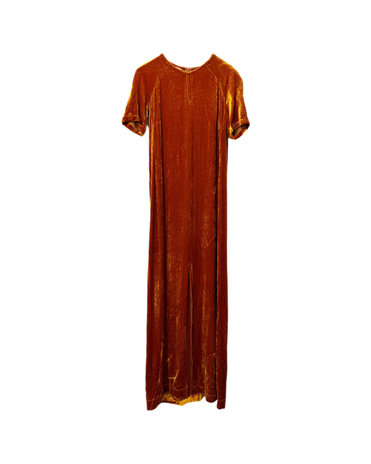 앤트워프 식스 중 한 명인 드리스 반 노튼의 제품입니다. 오렌지 컬러의 벨벳 소재가 빛에 따라 깊이감 있게 반짝이며, 맥시 기장이 우아한 실루엣을 연출합니다. 프론트 슬릿 디테일로 활동성을 더했으며, 절제된 라인과 구조적인 절개선이 관능적인 텍스처를 강조했습니다.