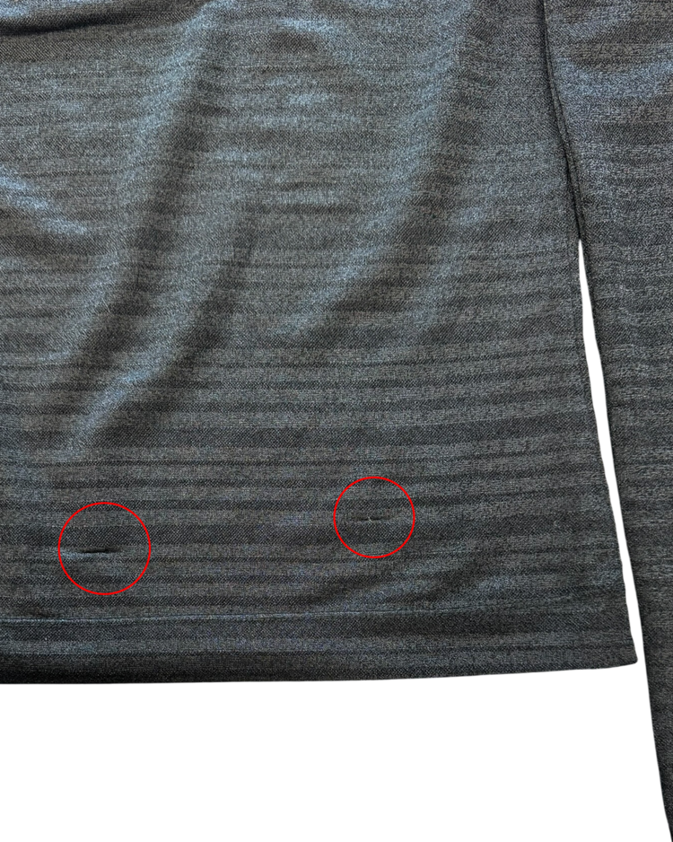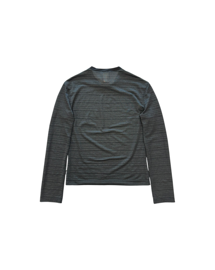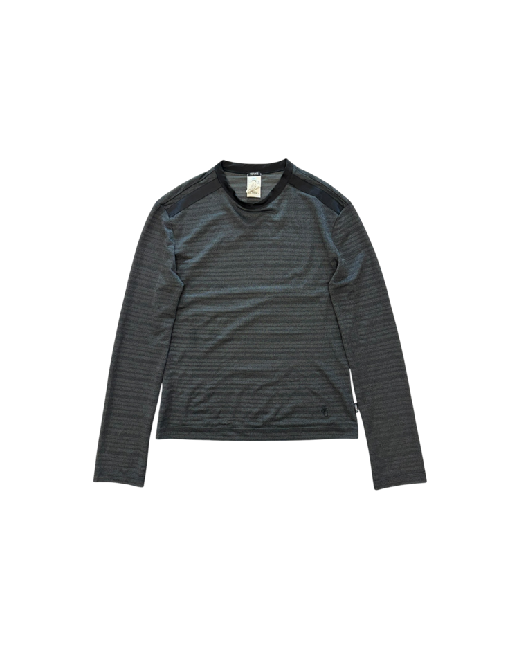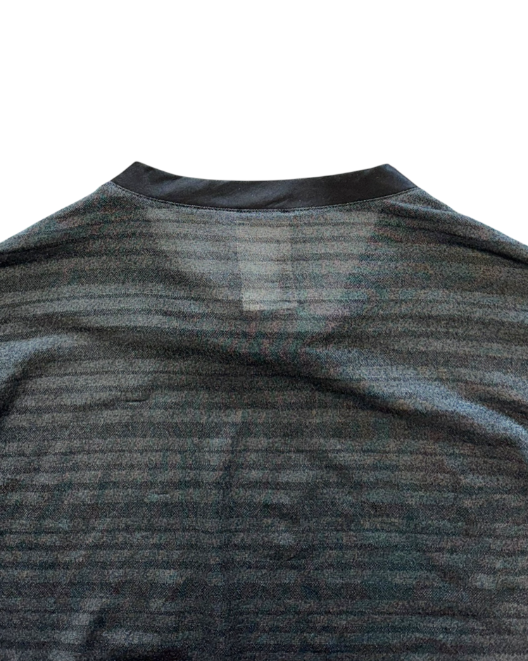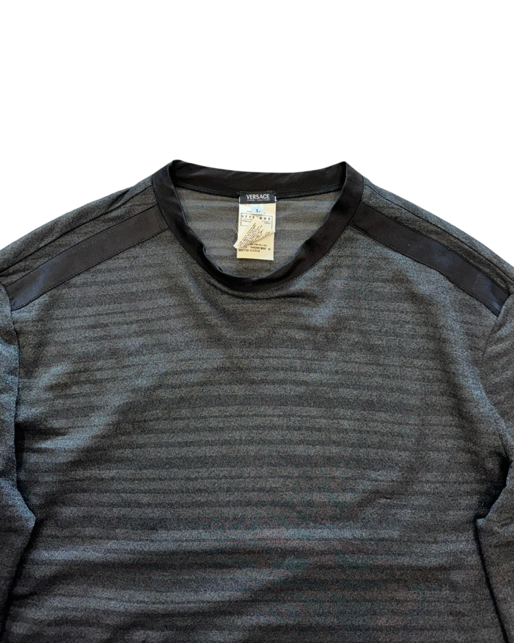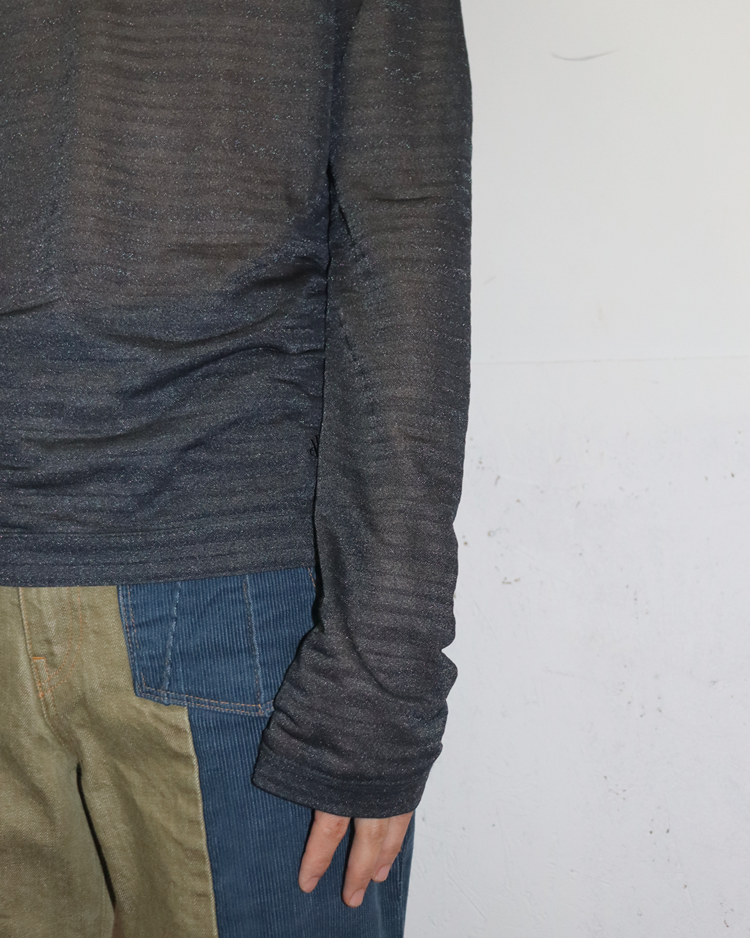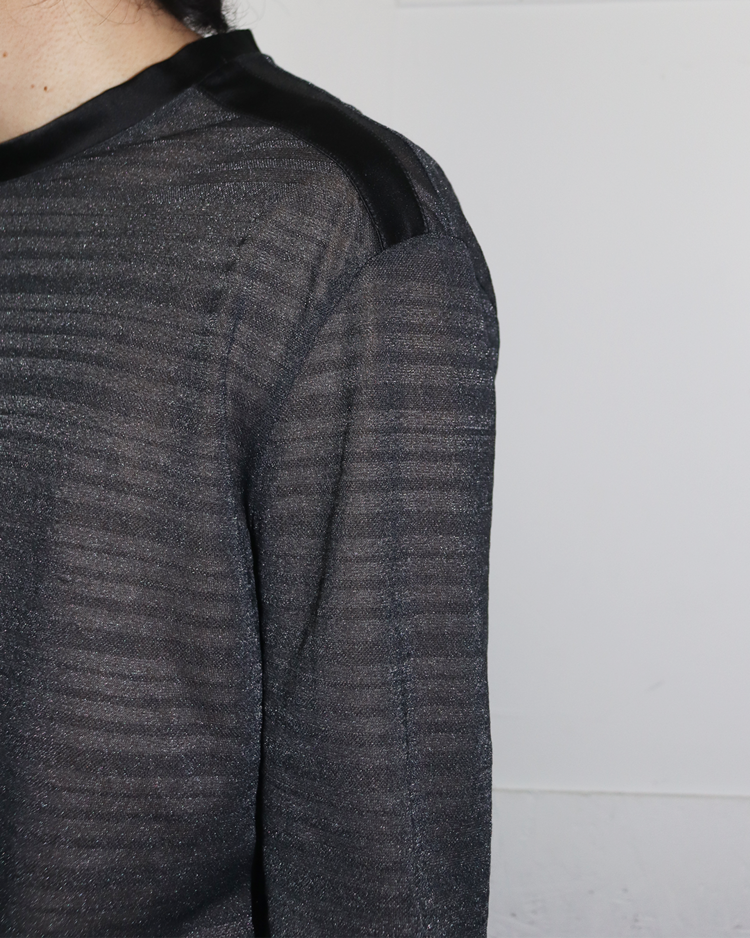 화려한 프린트, 대담한 컬러와 메두사 로고로 강렬한 미학을 보여주는 이탈리아의 럭셔리 패션하우스 베르사체의 제품입니다. 은은한 글리터가 섞인 시스루 롱슬리브로, 얇은 스트라이프 텍스처가 빛에 따라 미묘하게 반짝이며, 넥 라인과 숄더 라인에는 매끈한 트리밍 디테일을 추가 했습니다. 단독으로도, 레이어드 아이템으로도 관능적인 무드를 연출할 수 있는 아이템입니다.