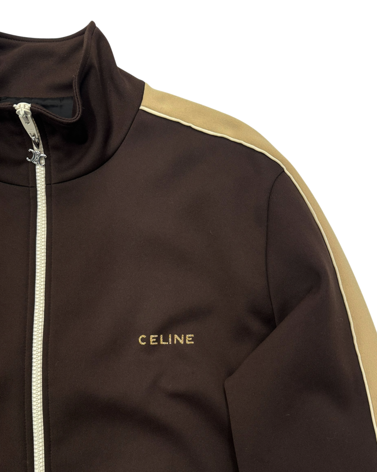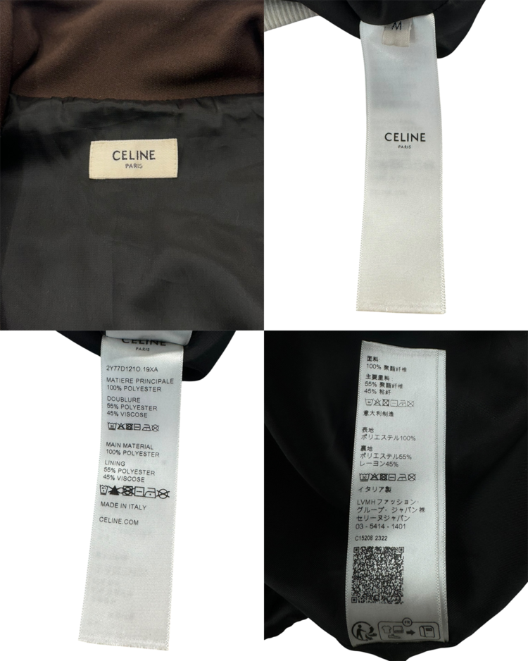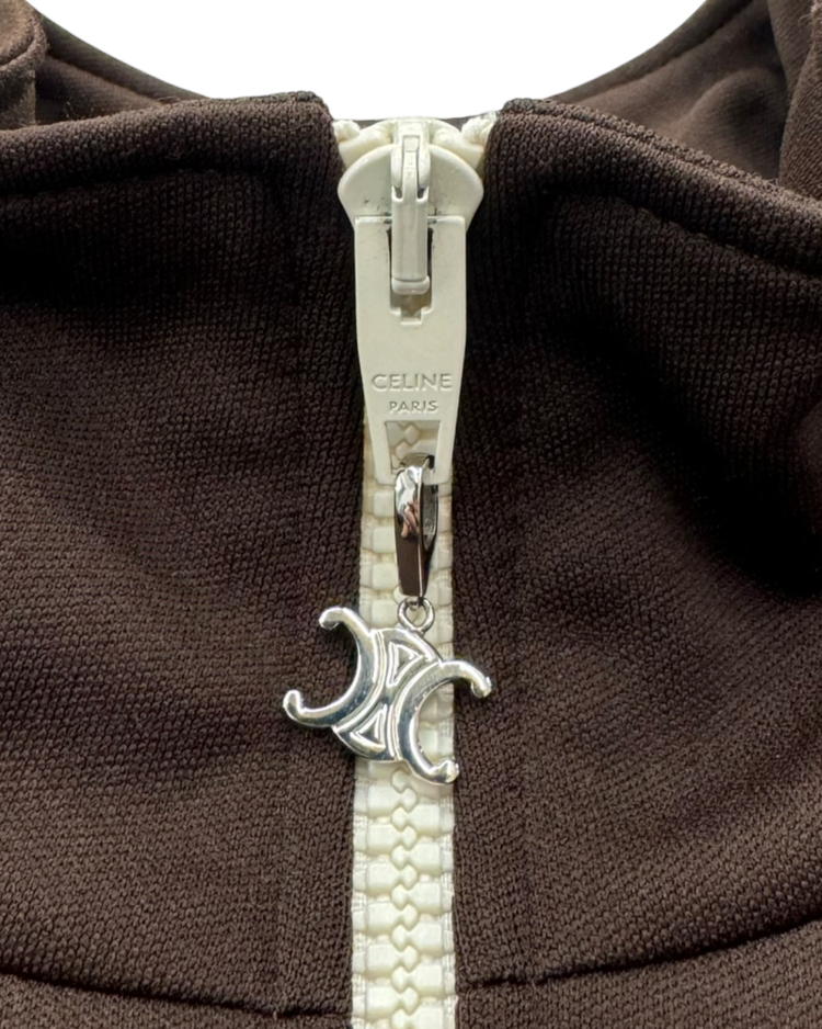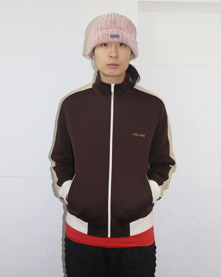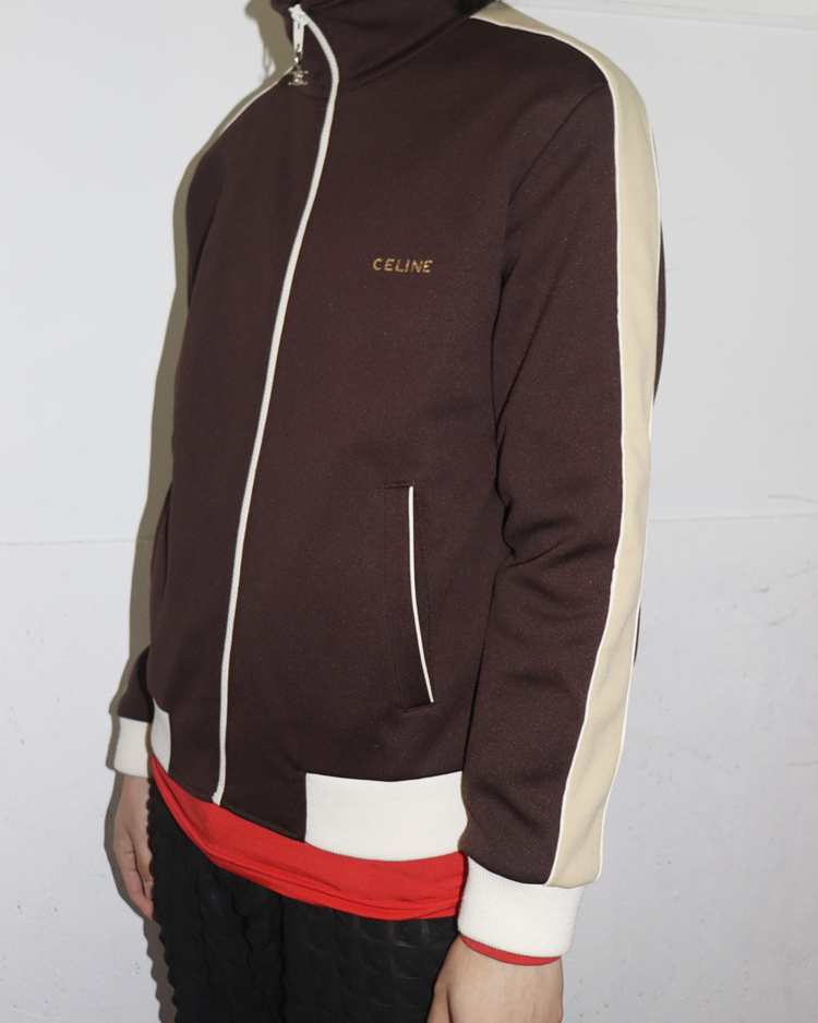 실루엣·소재·테일러링 쪽에 무게를 두며, 절제된 럭셔리 RTW를 선보였던 파리 하우스 셀린느의 제품입니다. 하우스의 미니멀 헤리티지 위에 자신의 시그니처인 록 시크와 유스 컬처를 브랜드의 새로운 DNA로 주입했던 에디 슬리먼 시기의 23AW 런웨이 피스로, 골드 글리터 디테일이 강한 포인트를 주는 트랙 자켓입니다. 래글런, 숄더 테이핑 라인, 포켓·지퍼 스티치 노출 최소화로 실루엣을 깔끔하게 유지했으며, 소매와 밑단의 와이드 리브드 마감으로 실루엣을 단단히 고정해 "짧고 타이트한” 에디 슬리먼식 밸런스를 완성시켰습니다.
