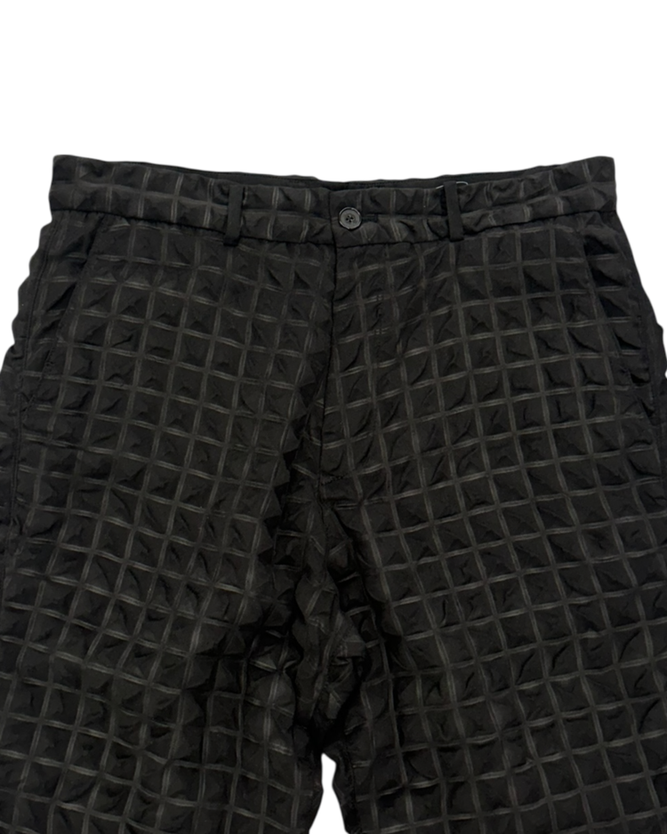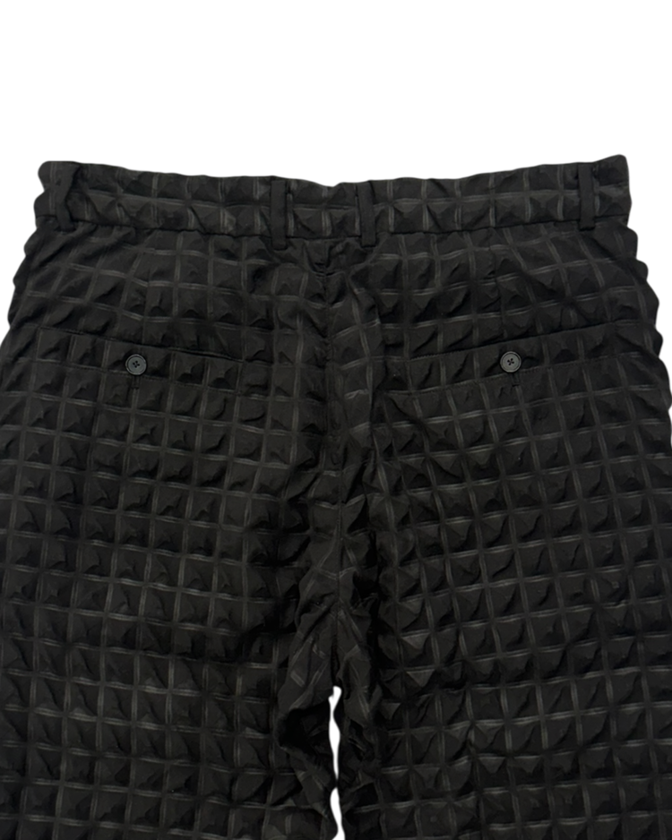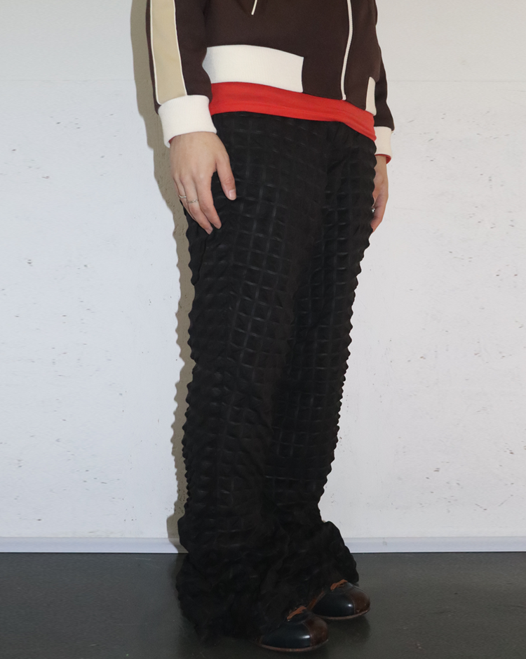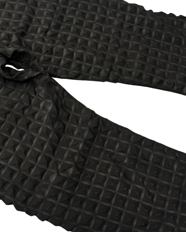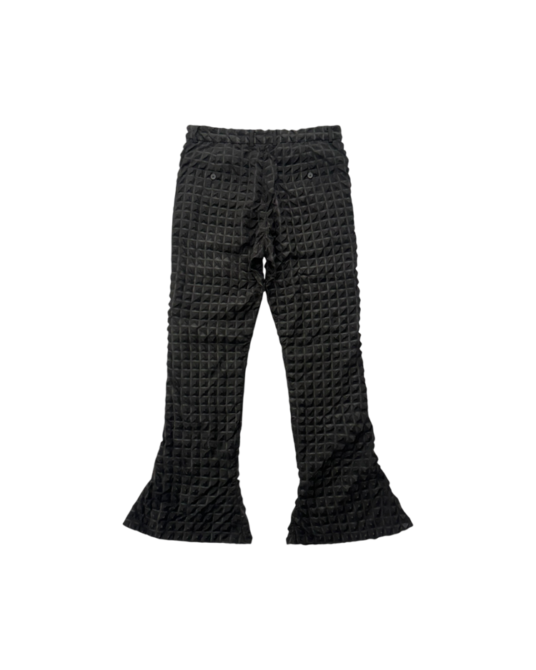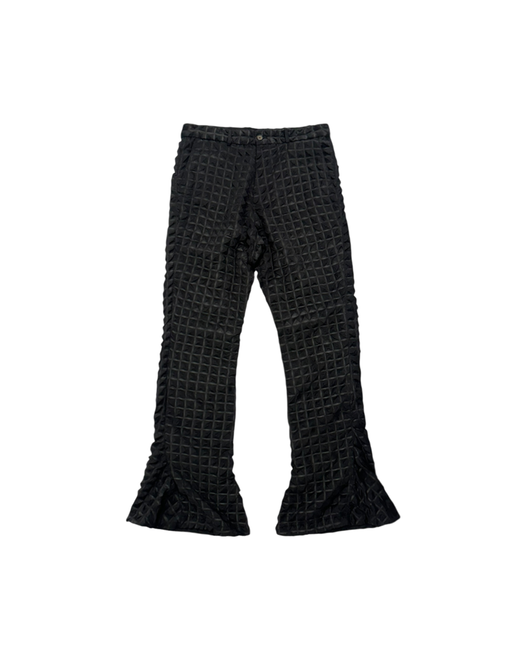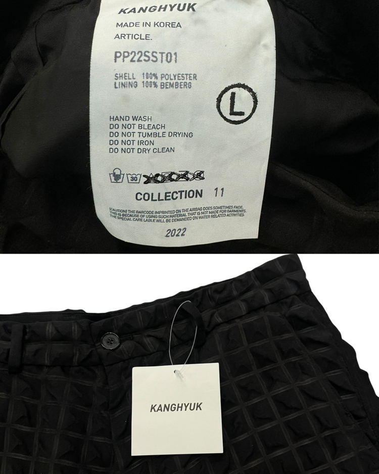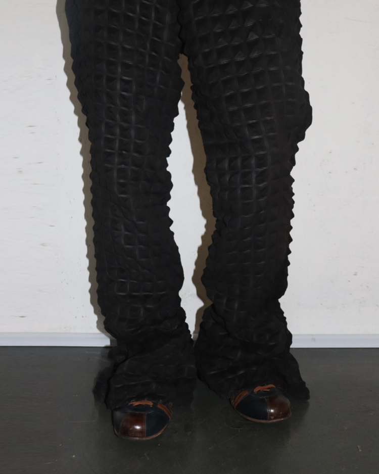 에어백 원단을 재해석한 실험적 소재 접근으로 주목받는 서울 기반 브랜드 강혁의 제품입니다. 22SS 시즌 플레어 컷 트라우저로, 비건 소재에 입체적인 그리드 텍스처를 더해 독특한 구조감을 강조했습니다. 무릎 아래로 퍼지는 실루엣과 자연스러운 주름 디테일이 결합되어 브랜드 특유의 테크니컬하면서도 조형적인 무드를 완성했습니다.