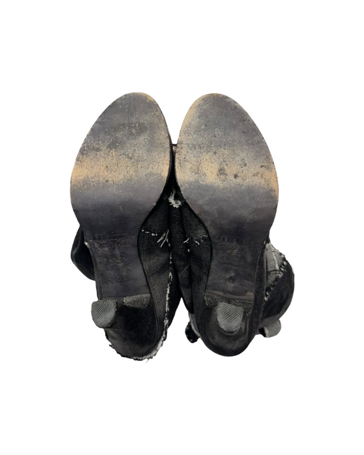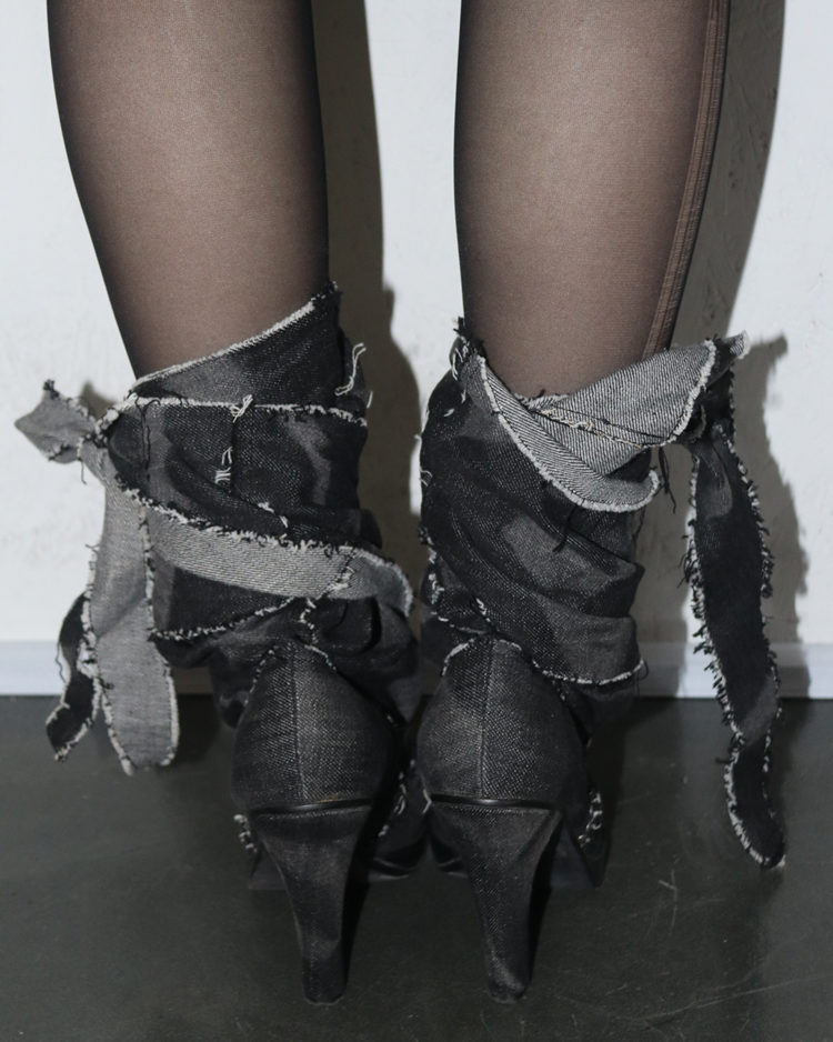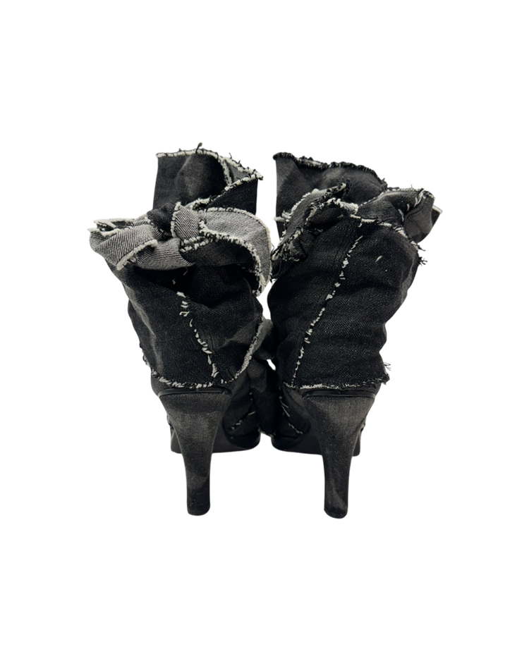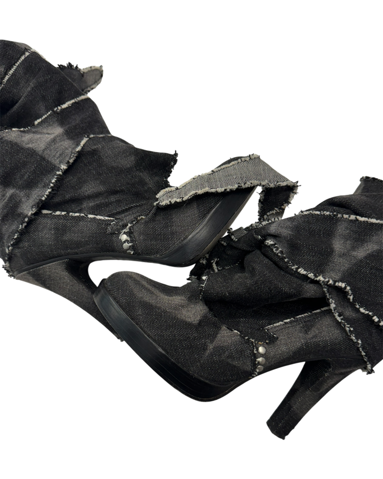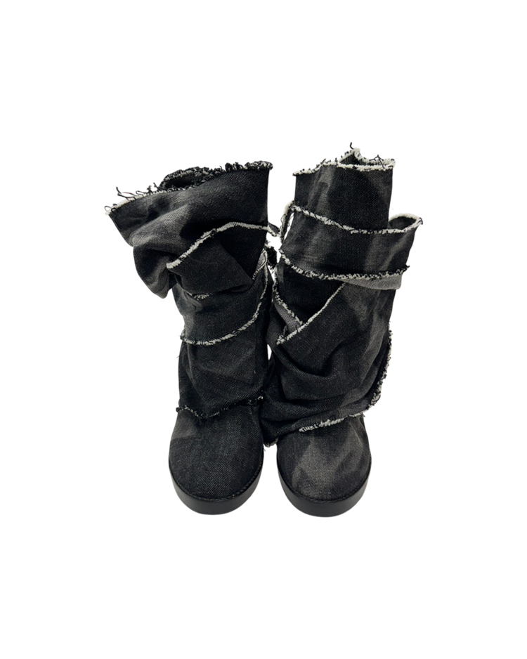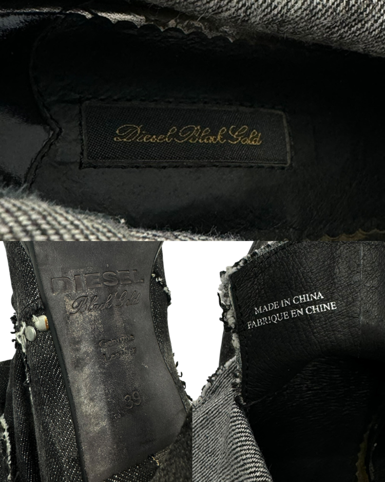 밀리터리와 인더스트리얼 무드를 기반으로 전개했던 디젤의 하이엔드 라인 디젤 블랙 골드의 제품입니다. 롤업된 듯 겹겹이 쌓인 데님 패널과 러프 컷 엣지, 노출 스티치가 구조적인 볼륨을 만들며, 라운드토, 힐과 플랫폼 솔이 대비를 이룹니다. 블랙 워시 데님의 질감과 해체적 봉제가 인상적인 피스입니다.