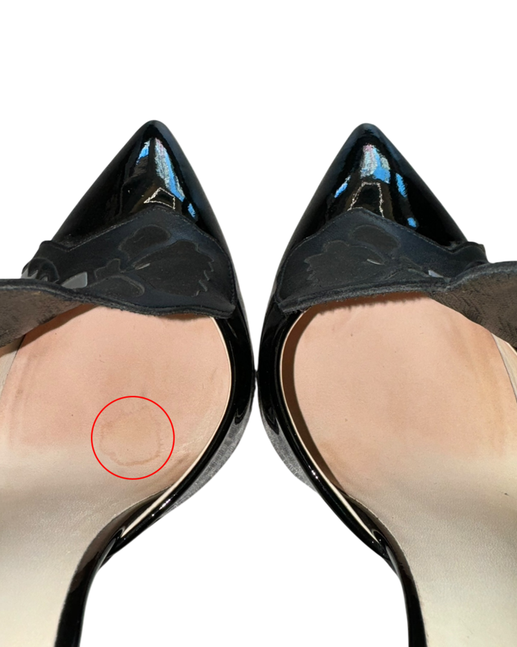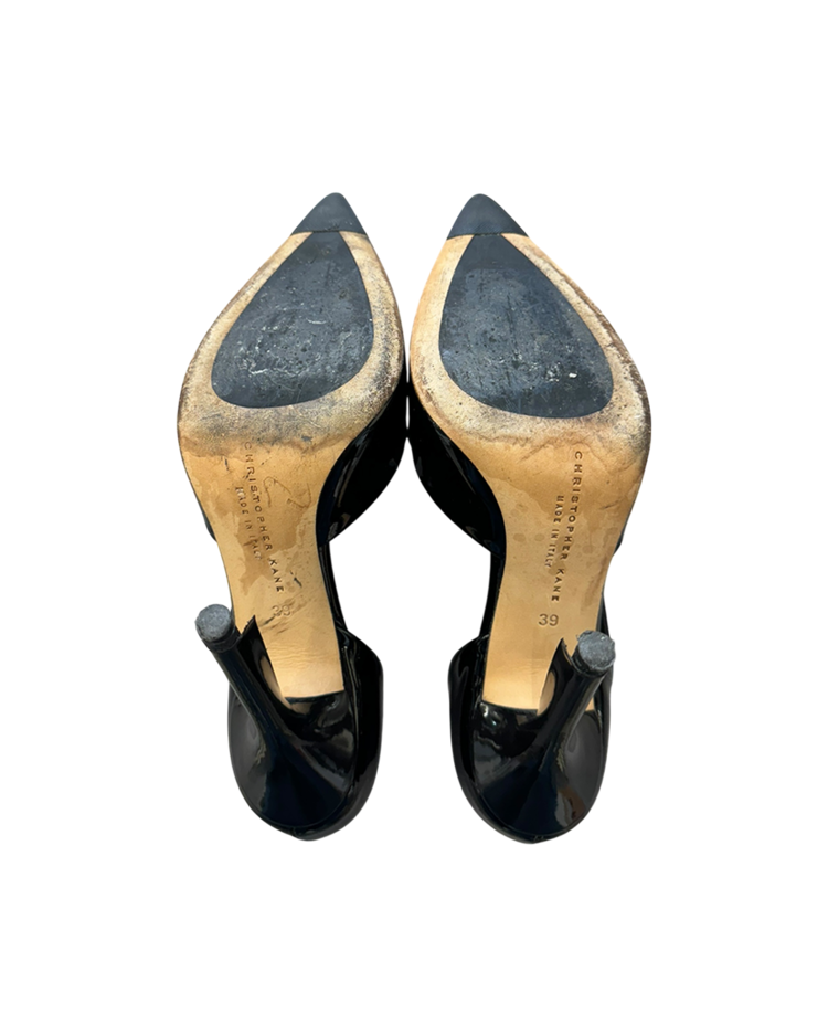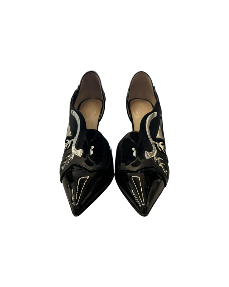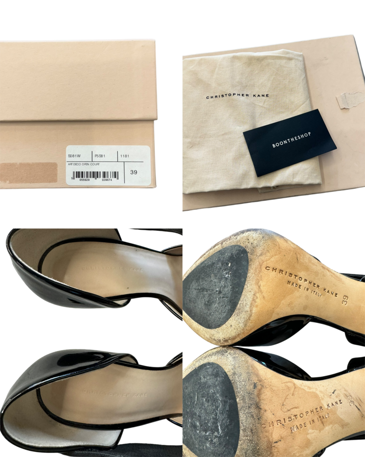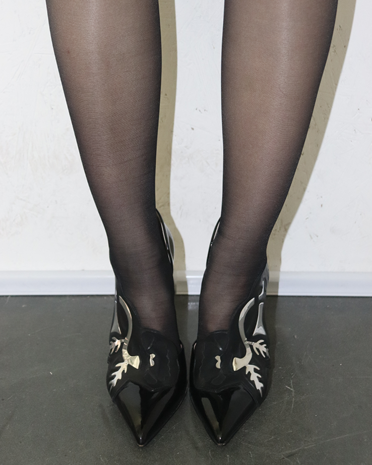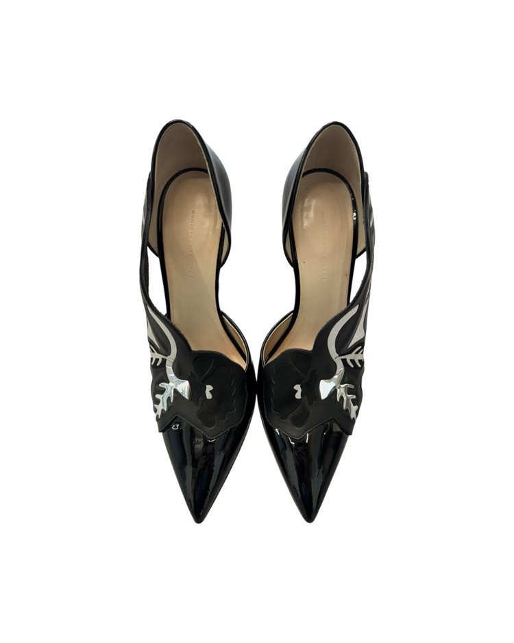 과학적 상상력과 아방가르드한 장식을 결합해 런던 패션 신에서 독보적인 미학을 구축해온 디자이너 브랜드 크리스토퍼 케인의 제품입니다. 블랙 페이턴트 가죽 위에 아르데코에서 영감 받은 메탈릭 모티프를 더한 스틸레토 하이힐로, 날카로운 실루엣과 곡선 컷아웃이 대비를 이루는 조형적인 피스입니다.