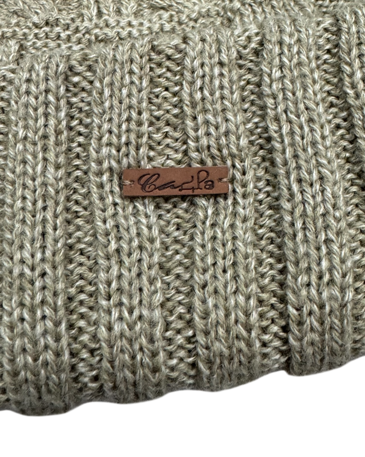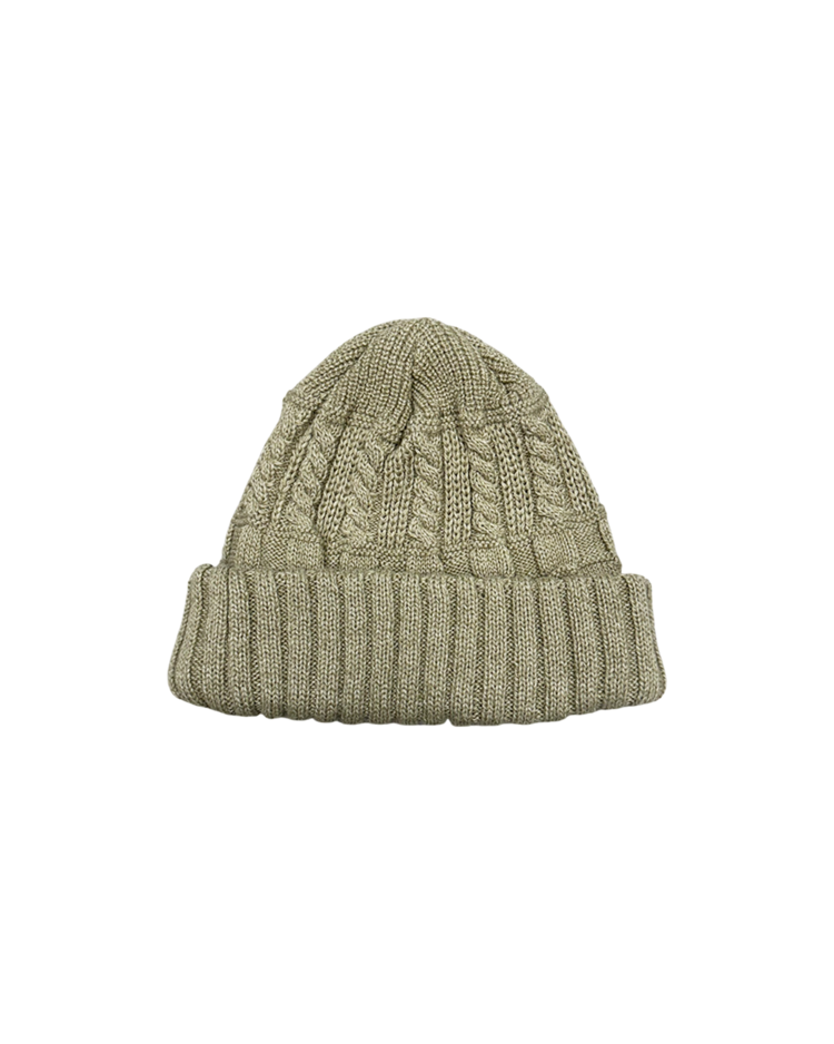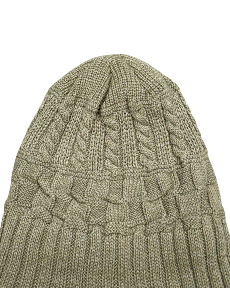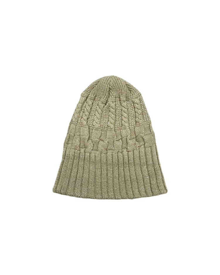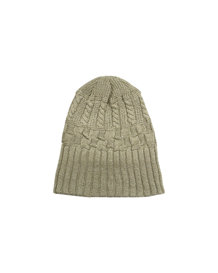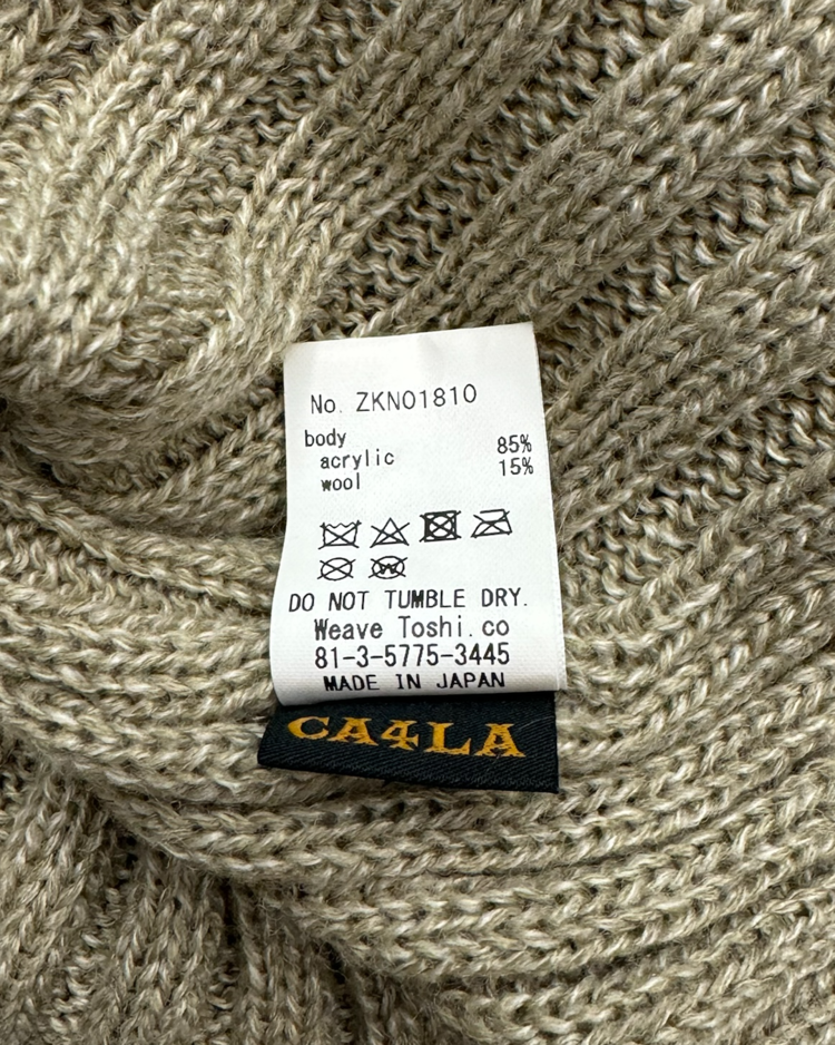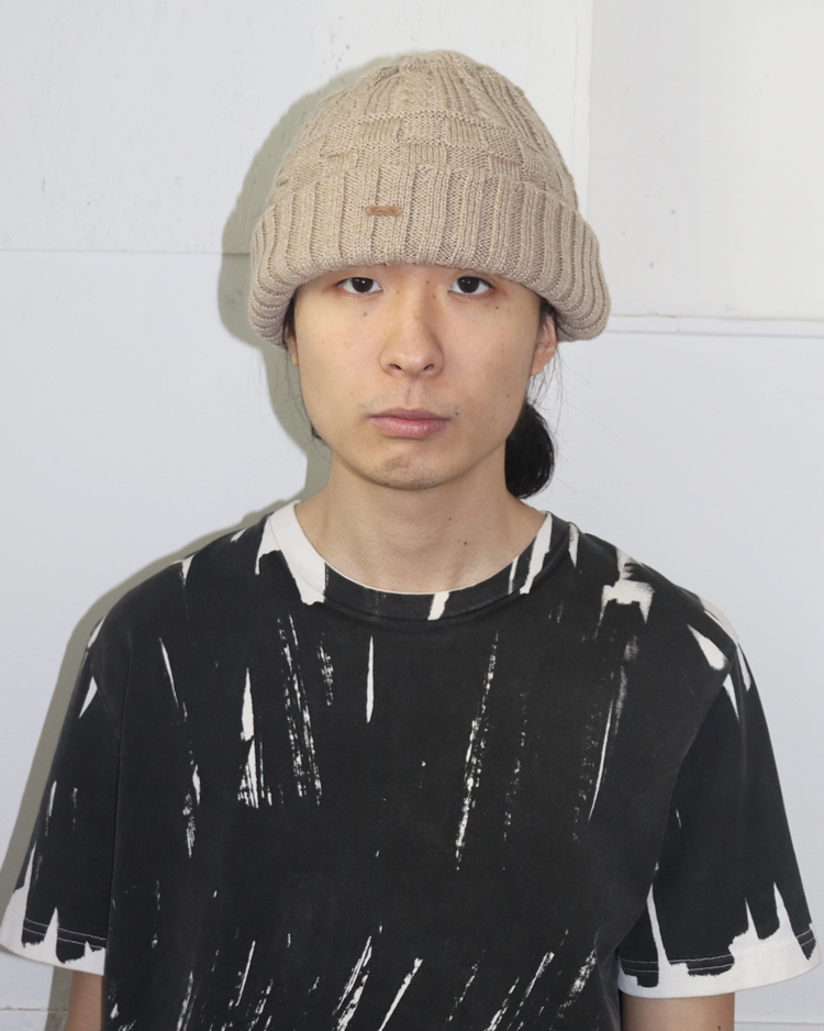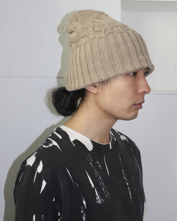 장인 기반의 니팅 기술과 개성 있는 실루엣으로 많은 팬층을 확보하며, 일본을 대표하는 모자 전문 브랜드로 자리 잡은 ca4la의 제품입니다. 케이블 니트와 리브 조직을 믹스한 입체적인 짜임이 특징인 비니입니다. 상단은 굵은 케이블 패턴, 중단은 볼드한 브레이드 텍스처, 하단은 리브 조직을 배치했으며, 톤 다운된 오트밀 베이지 컬러로 니트 질감을 강조했습니다.