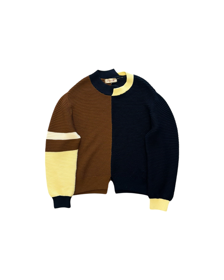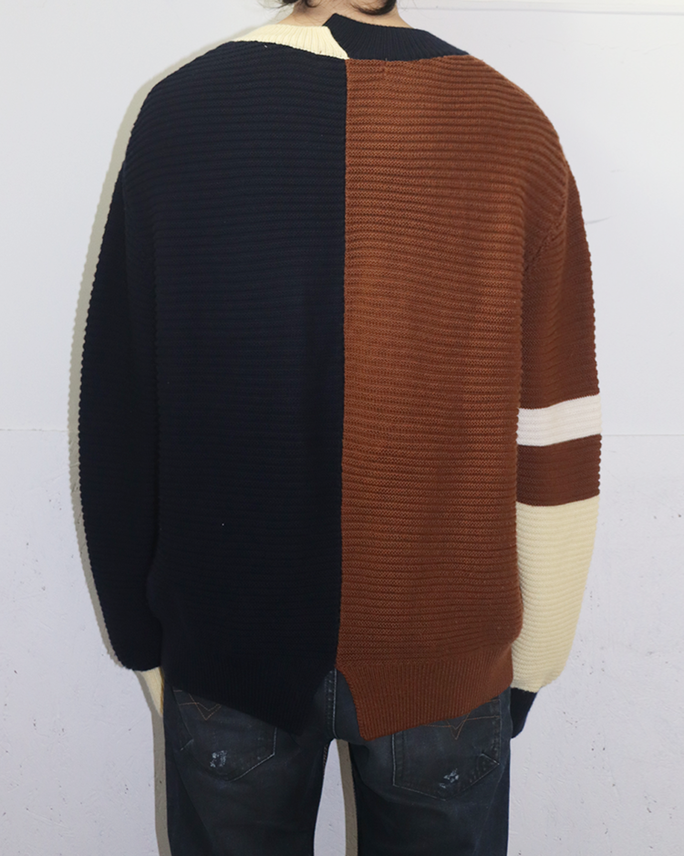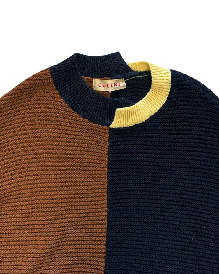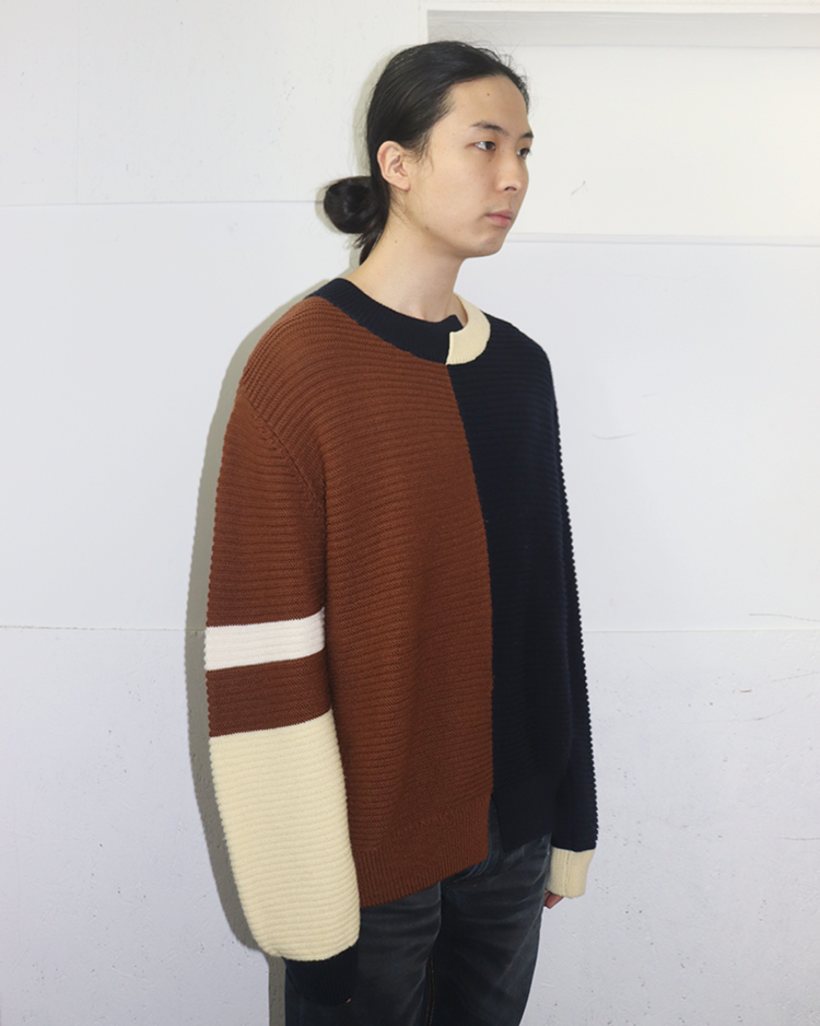 테일러링을 기반으로 한 정제된 실루엣에 절제된 배색과 비대칭 디테일을 더해 차분하면서도 세련된 컨템포러리 무드를 전개하는 일본 브랜드 CULLNI의 제품입니다. 2020AW 시즌의 스웨터로, 브라운과 네이비를 중심으로 한 컬러 블로킹이 특징입니다. 미니멀한 구조에서 비대칭 디테일과 컬러 대비로 모던하고 세련된 분위기를 강조한 아이템입니다.
