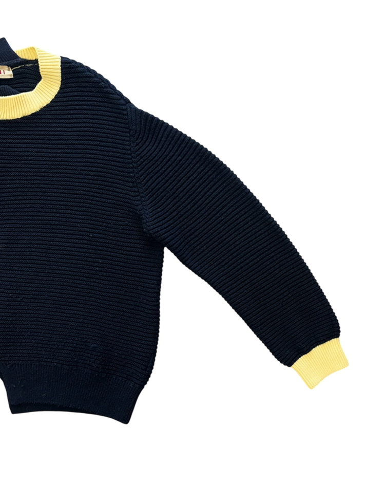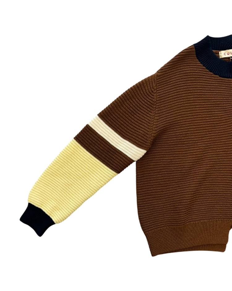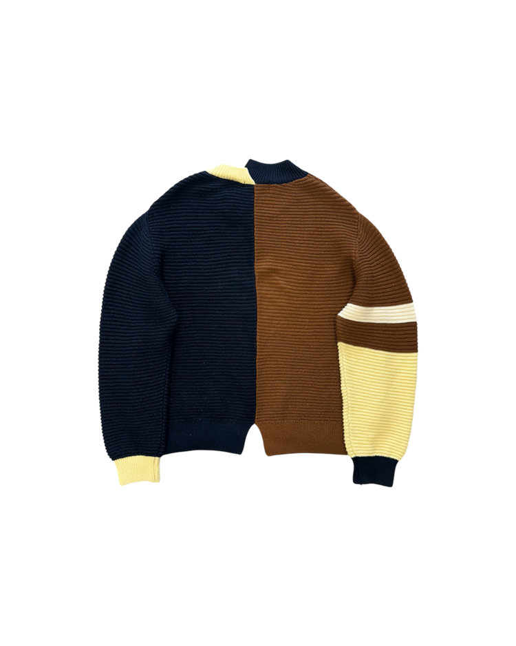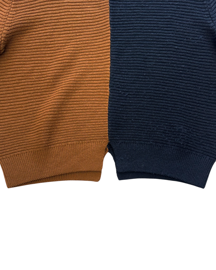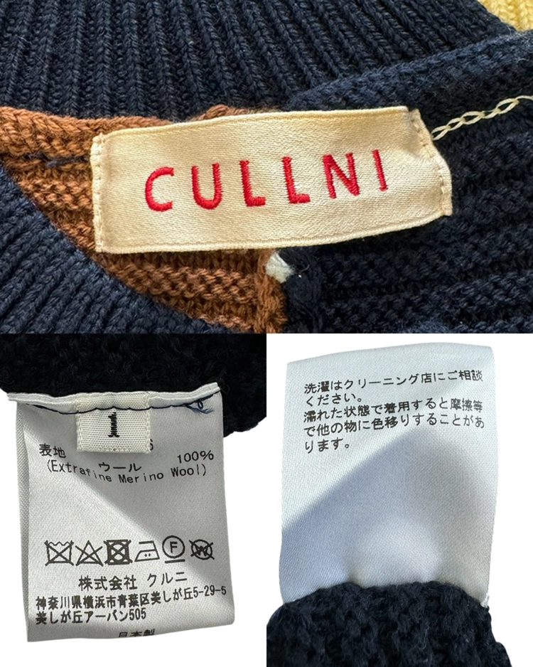 테일러링을 기반으로 한 정제된 실루엣에 절제된 배색과 비대칭 디테일을 더해 차분하면서도 세련된 컨템포러리 무드를 전개하는 일본 브랜드 CULLNI의 제품입니다. 2020AW 시즌의 스웨터로, 브라운과 네이비를 중심으로 한 컬러 블로킹이 특징입니다. 미니멀한 구조에서 비대칭 디테일과 컬러 대비로 모던하고 세련된 분위기를 강조한 아이템입니다.