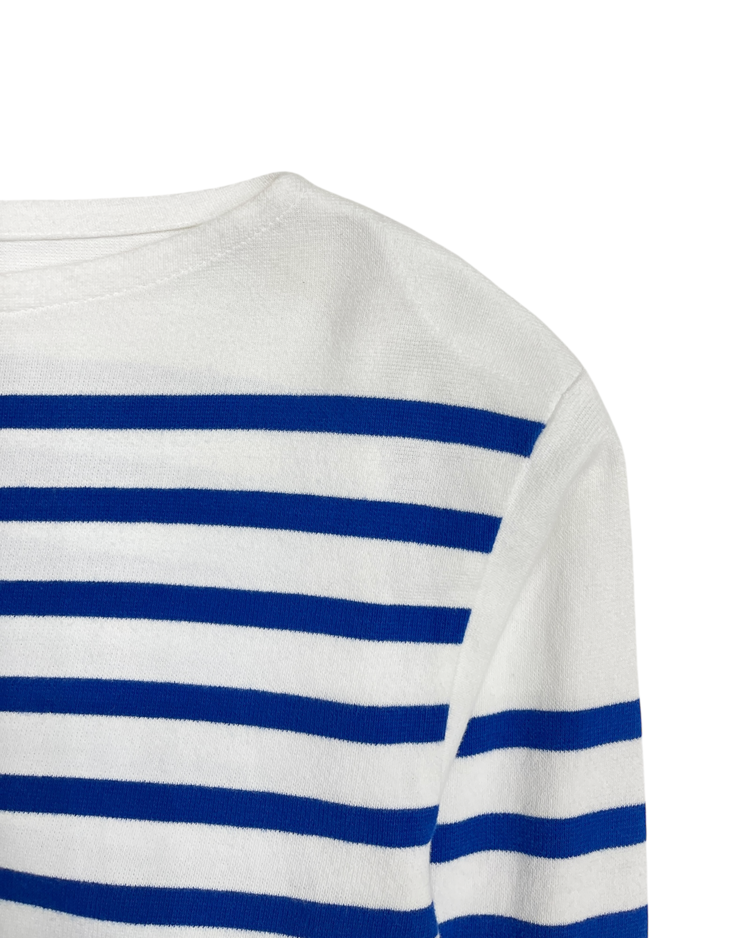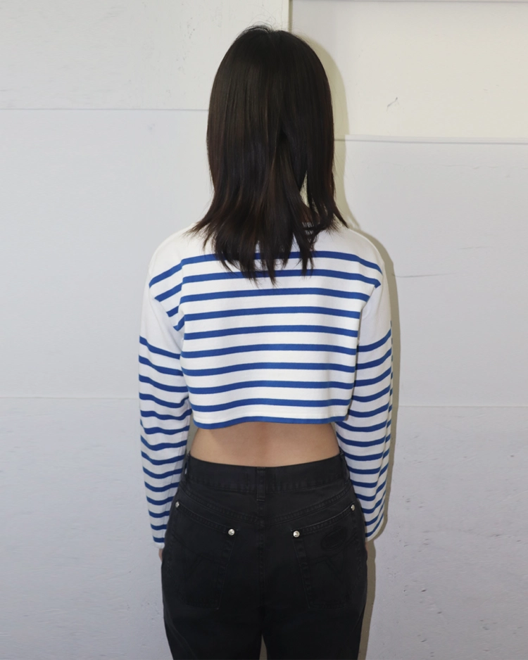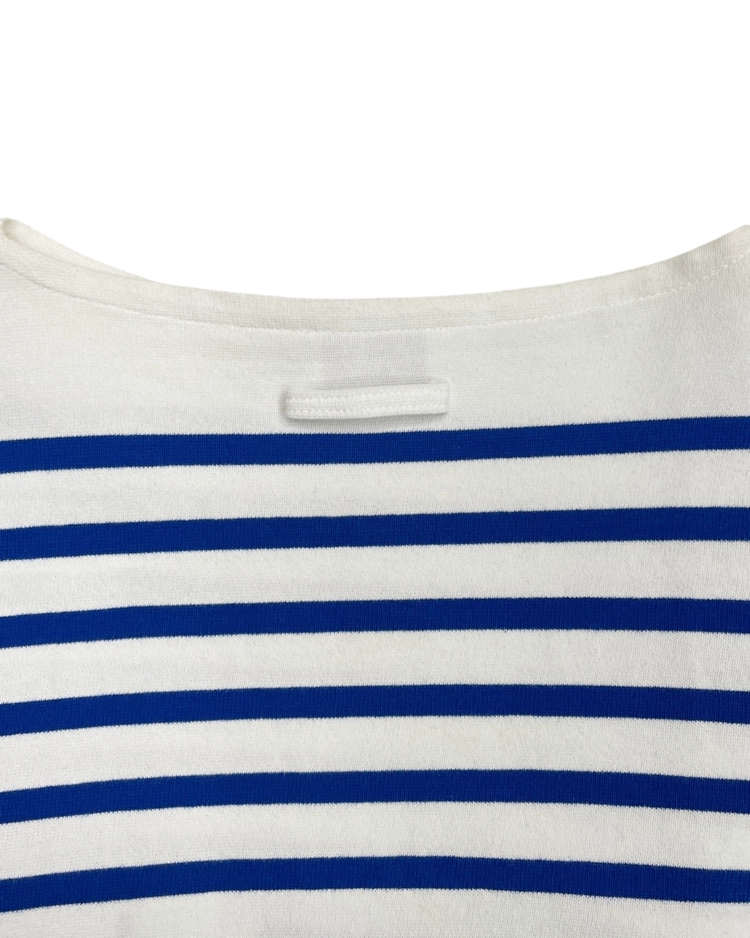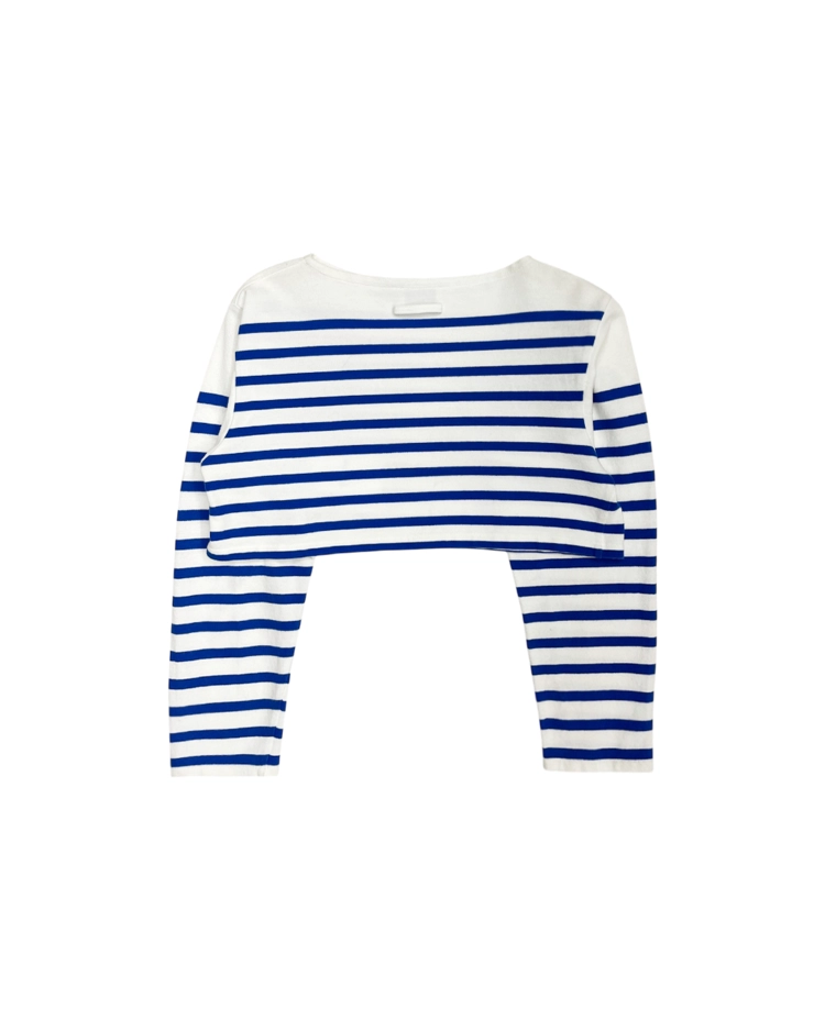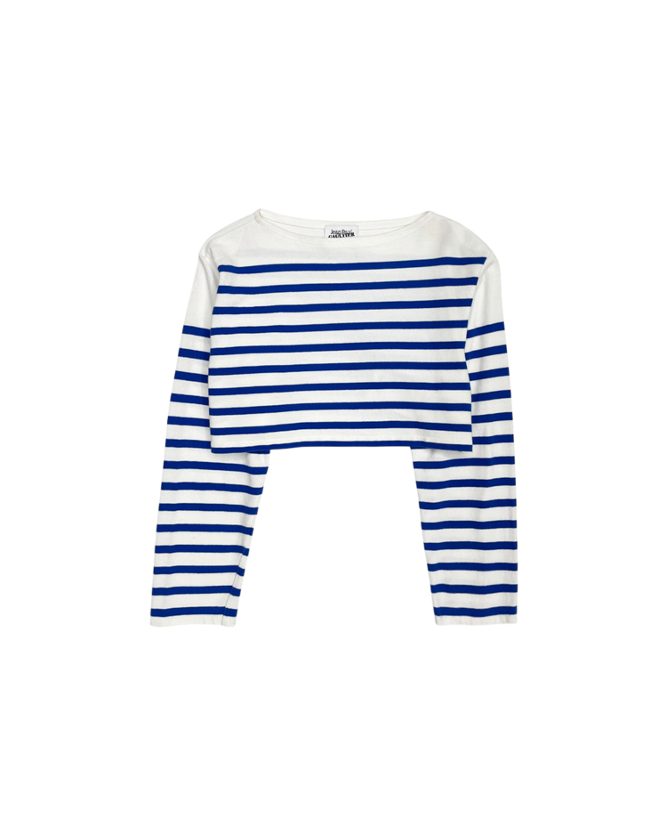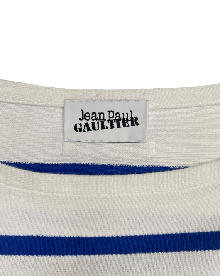 자연스러운 공식을 무너뜨리고 새로운 발상으로 파격적인 컬렉션을 전개하여 패션계의 악동으로 불리는 장 폴 고티에의 제품입니다. 허리가 과감하게 드러나는 컷아웃 구조가 독특한 실루엣을 만들어냅니다. 스트라이프 패턴과 긴 슬리브가 대비되며 구조적인 포인트를 강조하는 디자인입니다.