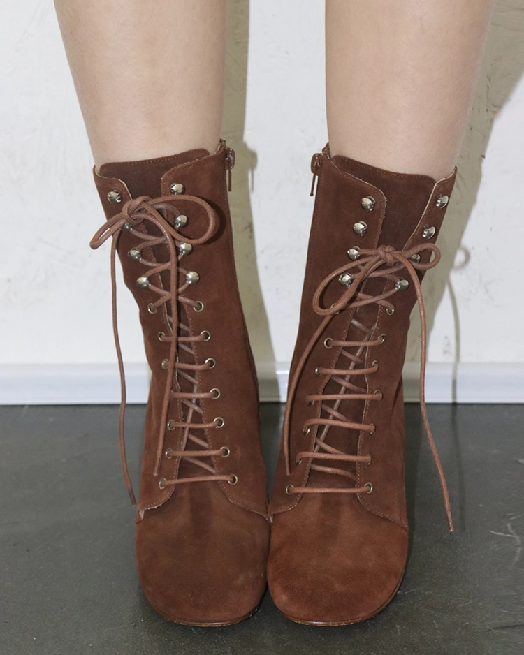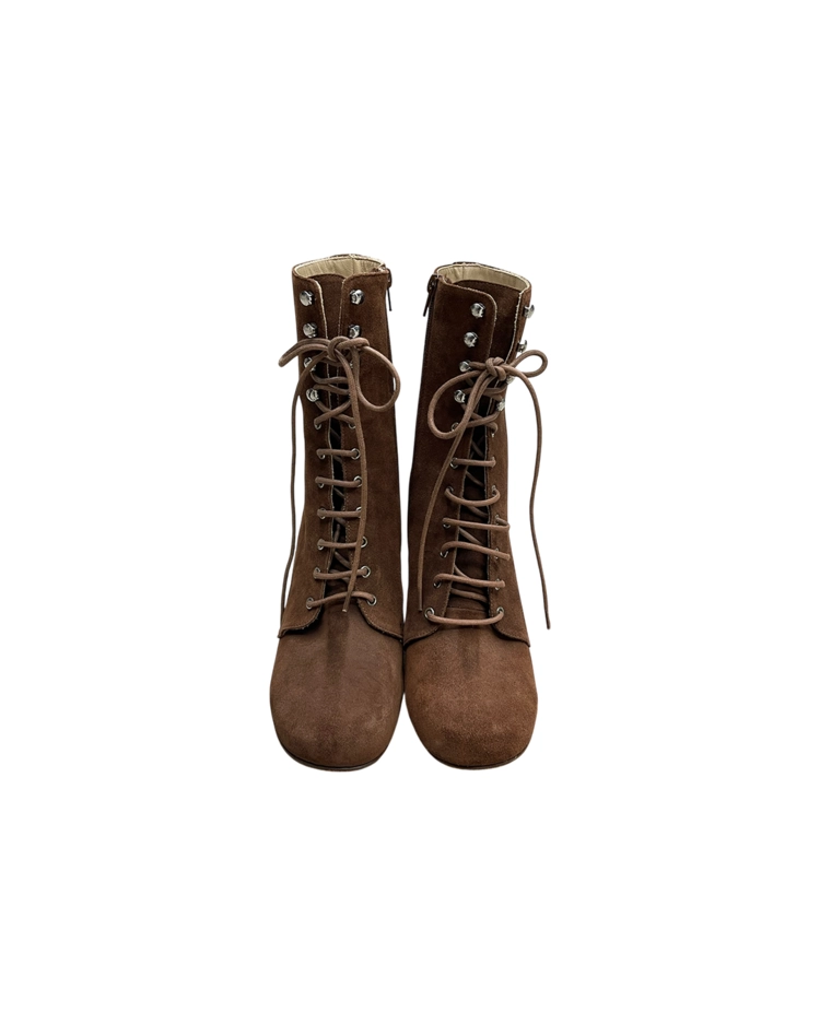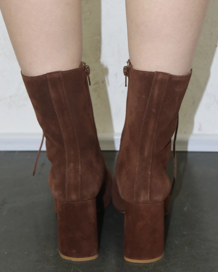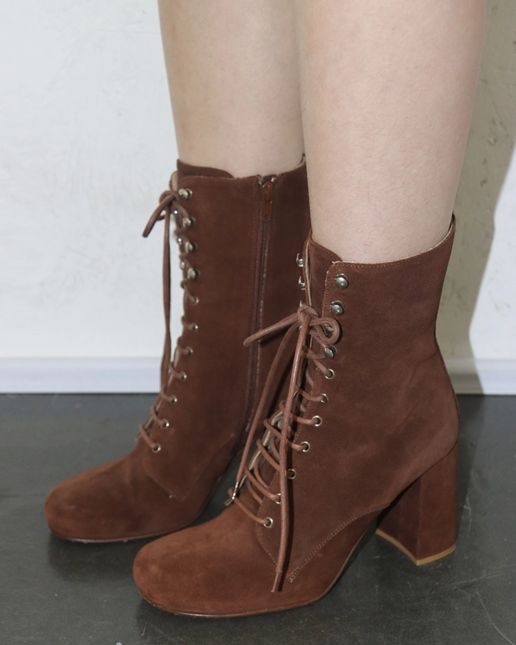 절제된 미니멀리즘과 1970년대풍 레트로 무드를 현대적으로 풀어내며, 과장되지 않은 실루엣 안에 소재의 질감과 여성적인 균형감을 섬세하게 담아내는 마리암 나시르 자데의 제품입니다. 전면 레이스업 디테일과 사이드 지퍼로 구성된 클래식한 부츠 형태이며, 부드러운 브라운 스웨이드 소재를 사용해 자연스러운 질감을 강조습니다. 넓적한 토 쉐입과 안정적인 블록 힐 구조가 매력적이며, 빈티지한 무드와 세련된 실루엣이 조화를 이룹니다.