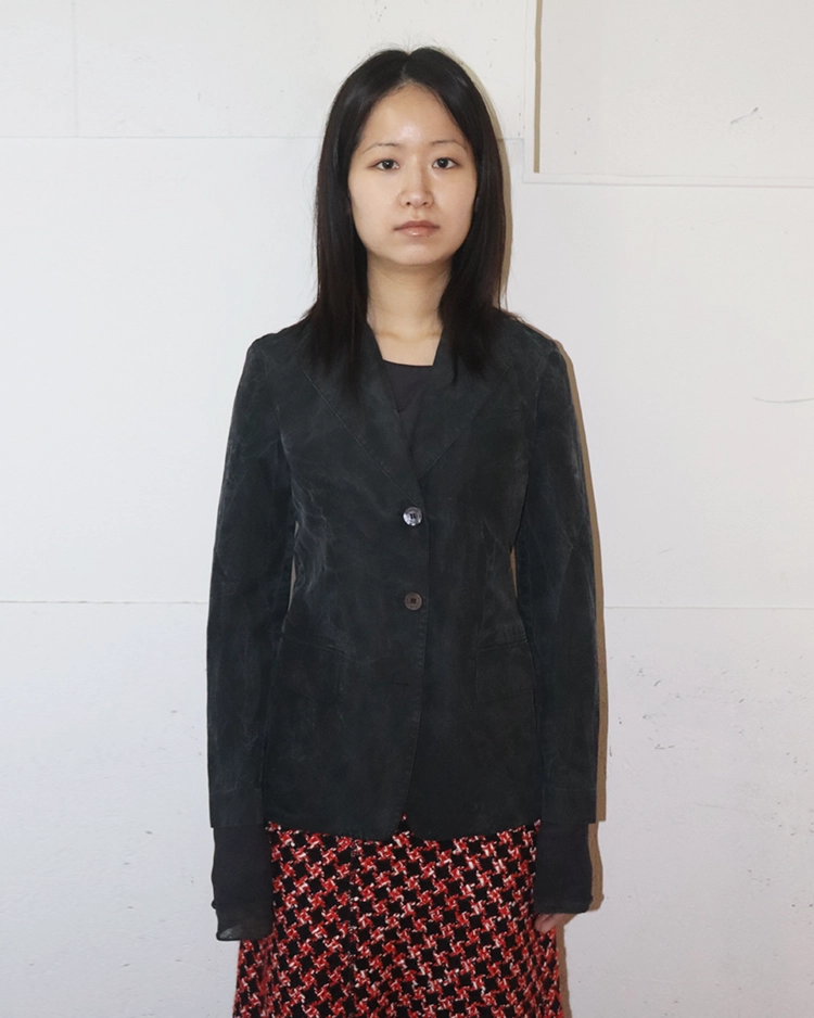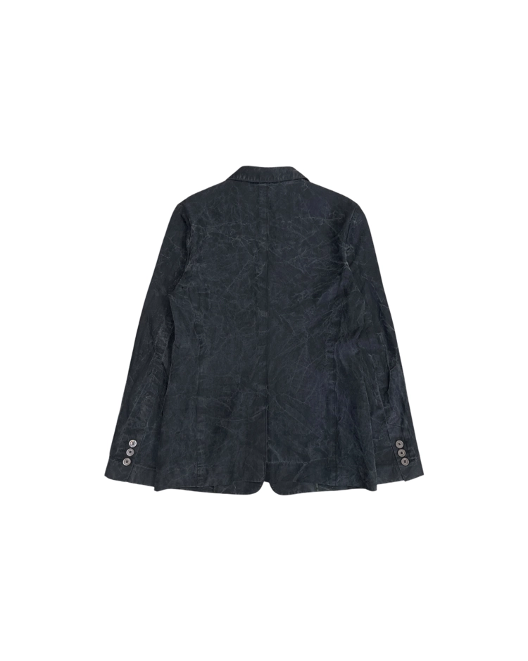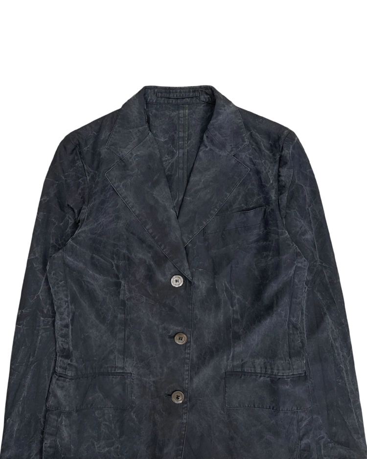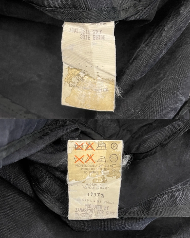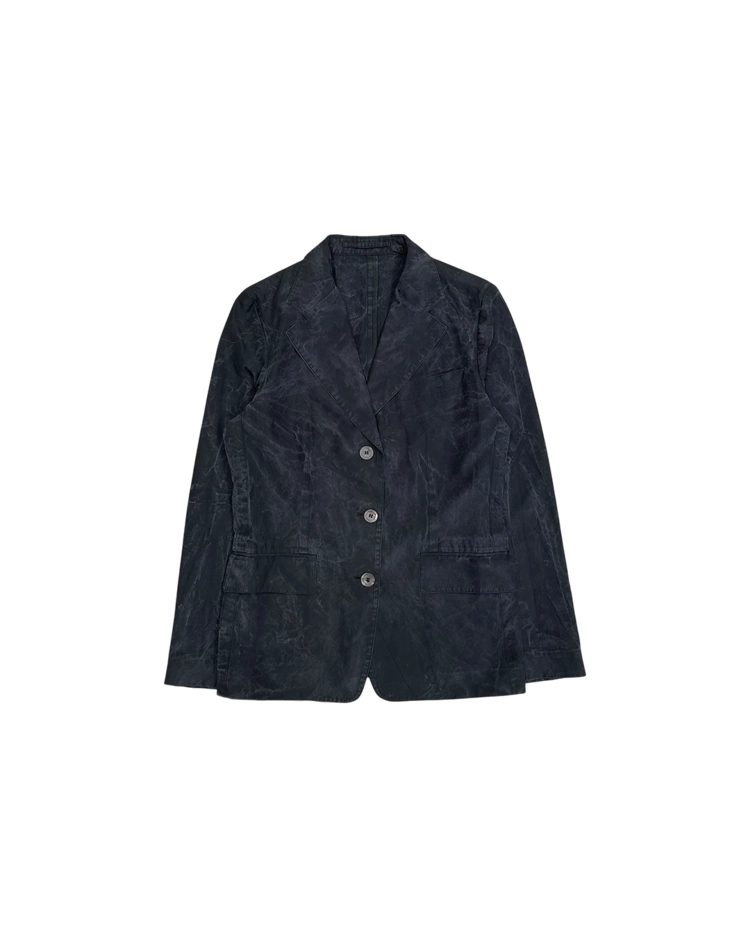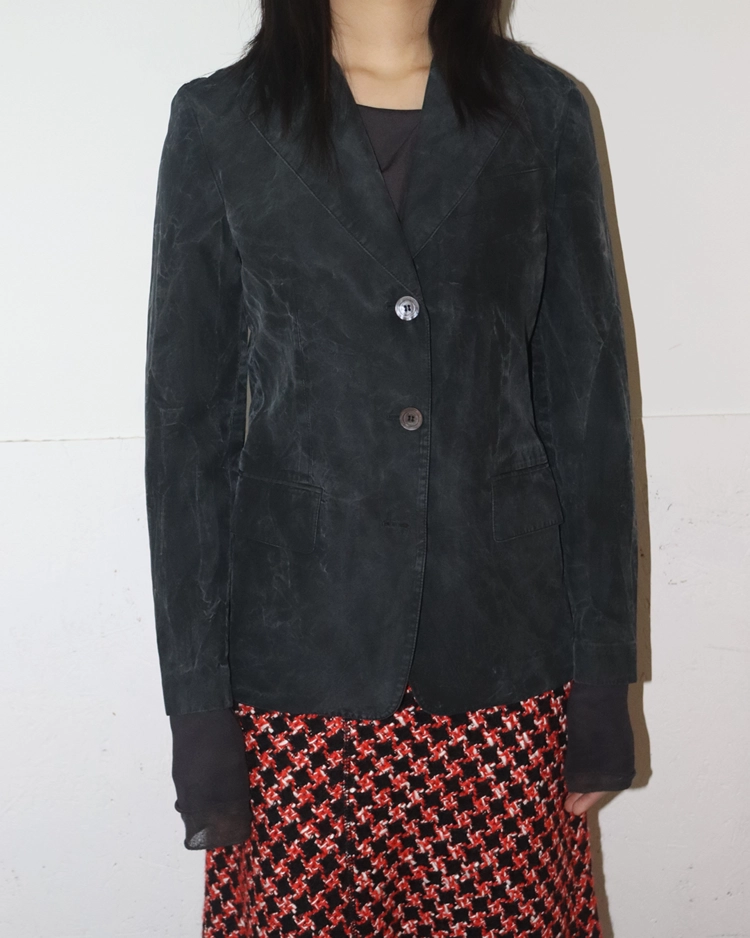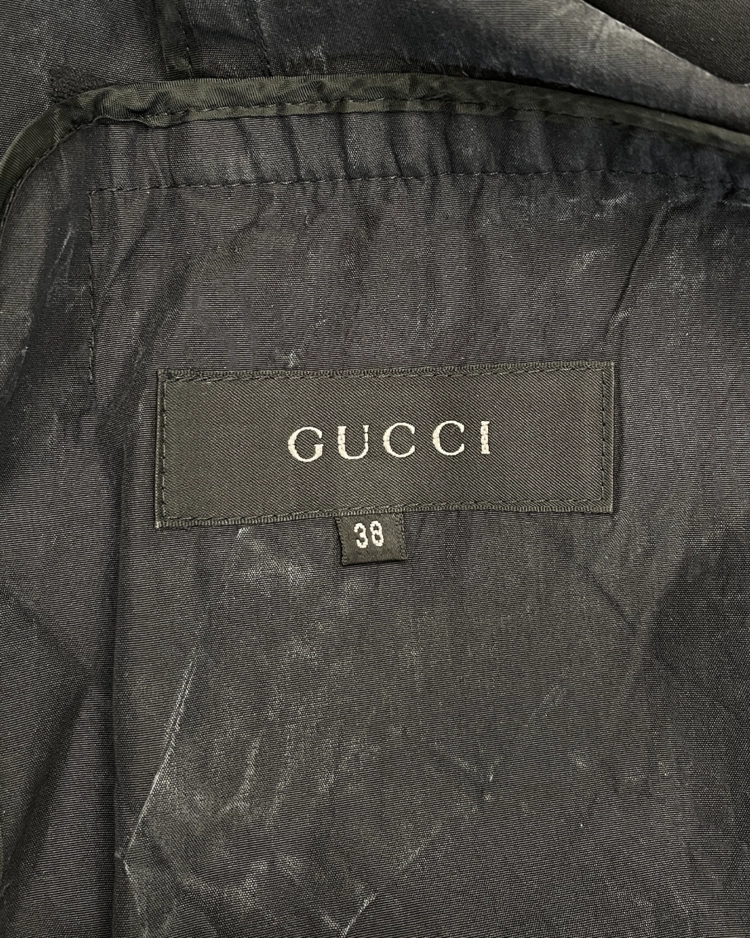 1990년대 중후반부터 2000년대 초반, 관능적이고 날카로운 테일러링과 절제된 섹시함을 기반으로 기존 구찌의 클래식 이미지를 현대적으로 재정의하며, 브랜드를 완전히 부활시킨 톰 포드기 구찌의 제품입니다. 실크 블렌드 소재에 워싱 가공을 더해, 크랙이 간 듯한 독특한 표면 텍스처가 매력적인 피스입니다. 간결한 쓰리 버튼 구조로 클래식한 균형을 유지하면서도, 슬림하게 떨어지는 실루엣과 질감으로 관능적이고 세련된 무드를 완성시켰습니다.