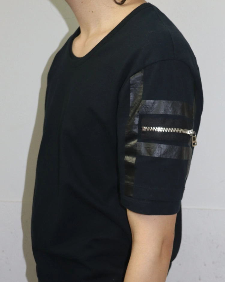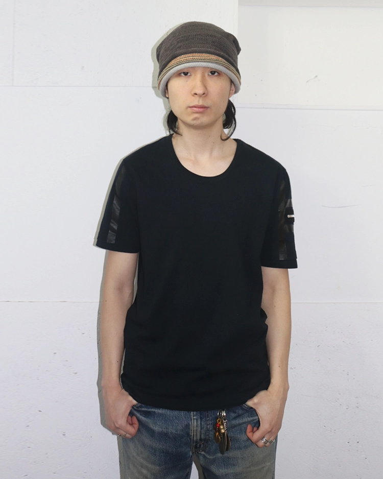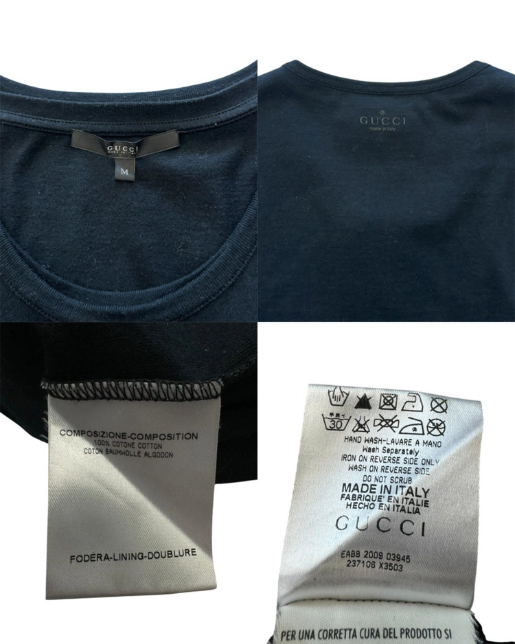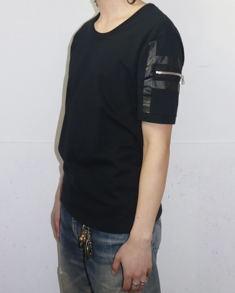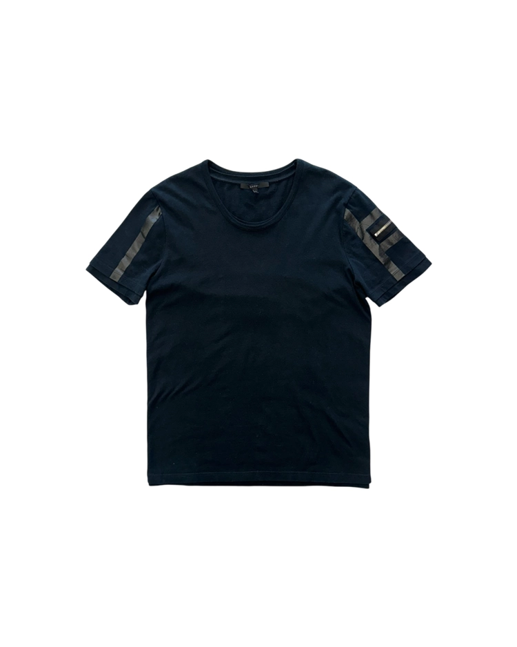 과한 로고 노출을 지양하고 레더, 테일러링, 깔끔한 라인과 구조적인 디테일을 통해 절제된 관능을 통해 웨어러블한 럭셔리로 브랜드를 재정비한 프리다 지아니니 시기의 구찌 제품입니다. 2010S/S 시즌의 더블 레이어드 티셔츠로, 블랙 바디에 슬리브 라인을 따라 흐르는 테이프 디테일과 지퍼 포켓을 더해 단순한 티셔츠 위에 구조적인 포인트를 만들었으며, 레이어드 구조와 자연스럽게 떨어지는 실루엣으로 절제된 캐주얼 무드를 보여줍니다.